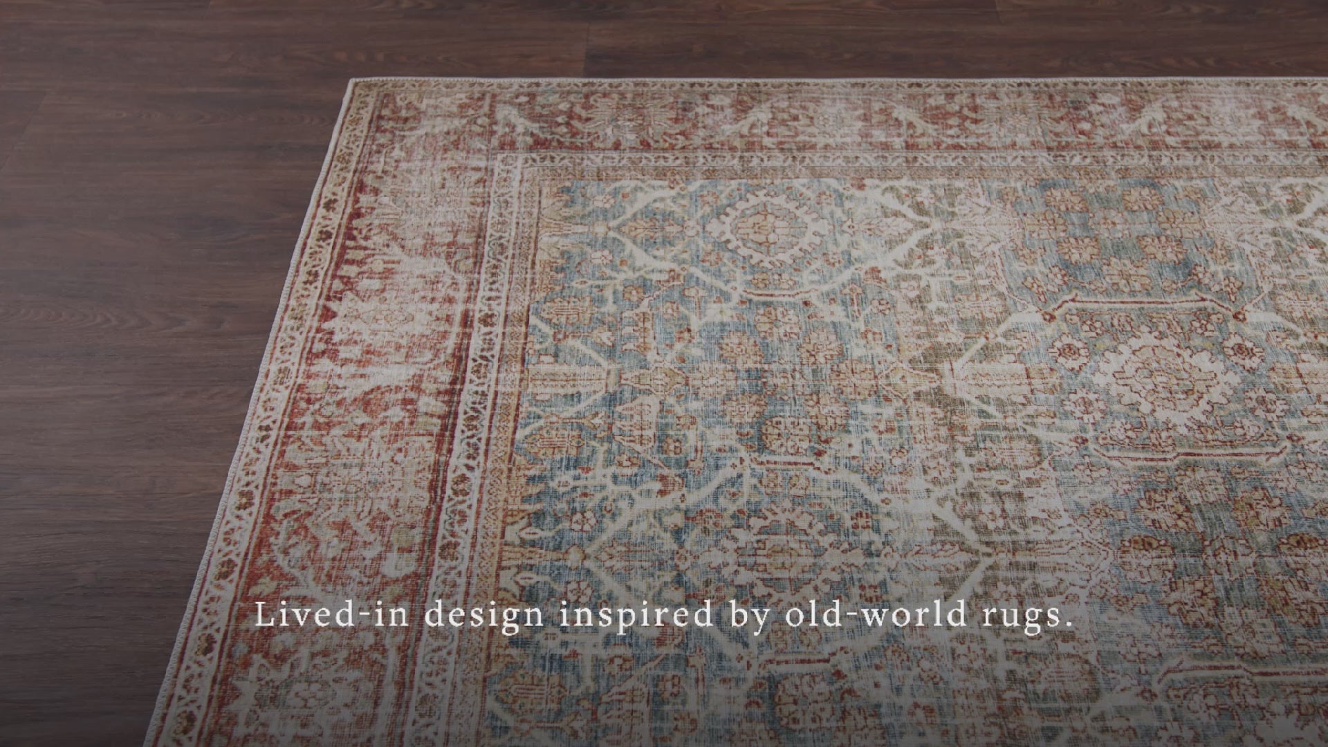 Our Hutchinson Polyester Face Rug in Lake / Terracotta highlights a sophisticated palette of light blue and earthy red, with off-white and beige accents for a subtle patina finish. Its floral-inspired design unfolds across a field of lattice-like botanical motifs and geometric patterns, framed by ornate borders and a distressed pattern that captures the lived-in beauty of a heritage weave. Soft yet highly durable, this 100% polyester material resists fading, retains shape, and dries quickly, offering lasting performance and affordable elegance for both indoor and outdoor spaces.