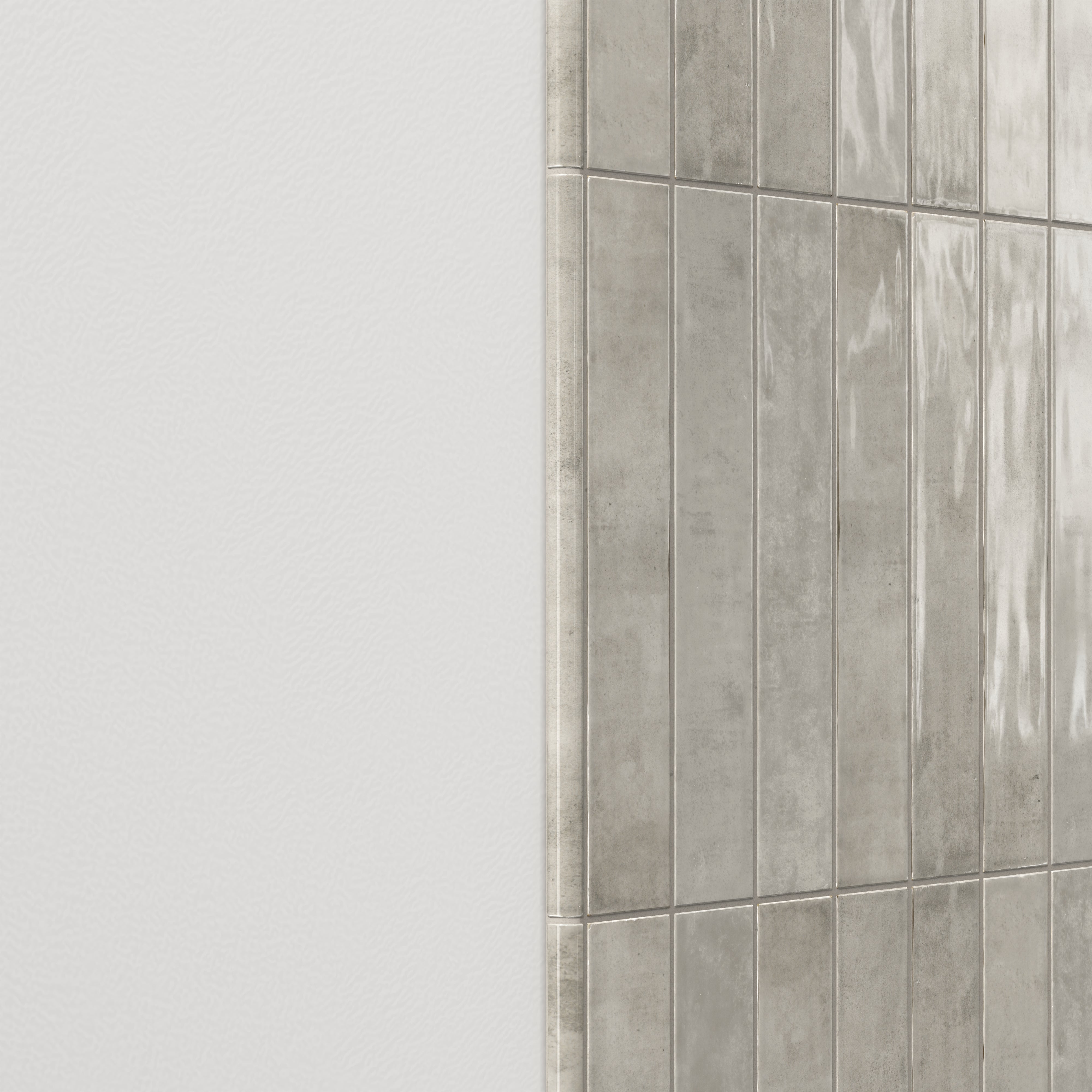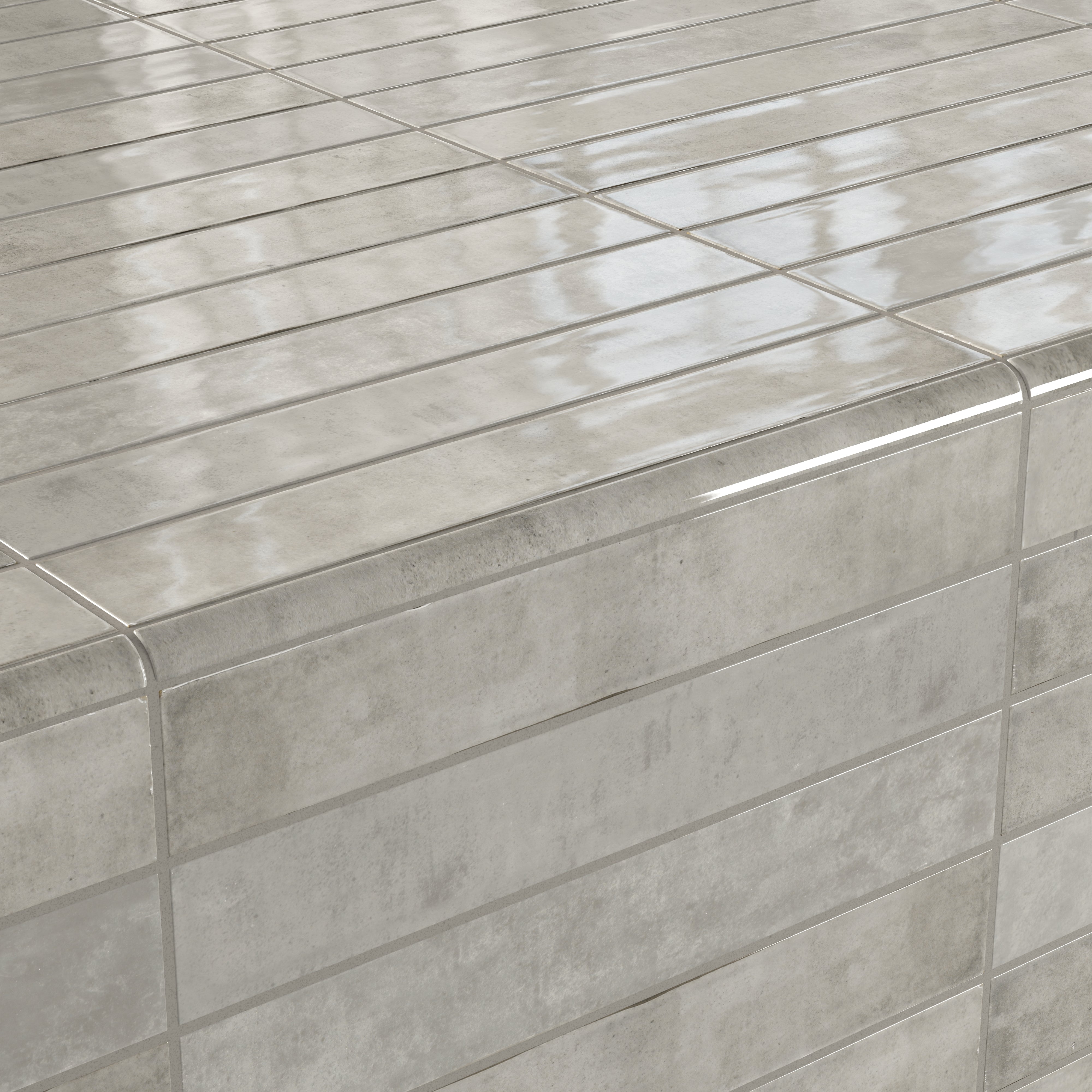 Our Jaden 0.75x16 Glossy Ceramic Bullnose Tile in Dove features the same subtle grey shade that seems to shift in light. Its rounded edge refines wall perimeters and outside corners with a smooth, continuous contour that enhances the field tile’s modern industrial charm.