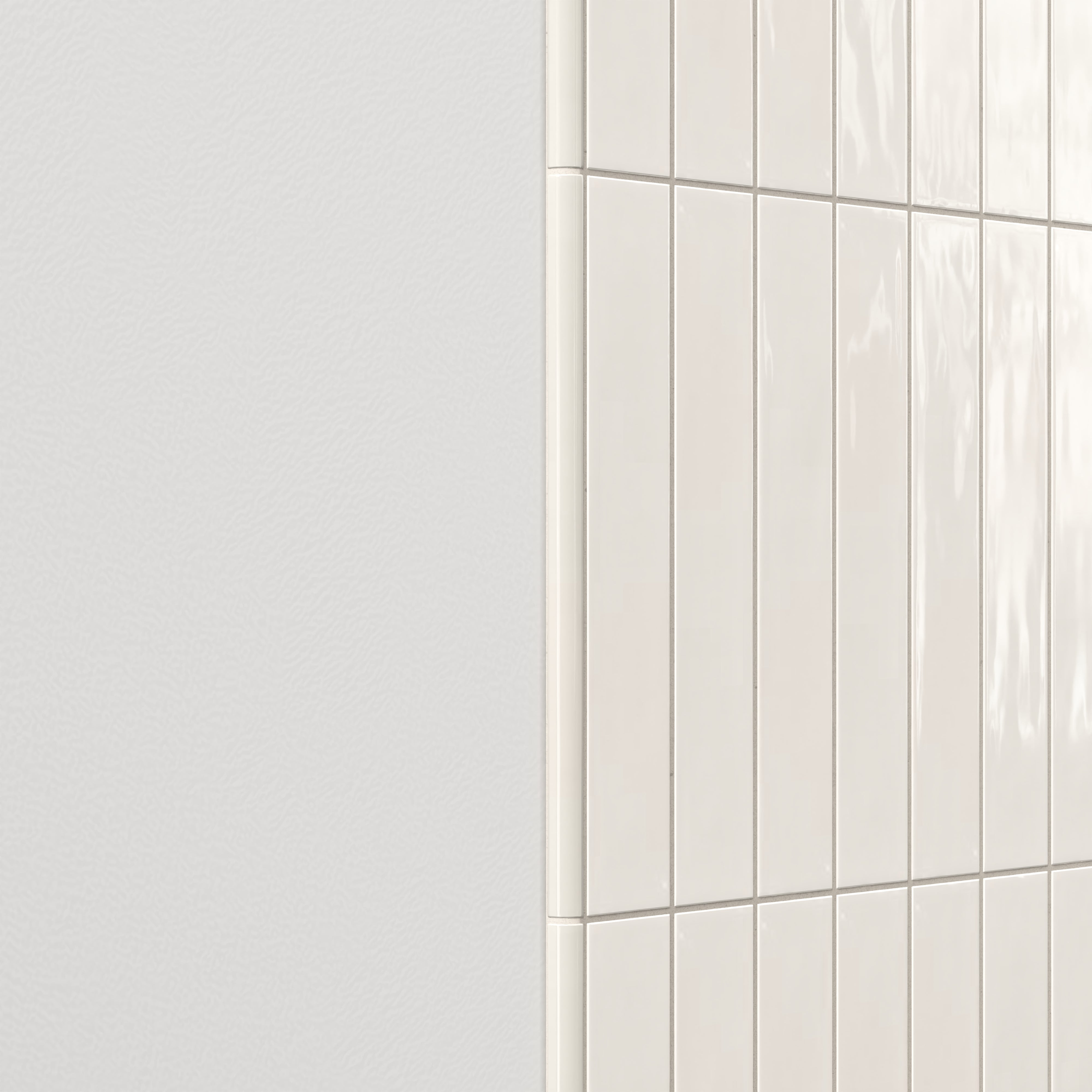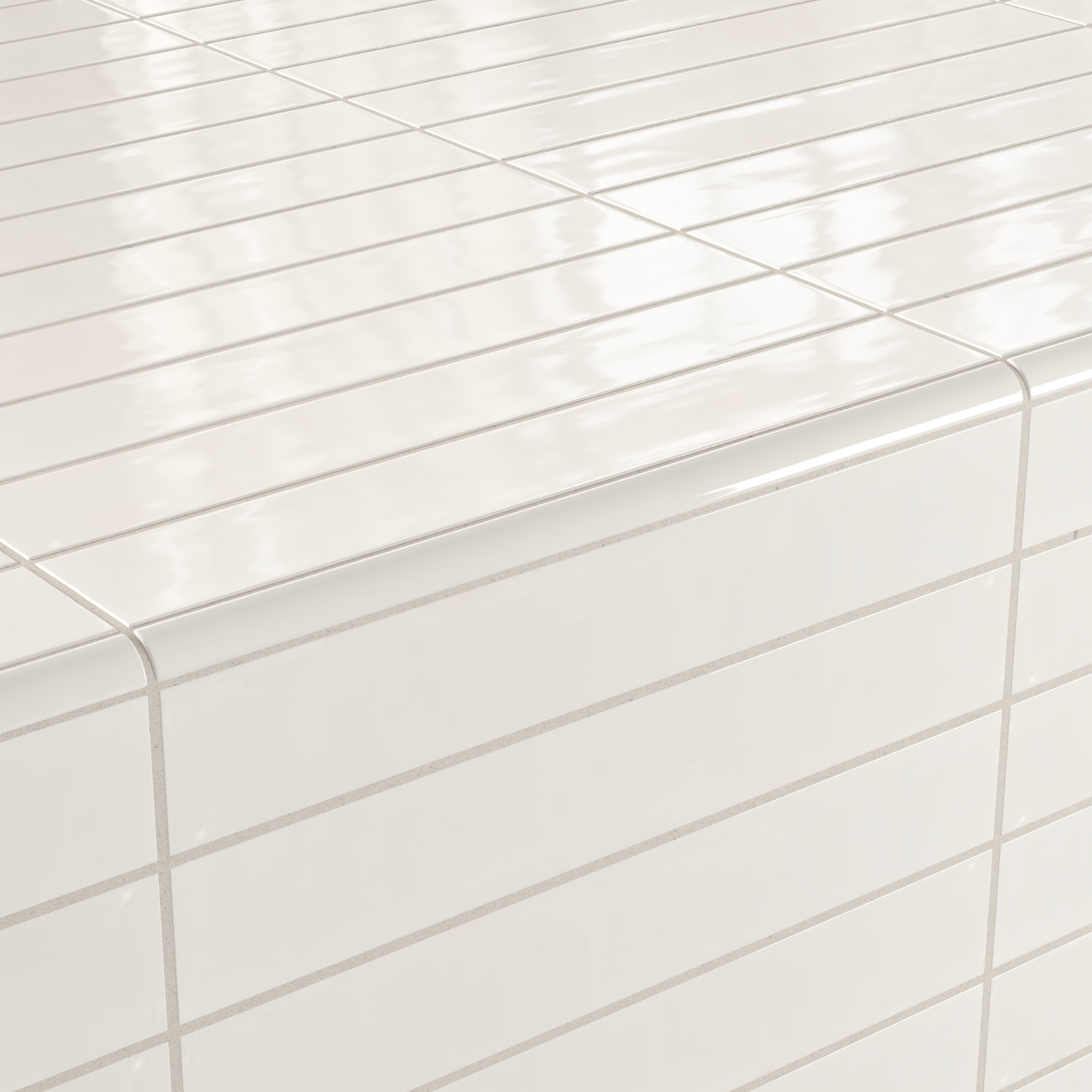 Our Jaden 0.75x16 Glossy Ceramic Bullnose Tile in Eggshell features the same airy white shade that seems to shift in light. Its rounded edge refines wall perimeters and outside corners with a smooth, continuous contour that enhances the field tile’s modern industrial charm.