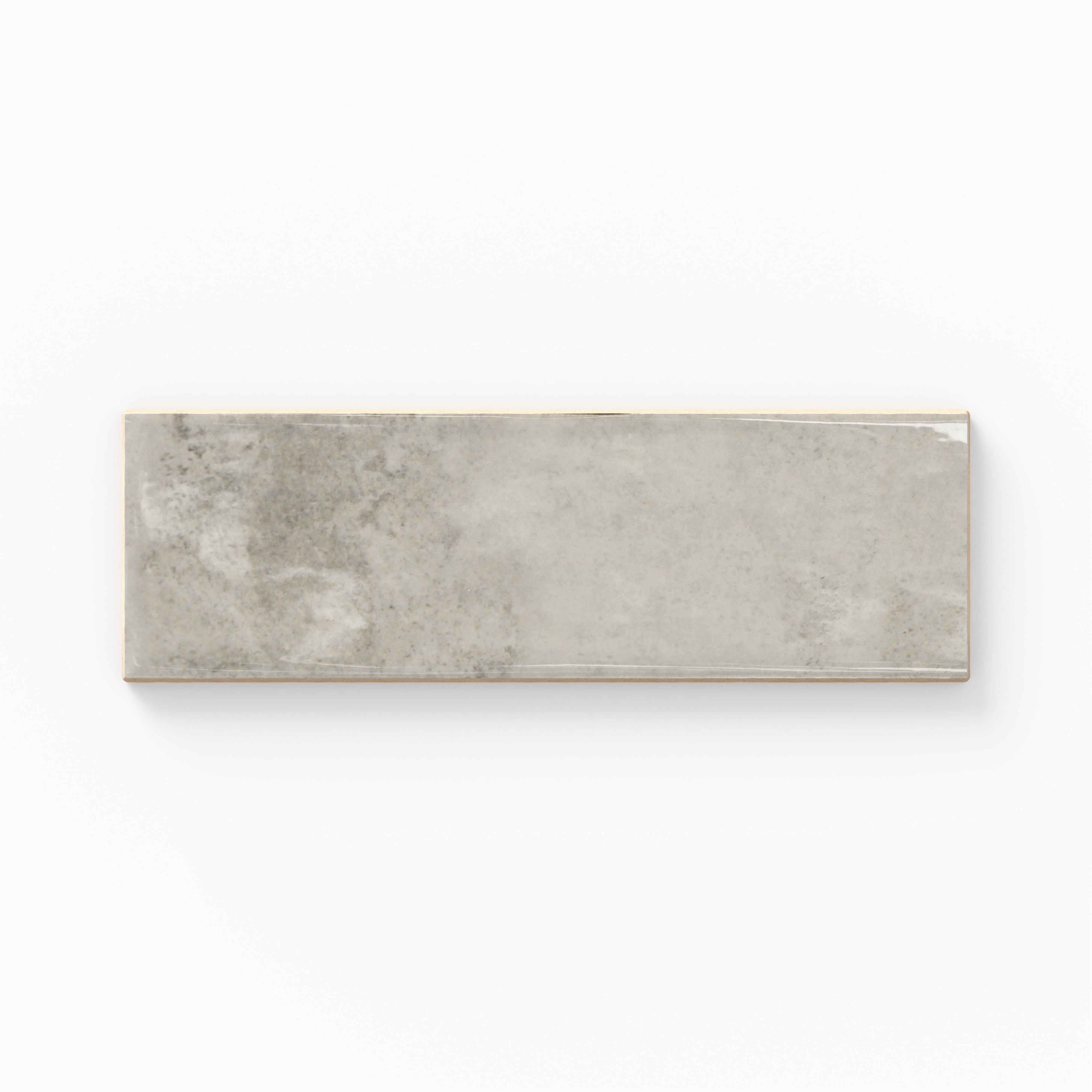 A sample of our Jaden 2.5x16 Glossy Ceramic Tile in Dove, it features a subtle, grey shade that seems to shift in light, showing off an industrial chic style with its distinctive print.