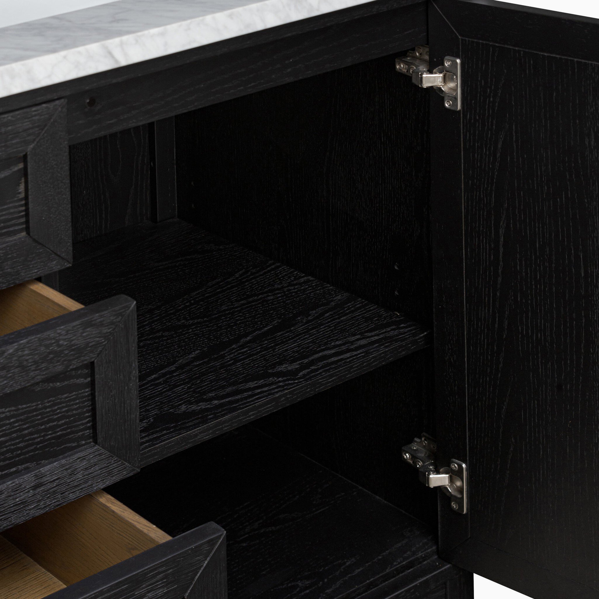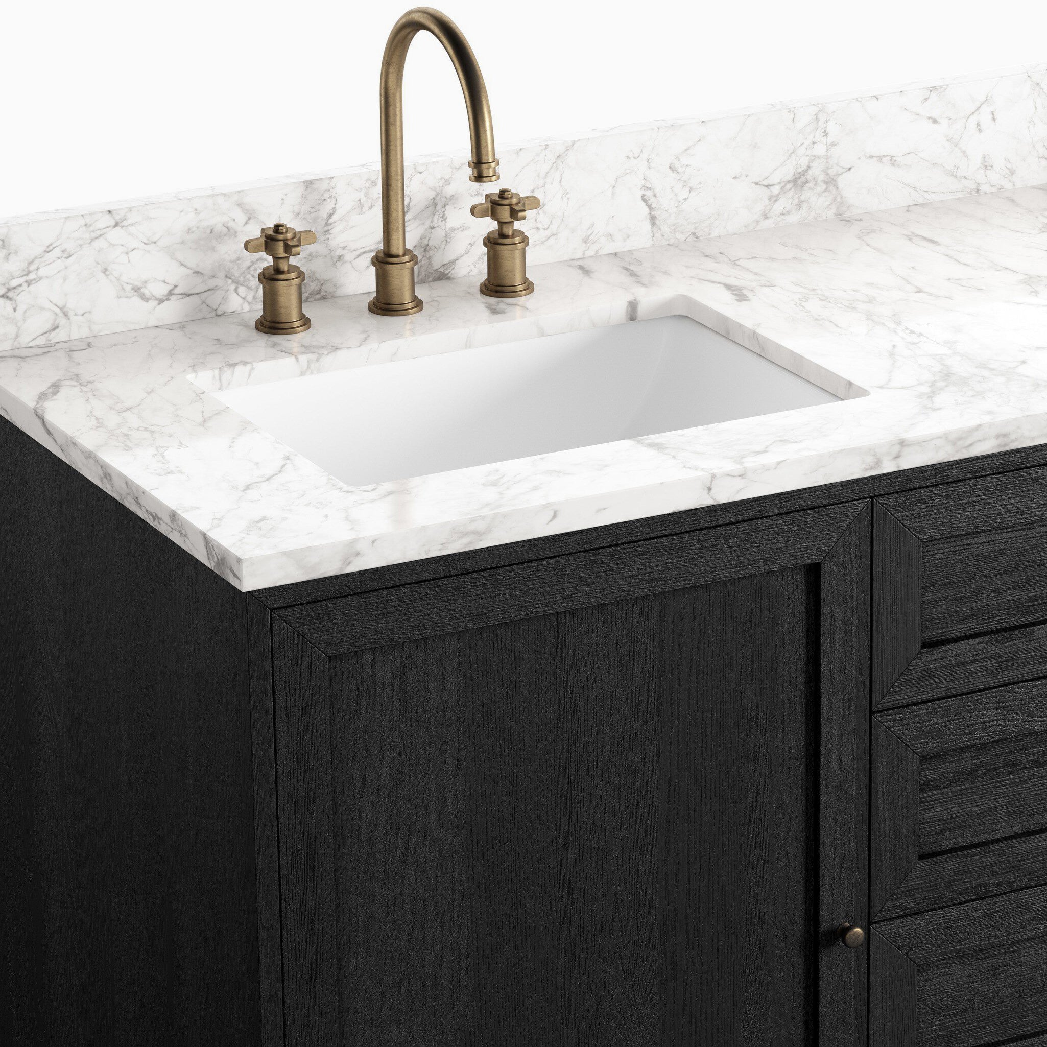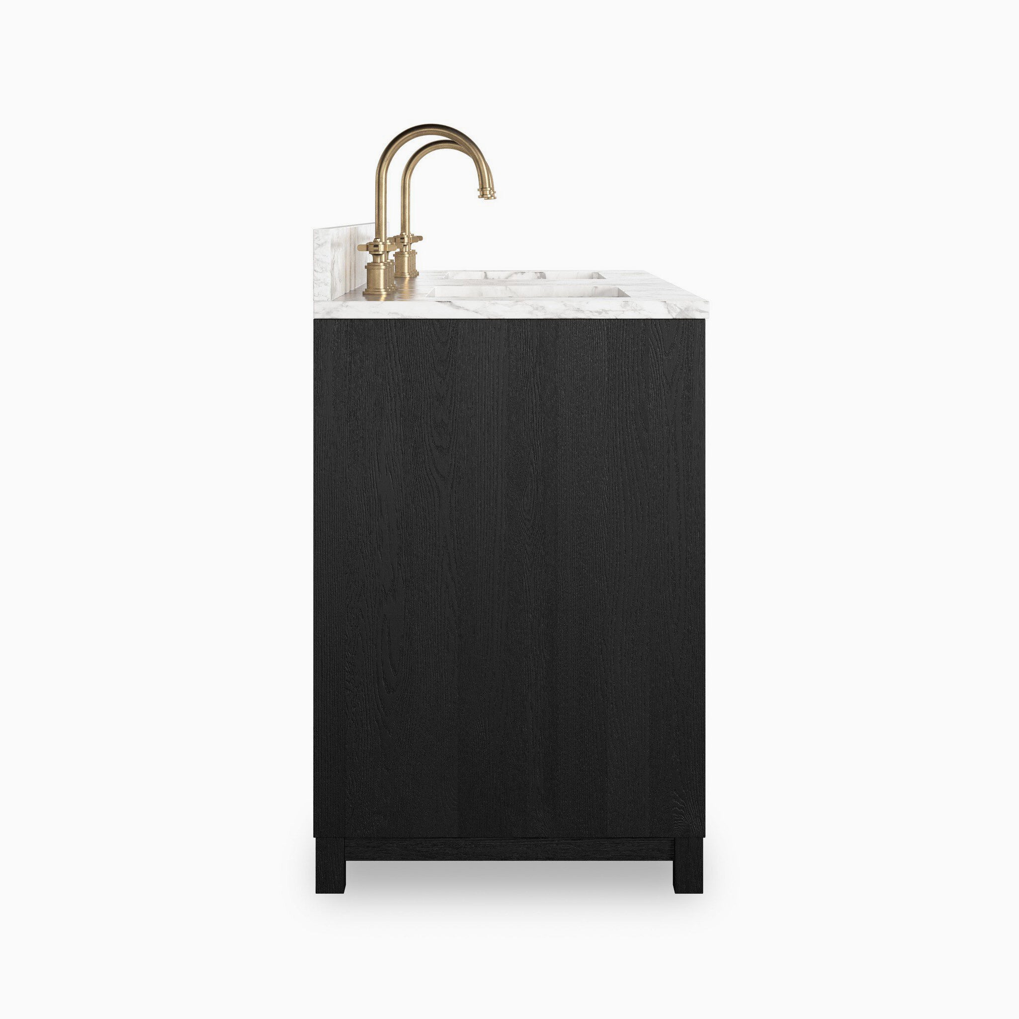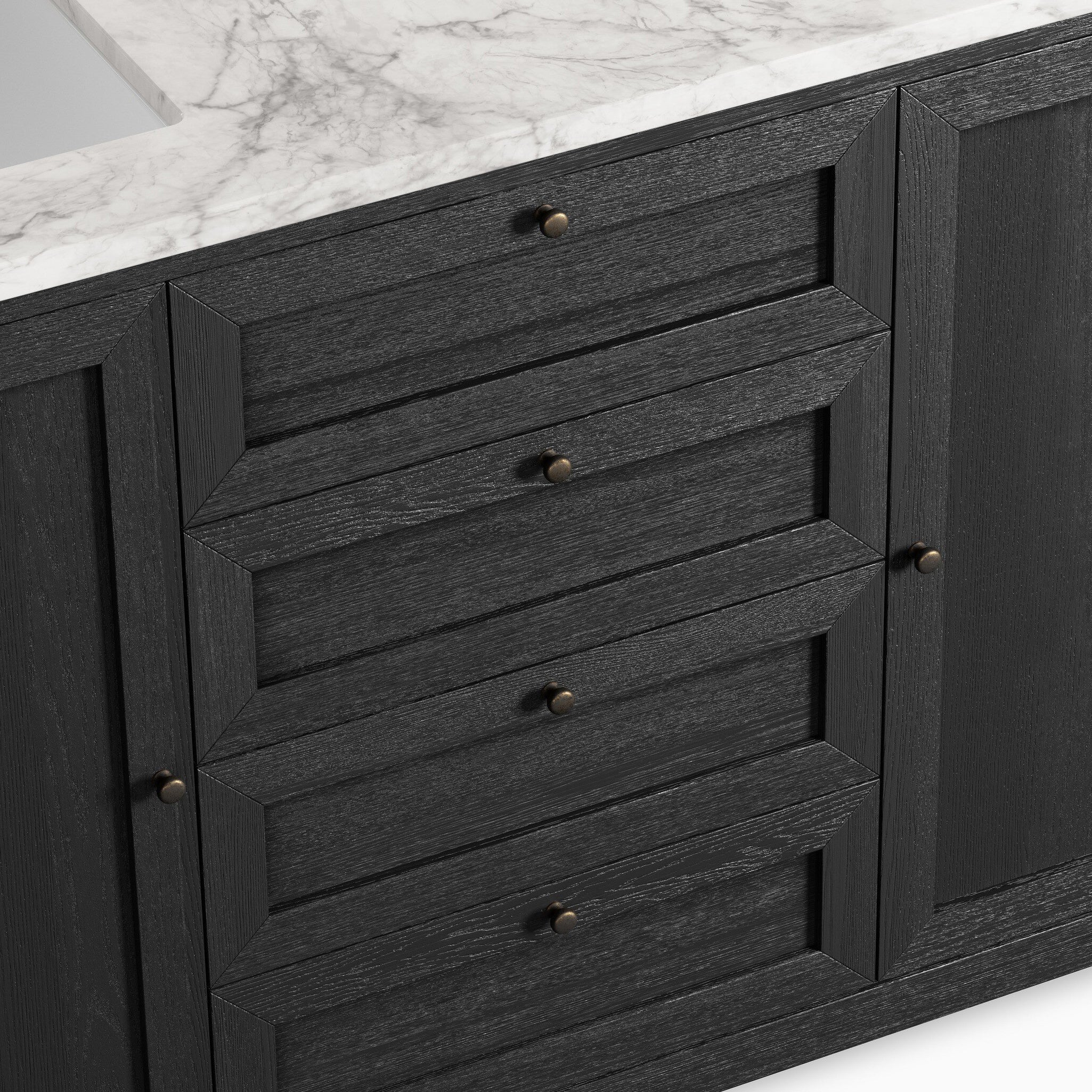 A design-forward minimalist piece, our Josephine 60" Single Vanity in Satin Drifted Black Veneer with Carrara Marble Top is framed in thick oak veneers cast in a velvety dark finish, with its panel-style doors opening to reveal a spacious storage with removable shelves. A stack of drawers at the center are also added for more room.