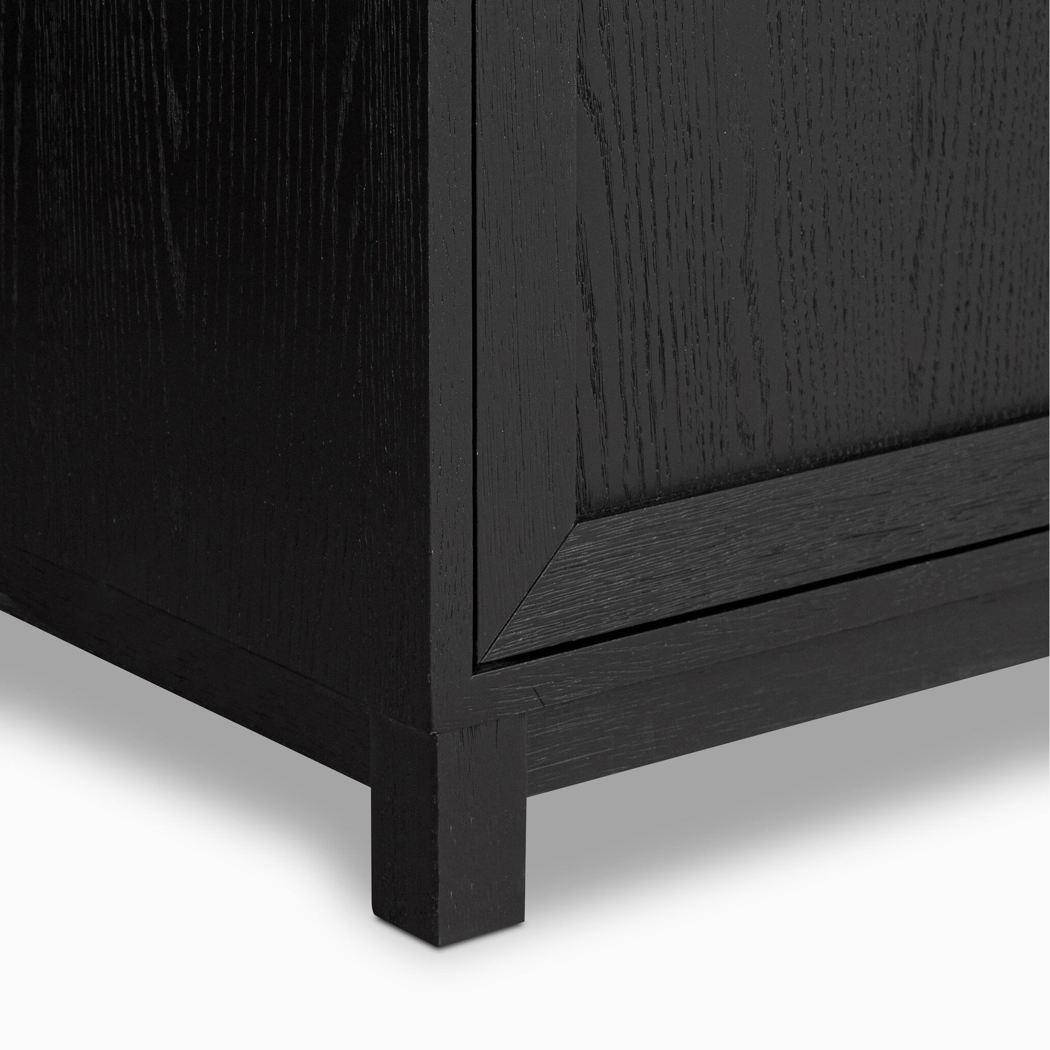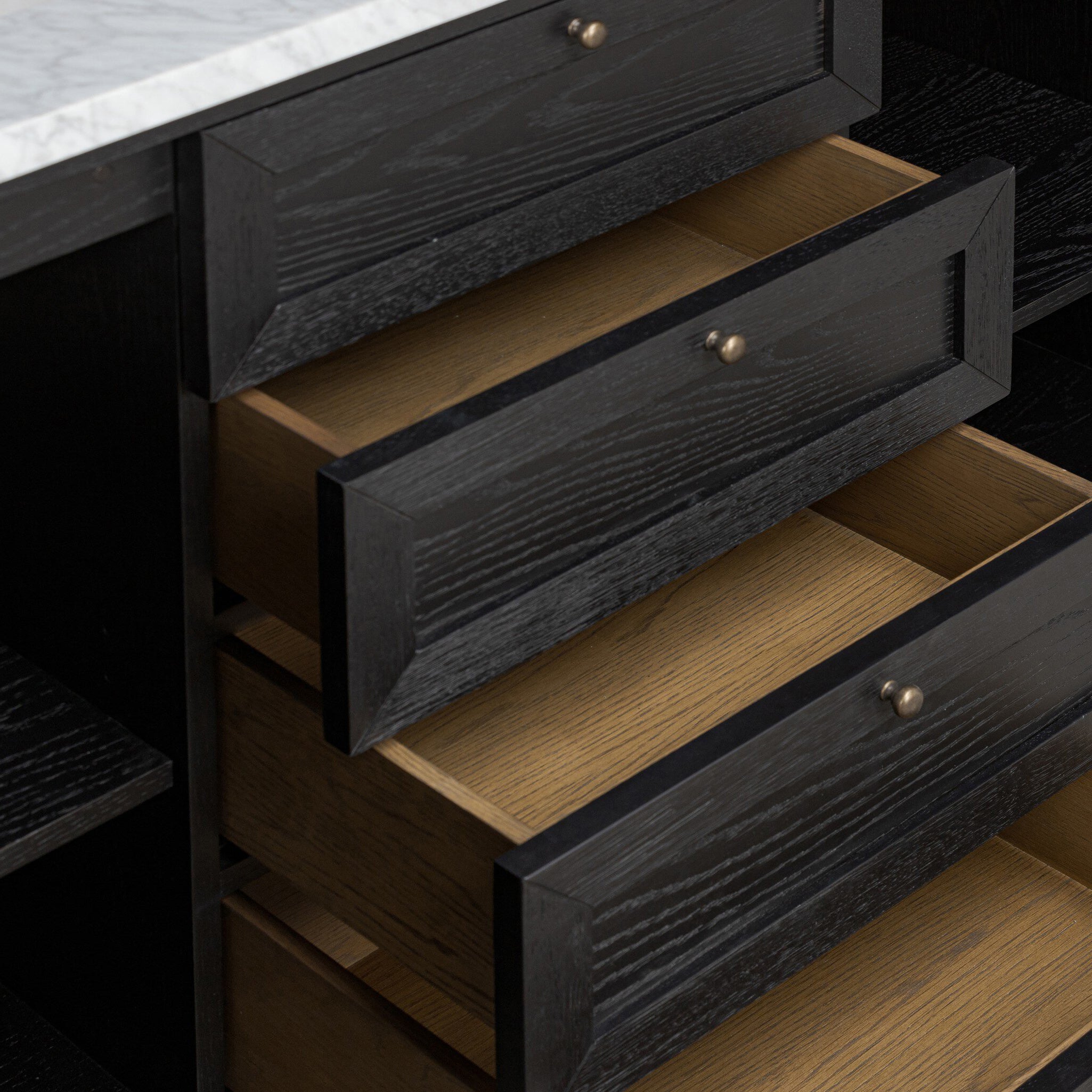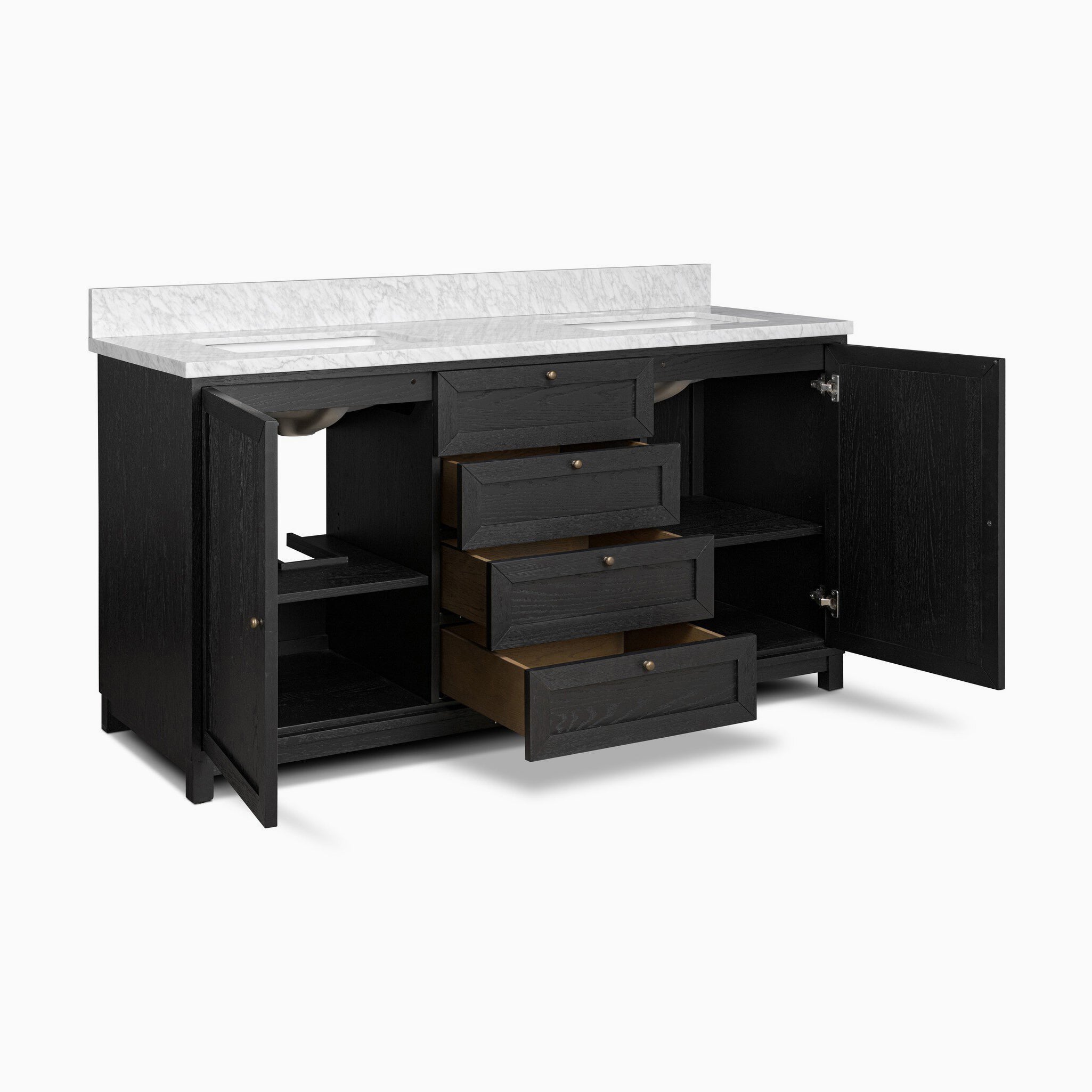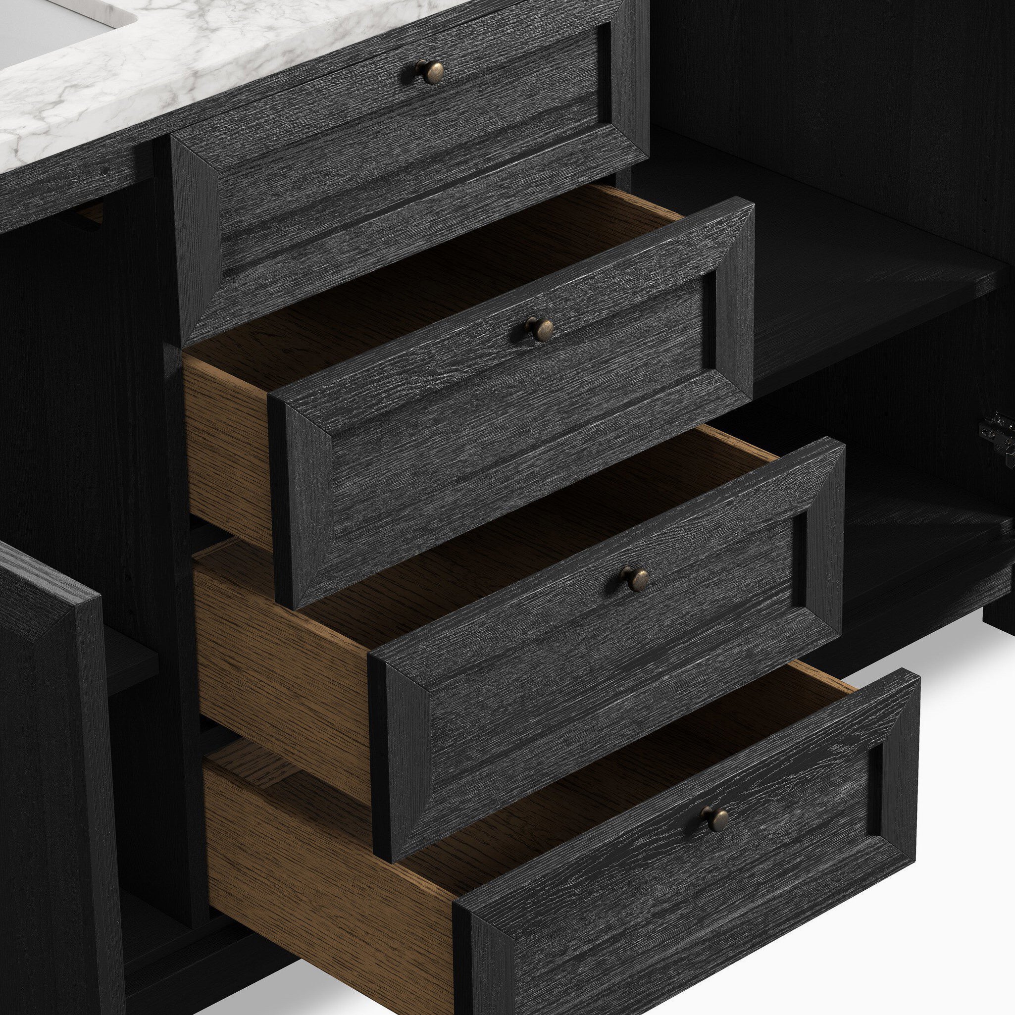 A design-forward minimalist piece, our Josephine 60" Single Vanity in Satin Drifted Black Veneer with Carrara Marble Top is framed in thick oak veneers cast in a velvety dark finish, with its panel-style doors opening to reveal a spacious storage with removable shelves. A stack of drawers at the center are also added for more room.