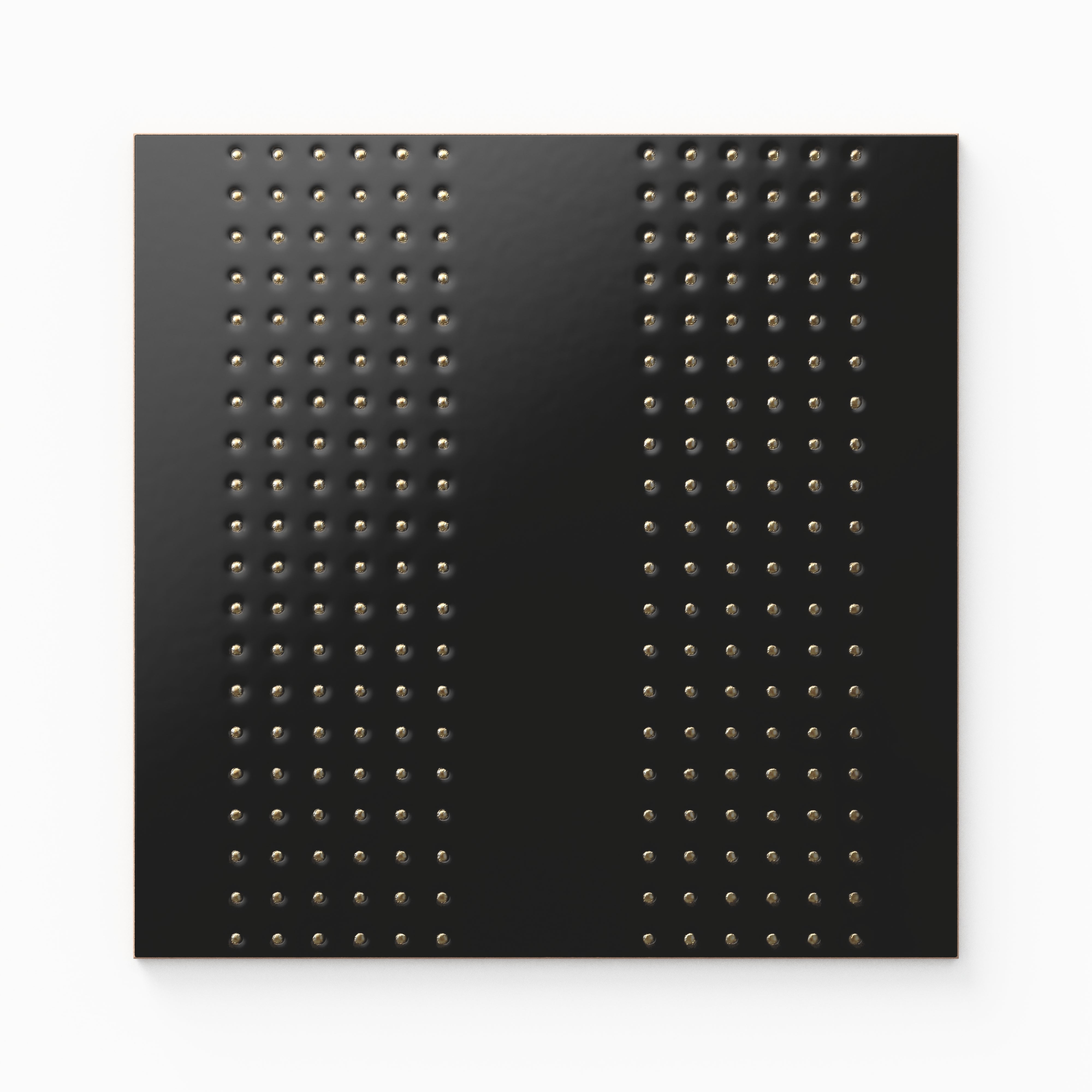 A sample of our Kira Satin 12x12 Ceramic Tile in Striped Dots Black, it features a velvety black surface highlighted by small, subtly raised gold dots. These delicate accents shimmer across each piece, giving it an artistic, sophisticated feel up close, while forming tufted vertical bands from afar.