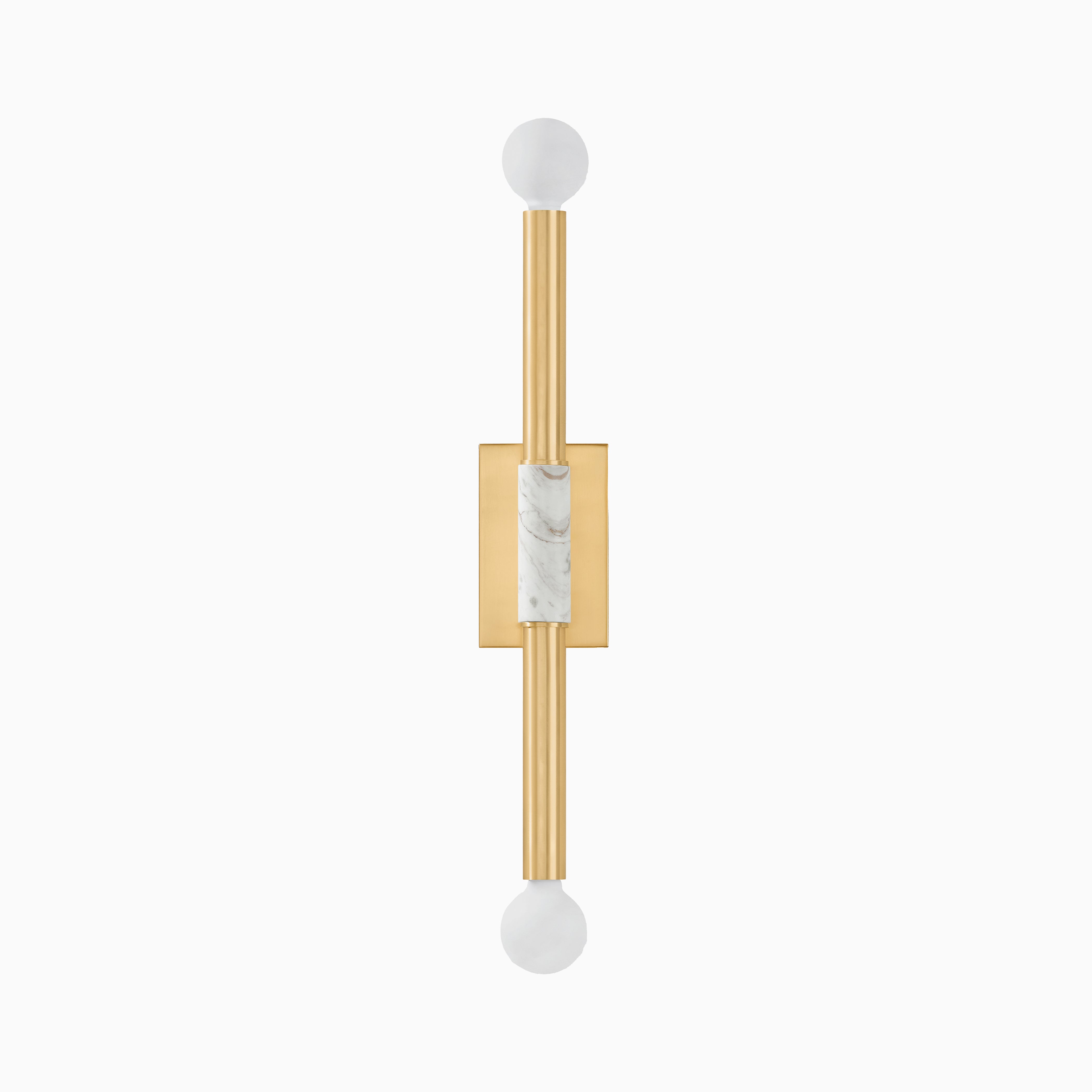 Our Larson Wall Sconce in Aged Brass is a celebration of simple forms and natural materials. Its vertical baton-like silhouette frames a slab of Honed Calacatta Gold Marble at the center, showcasing its unique veining through the soft glow of the glass orbs from both ends.