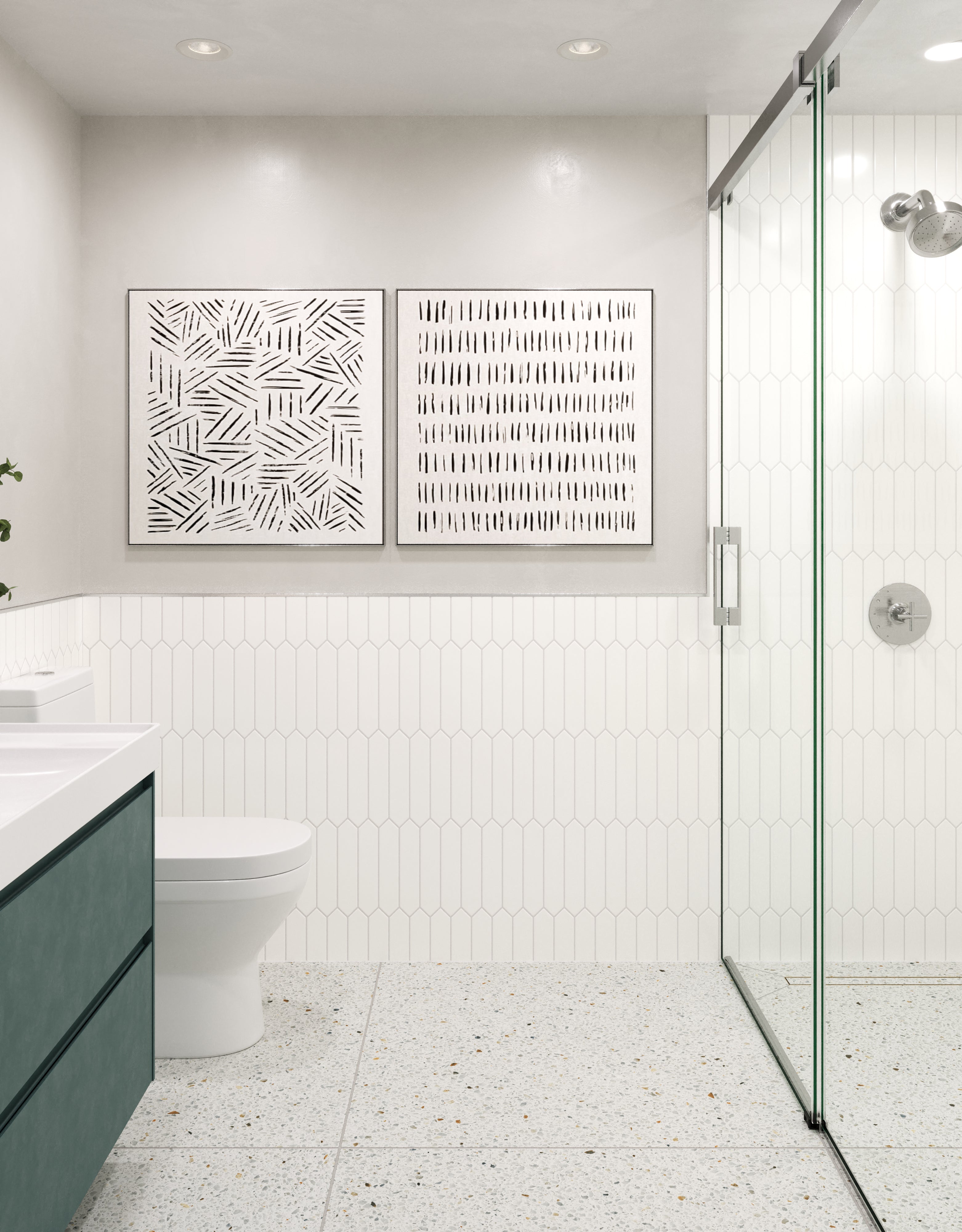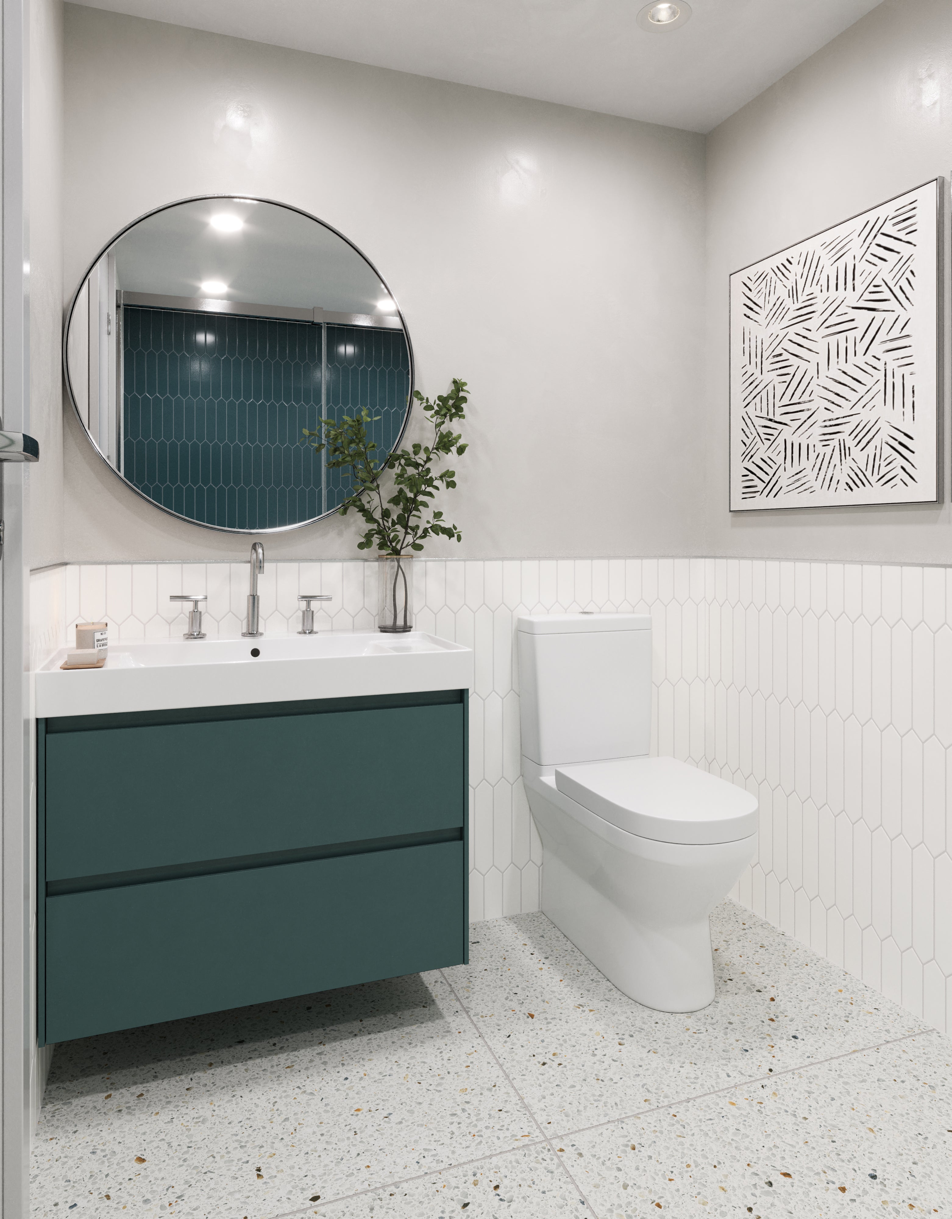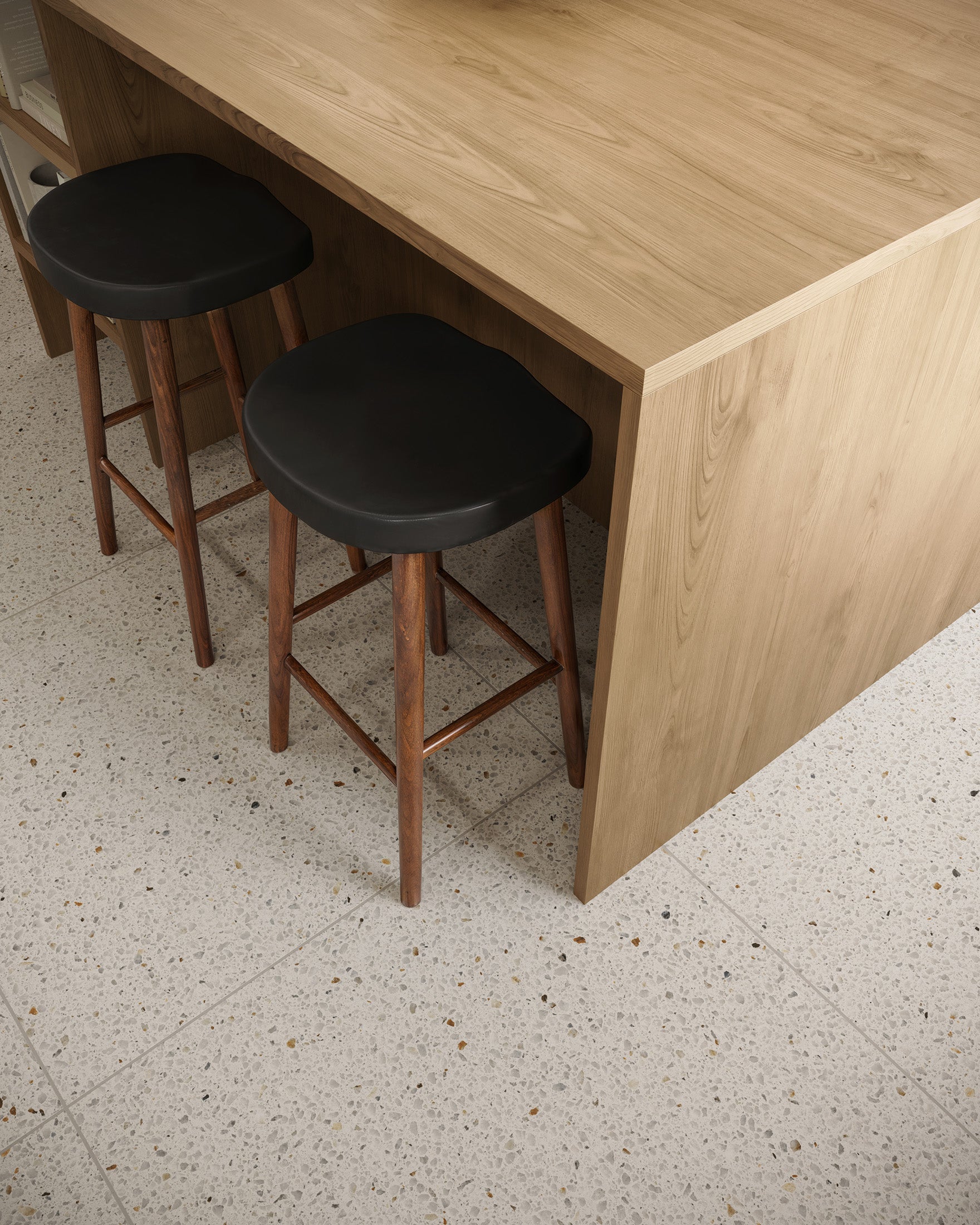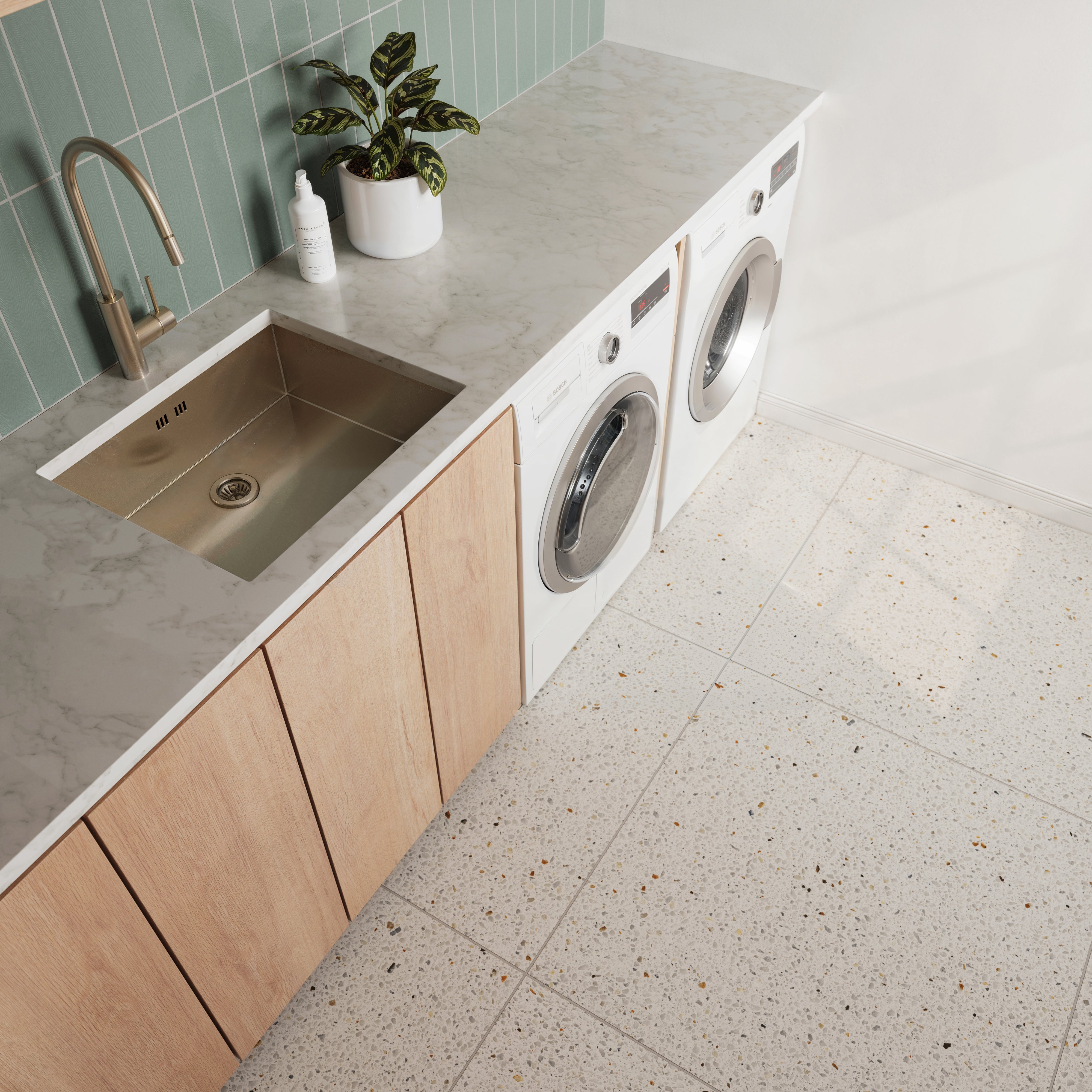 - Terrazzo look achieved through advanced printing technology