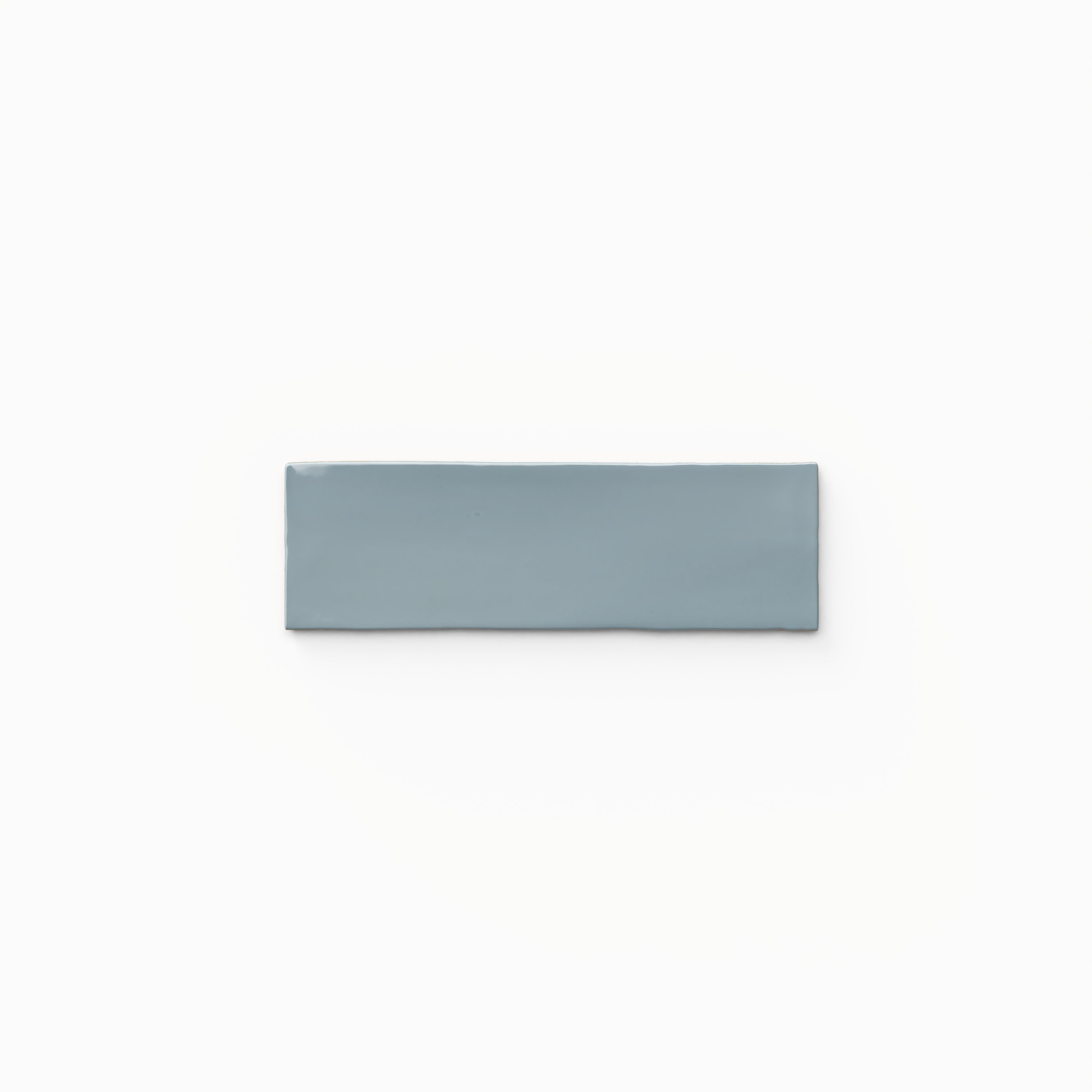 A sample of our Maisie 2.5x16 Glossy Ceramic Tile in Ocean, it features subtle shade shifts of pastel blue with a high-sheen glaze that creates a soft wash of light across its elongated, artisan-inspired surface.