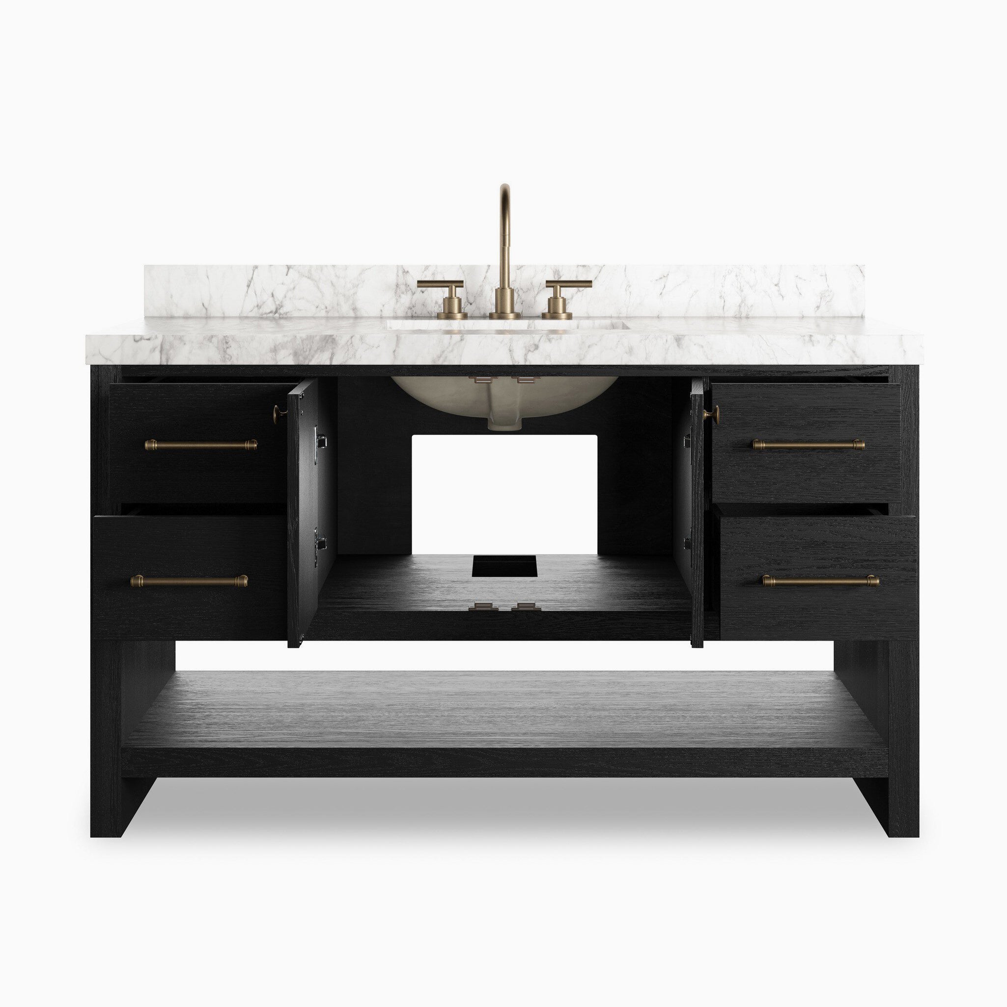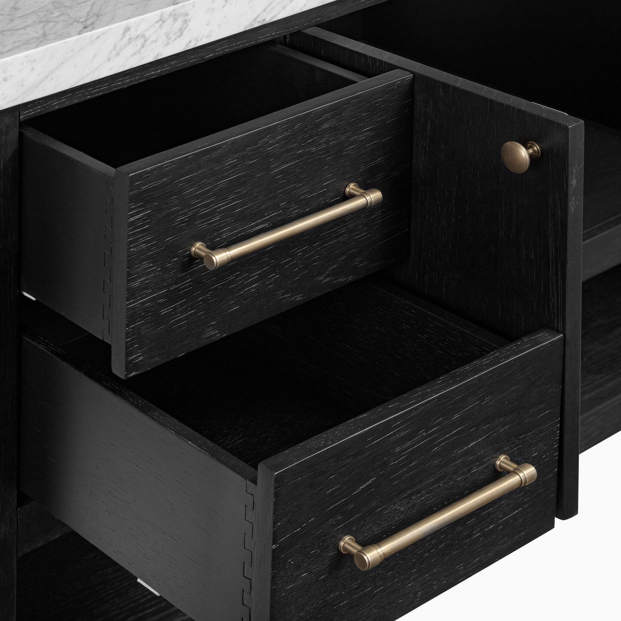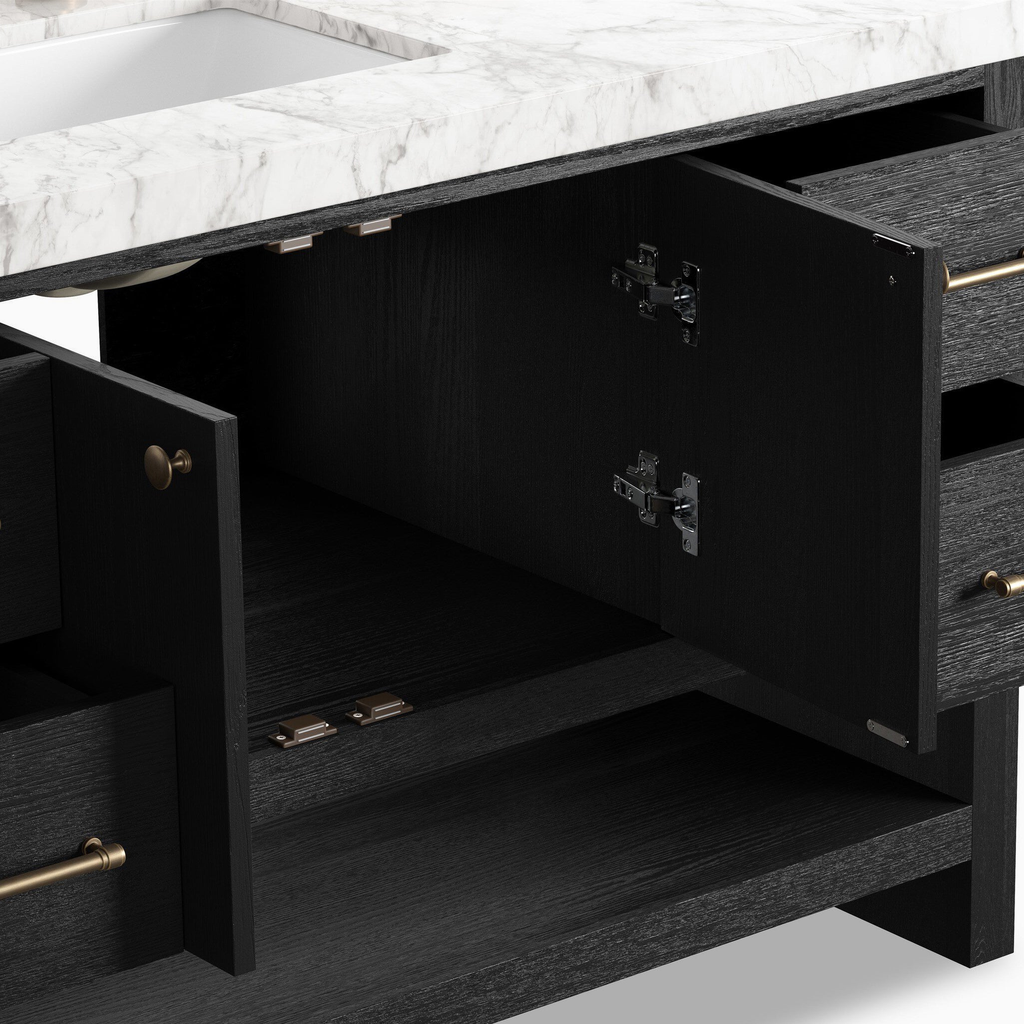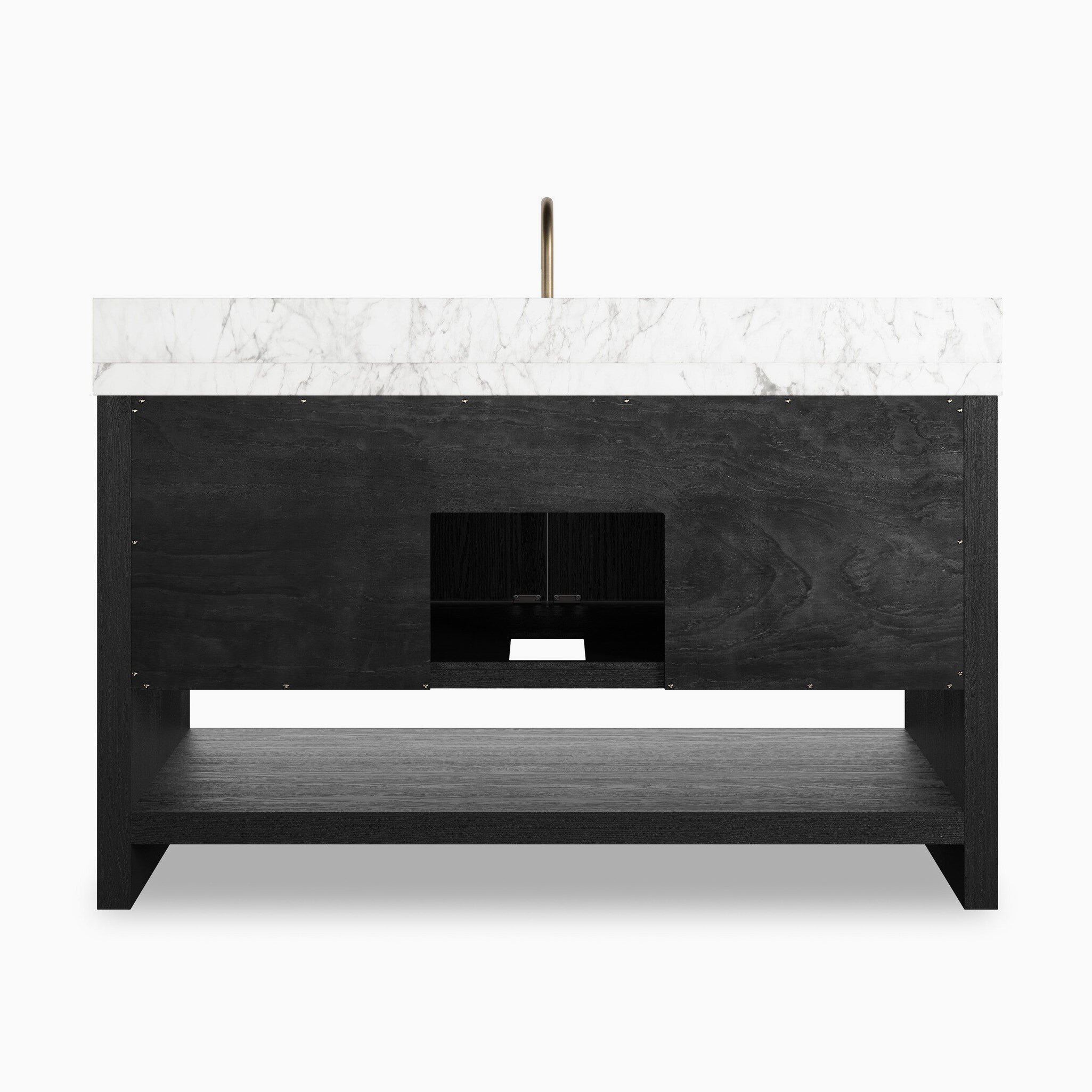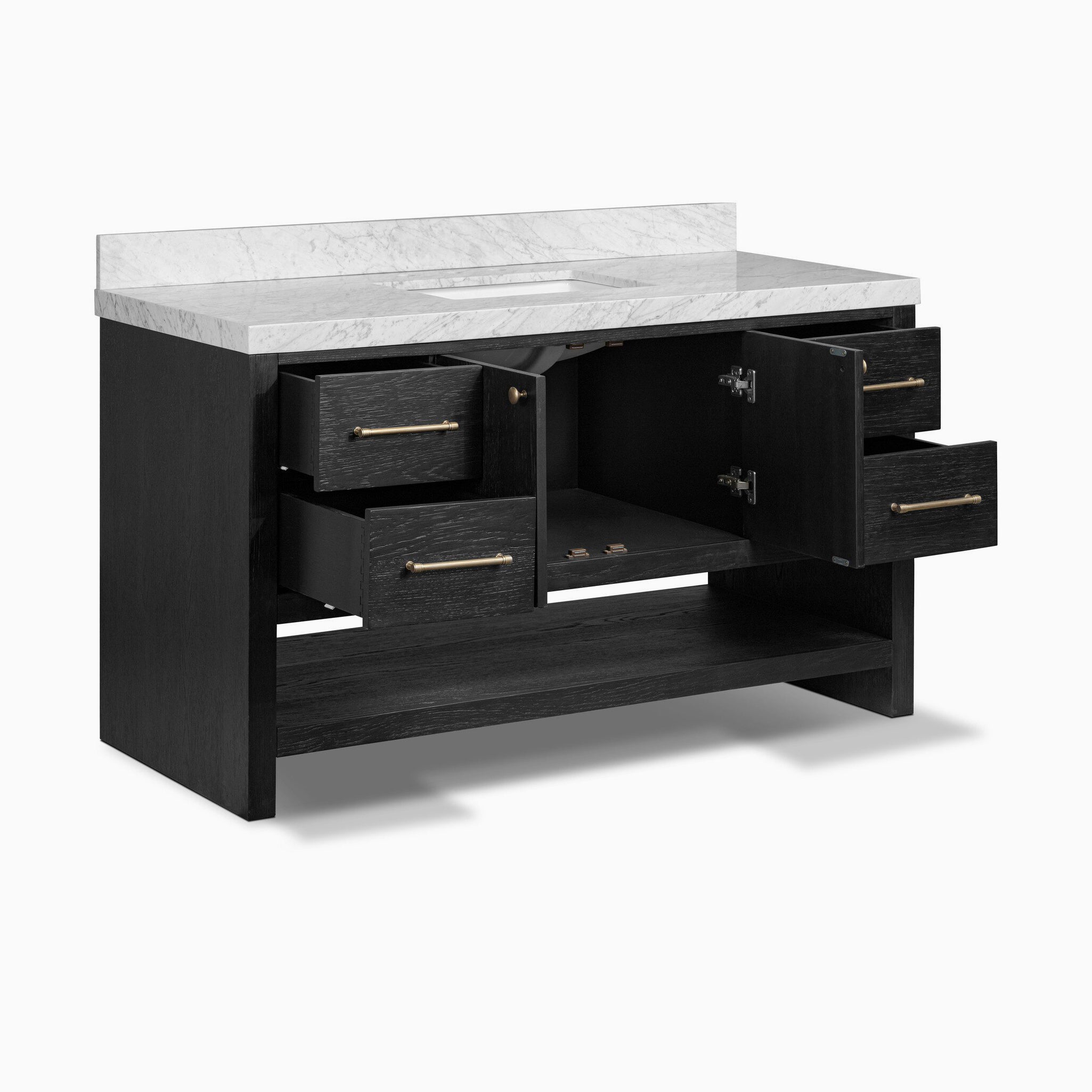 From its dark tone to its tactile finish, the oak veneer on our Maxine 55" Single Vanity in Black Wash Oak Veneer with Carrara Marble Top is the true star. Carefully wire-brushed for depth and dimension, the wood radiates a sense of handcrafted quality and organic charm, perfectly balanced by the sleek silhouette and modern materials. A generous mix of storage is also added, including a pair of 2 drawers at each side, a central two-door cabinet, and an open shelf at the base.