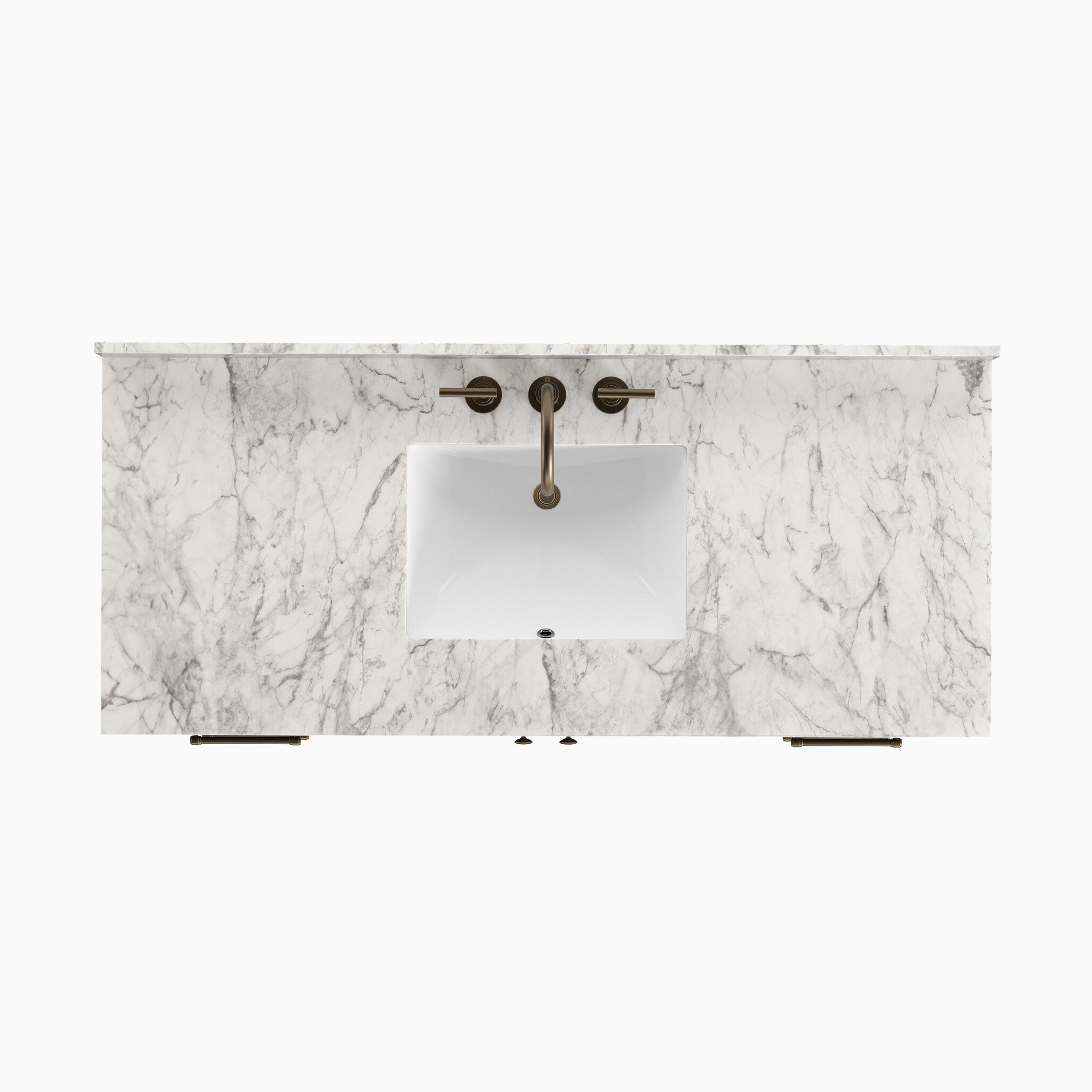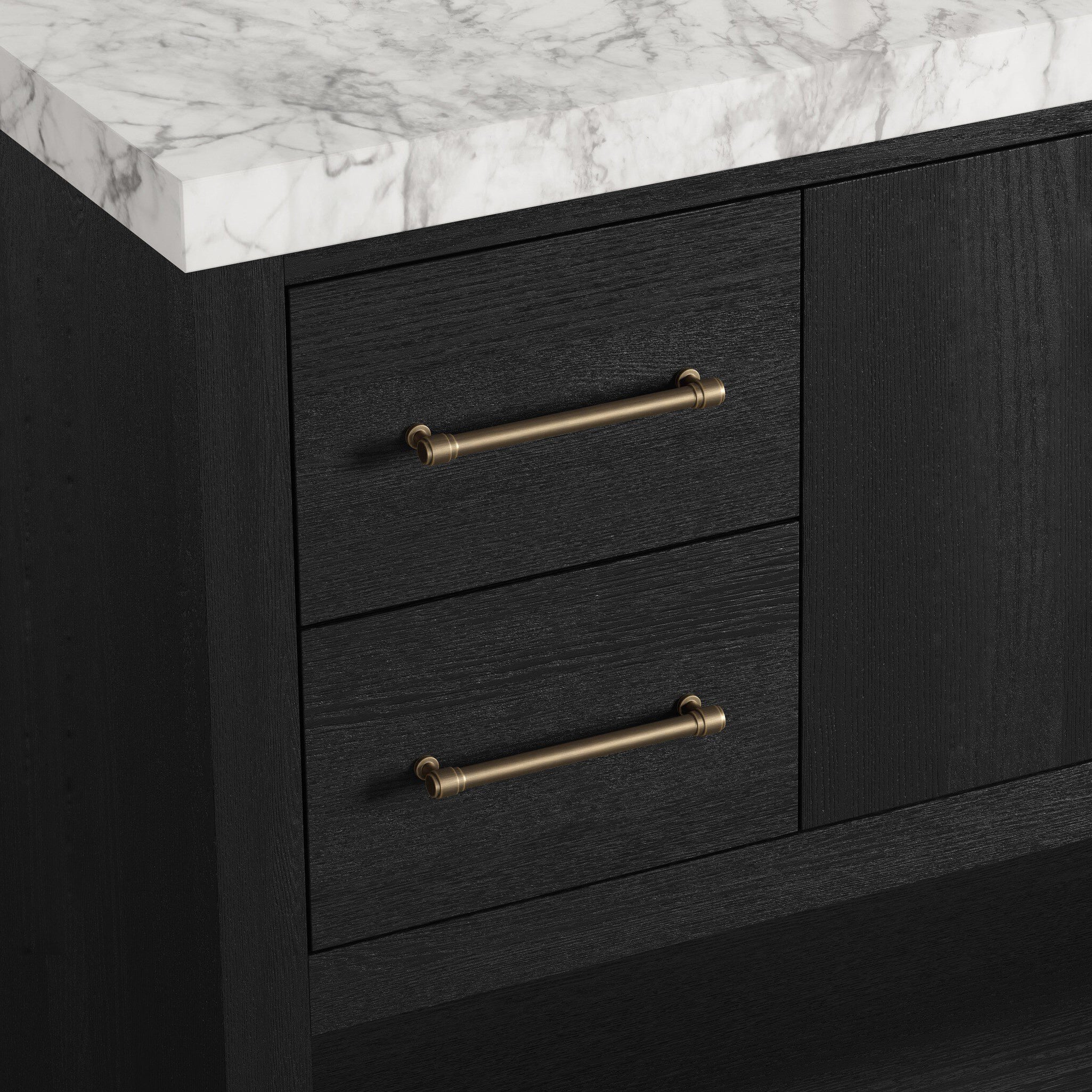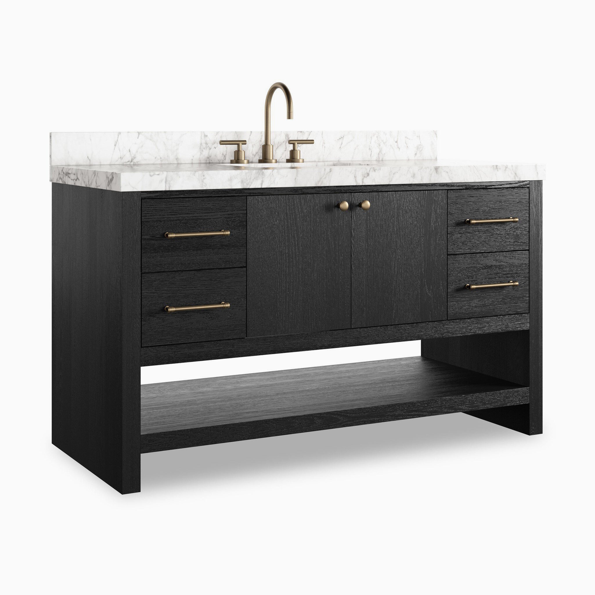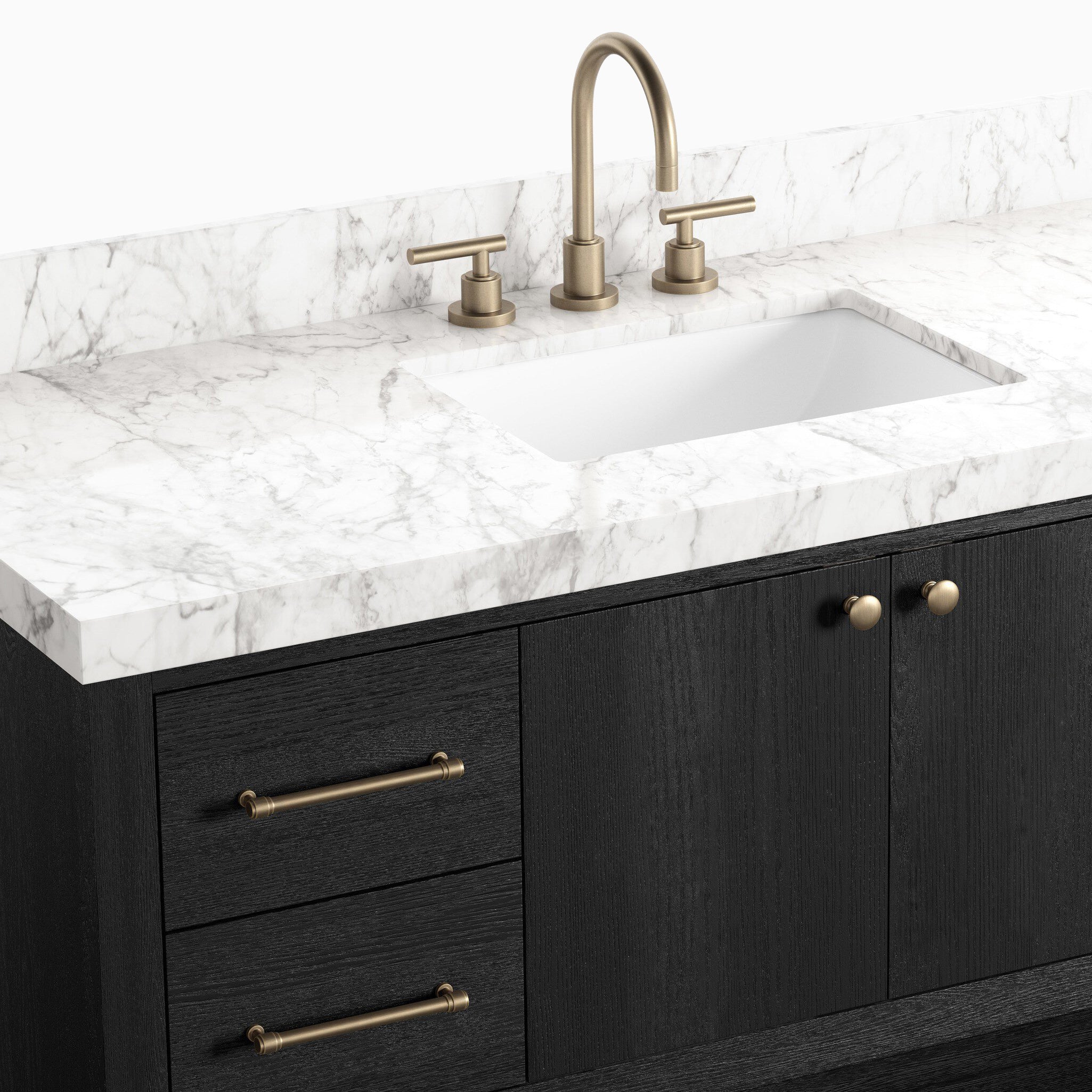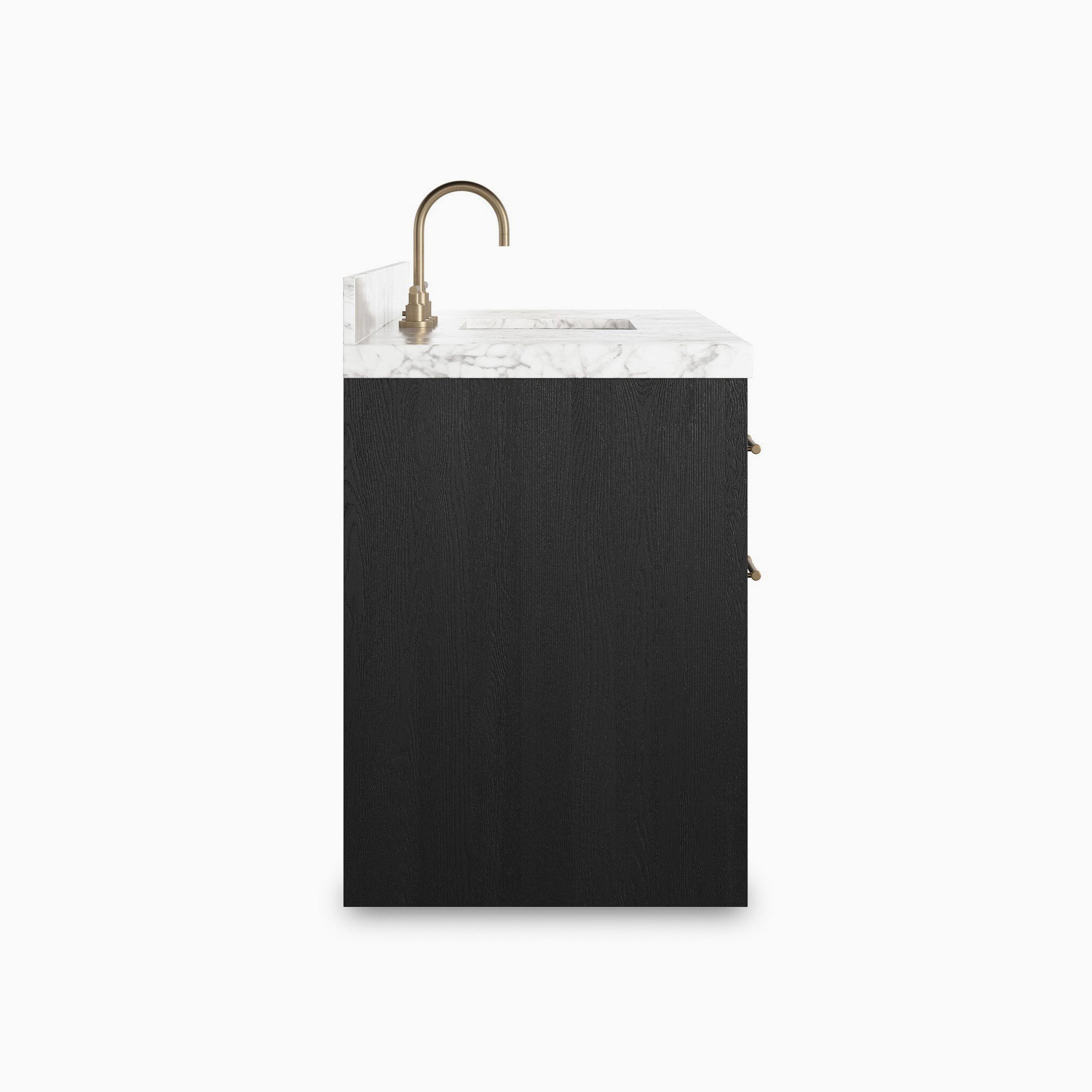 From its dark tone to its tactile finish, the oak veneer on our Maxine 55" Single Vanity in Black Wash Oak Veneer with Carrara Marble Top is the true star. Carefully wire-brushed for depth and dimension, the wood radiates a sense of handcrafted quality and organic charm, perfectly balanced by the sleek silhouette and modern materials. A generous mix of storage is also added, including a pair of 2 drawers at each side, a central two-door cabinet, and an open shelf at the base.