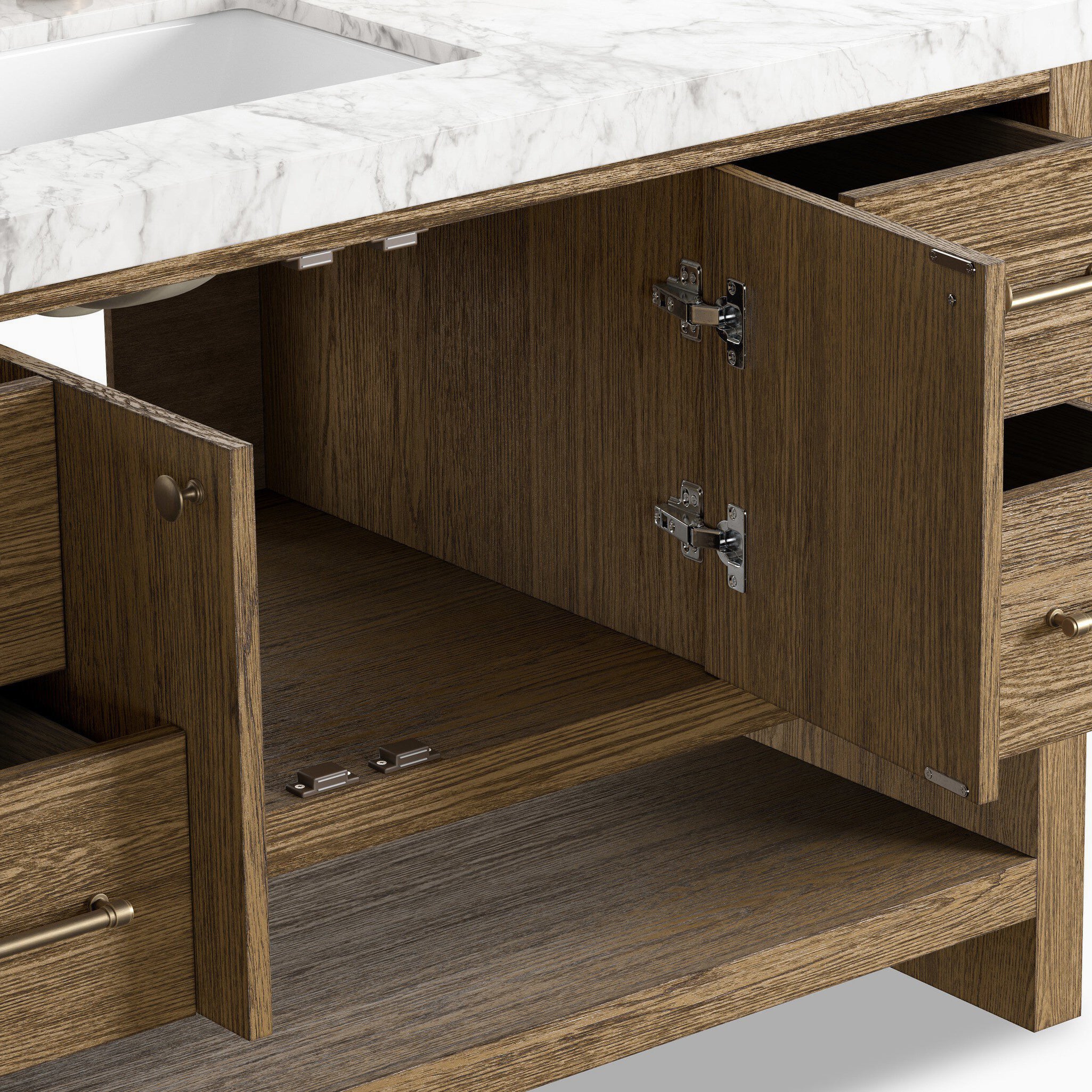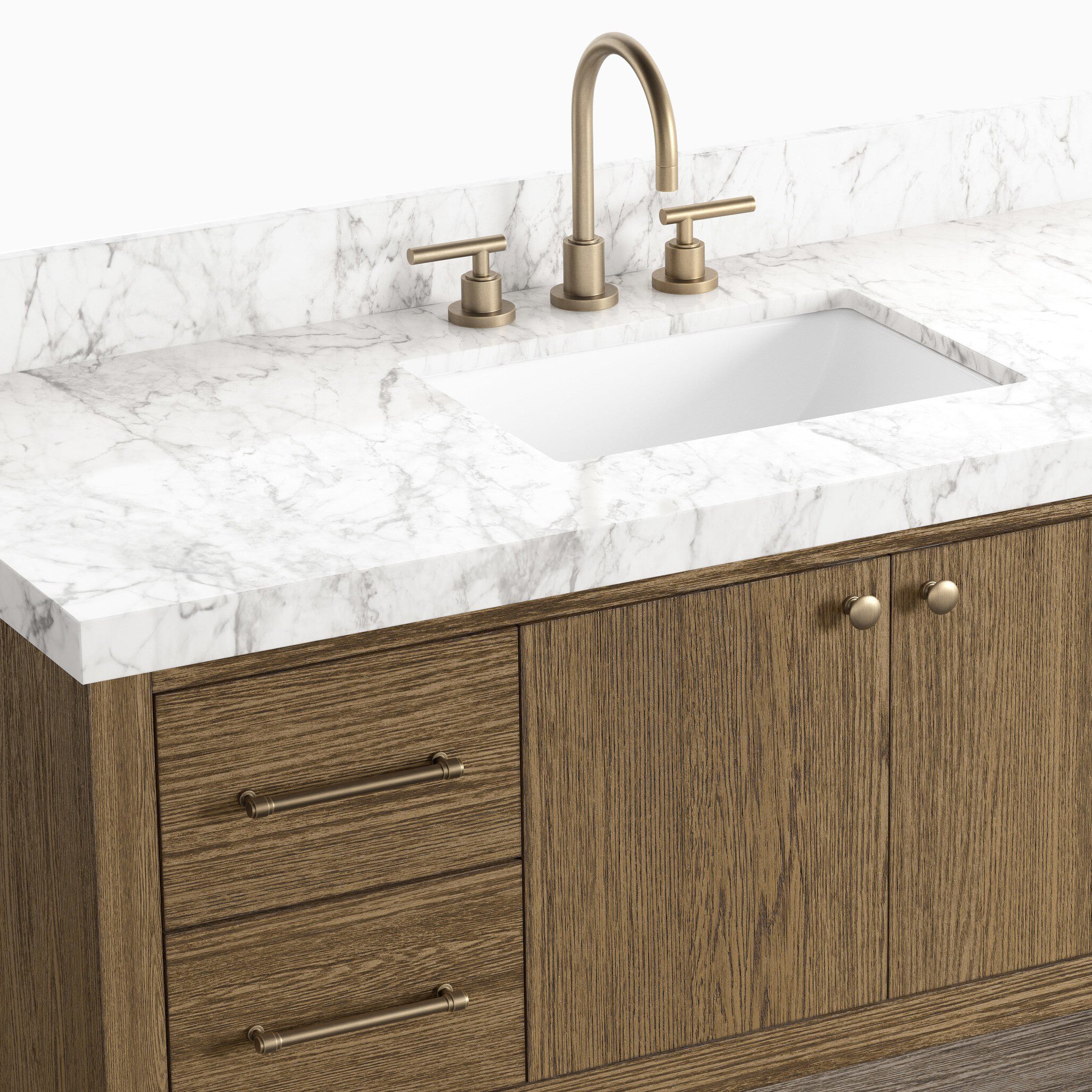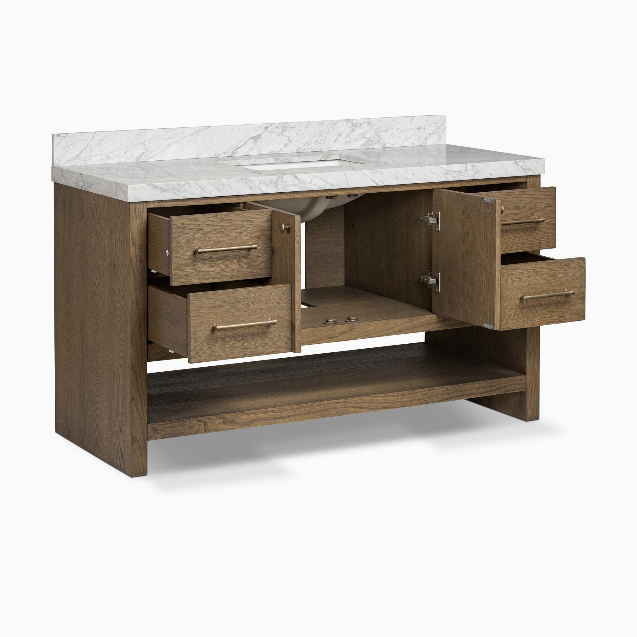 From its warm tone to its tactile finish, the oak veneer on our Maxine 55" Single Vanity in Washed Natural Veneer with Carrara Marble Top is the true star. Carefully wire-brushed for depth and dimension, the wood radiates a sense of handcrafted quality and organic charm, perfectly balanced by the sleek silhouette and modern materials. A generous mix of storage is also added, including a pair of 2 drawers at each side, a central two-door cabinet, and an open shelf at the base.