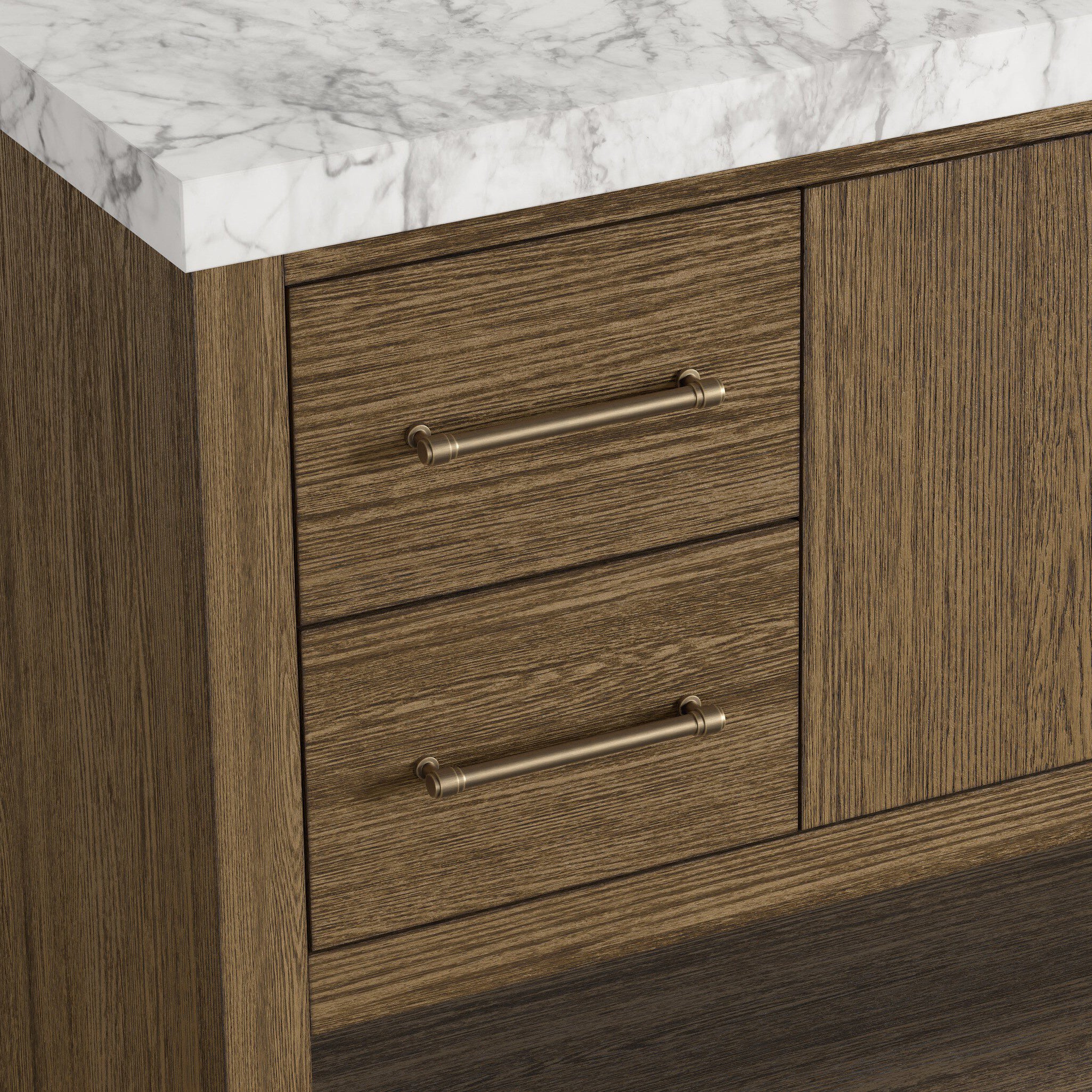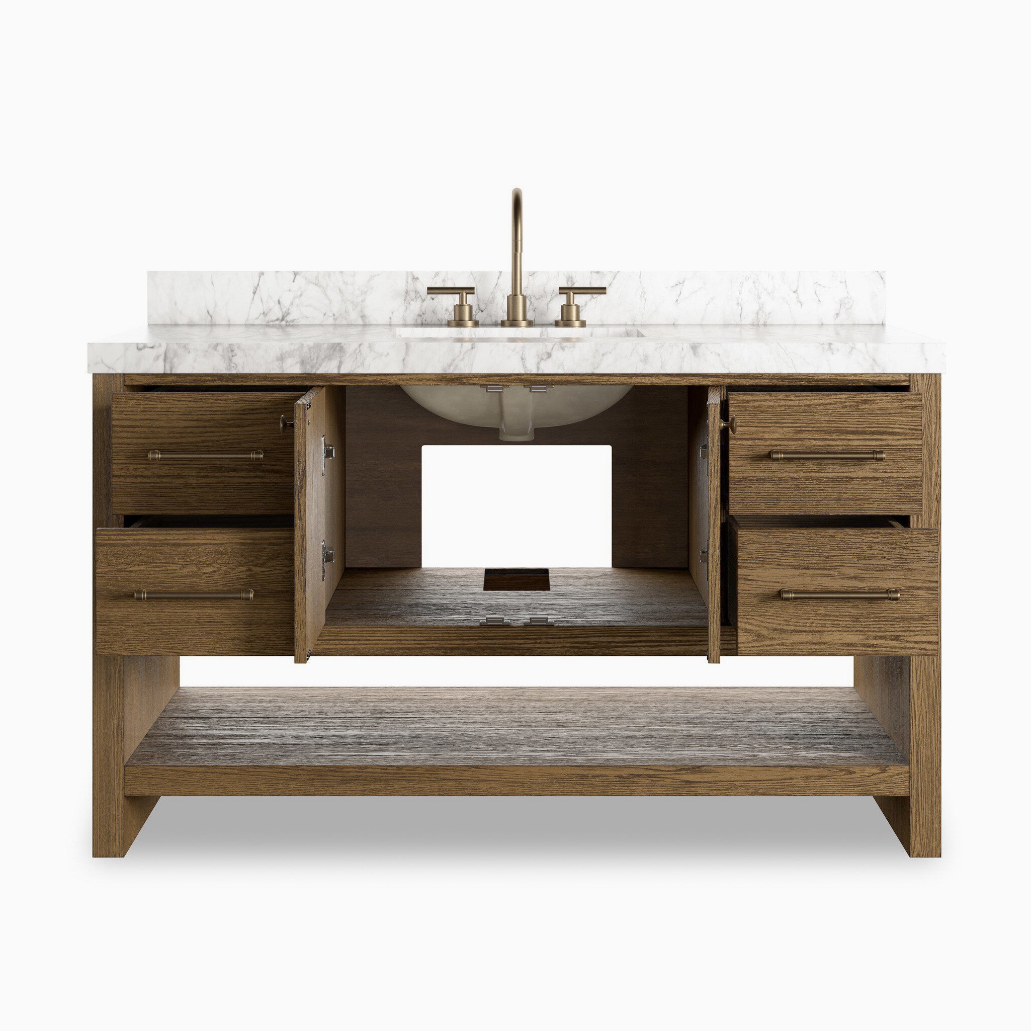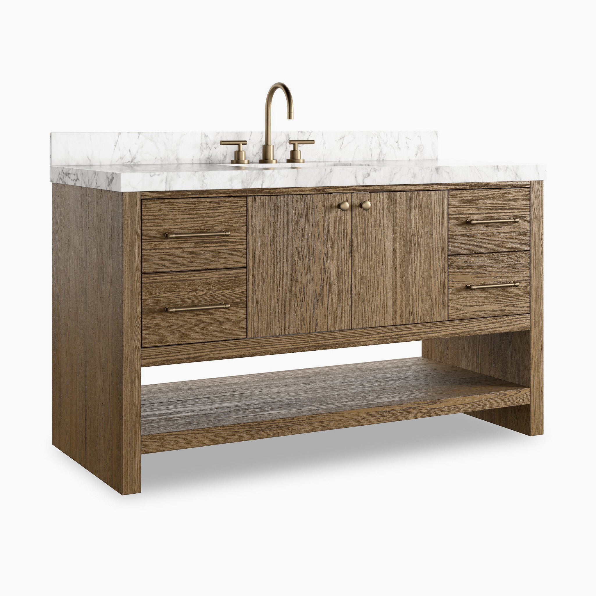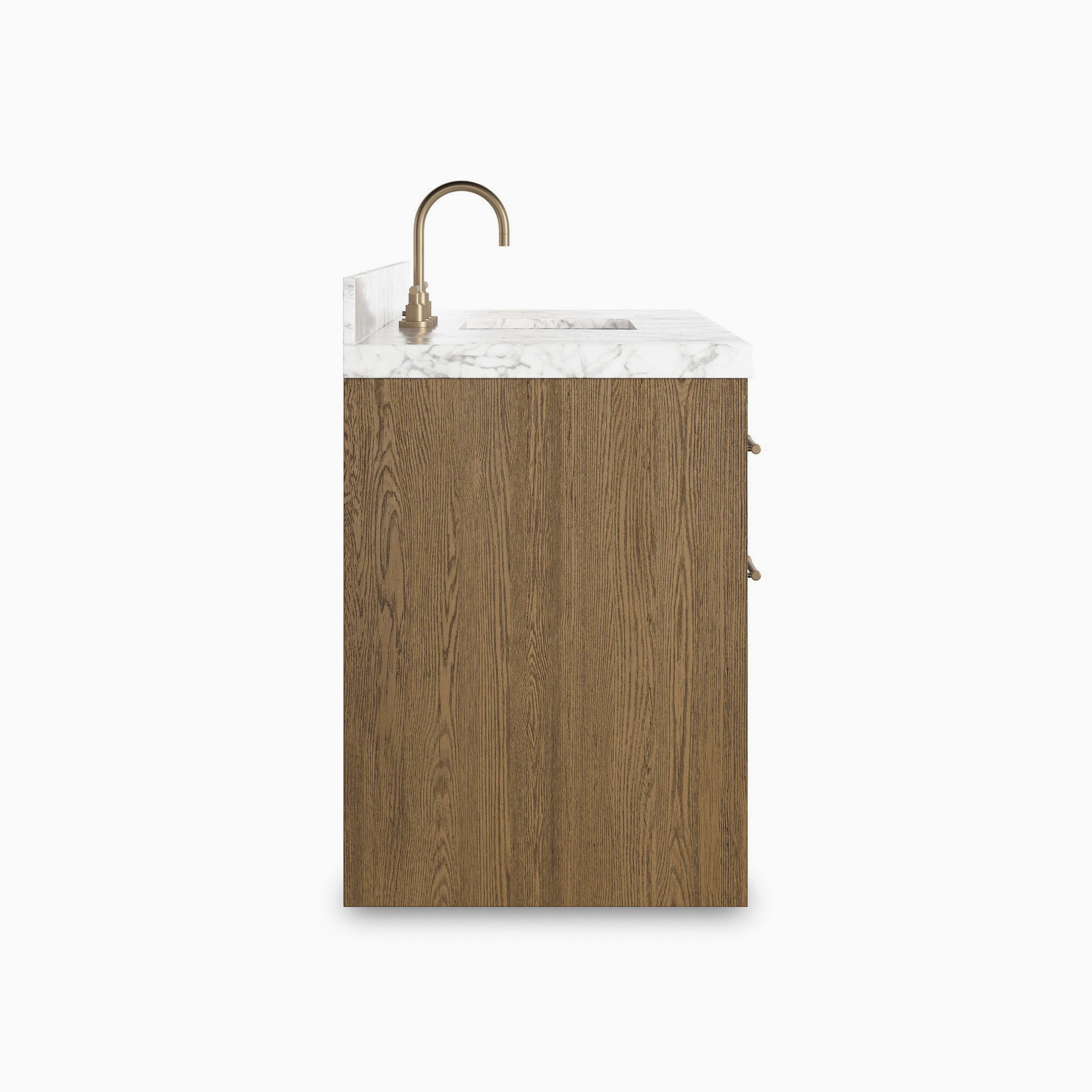 From its warm tone to its tactile finish, the oak veneer on our Maxine 55" Single Vanity in Washed Natural Veneer with Carrara Marble Top is the true star. Carefully wire-brushed for depth and dimension, the wood radiates a sense of handcrafted quality and organic charm, perfectly balanced by the sleek silhouette and modern materials. A generous mix of storage is also added, including a pair of 2 drawers at each side, a central two-door cabinet, and an open shelf at the base.