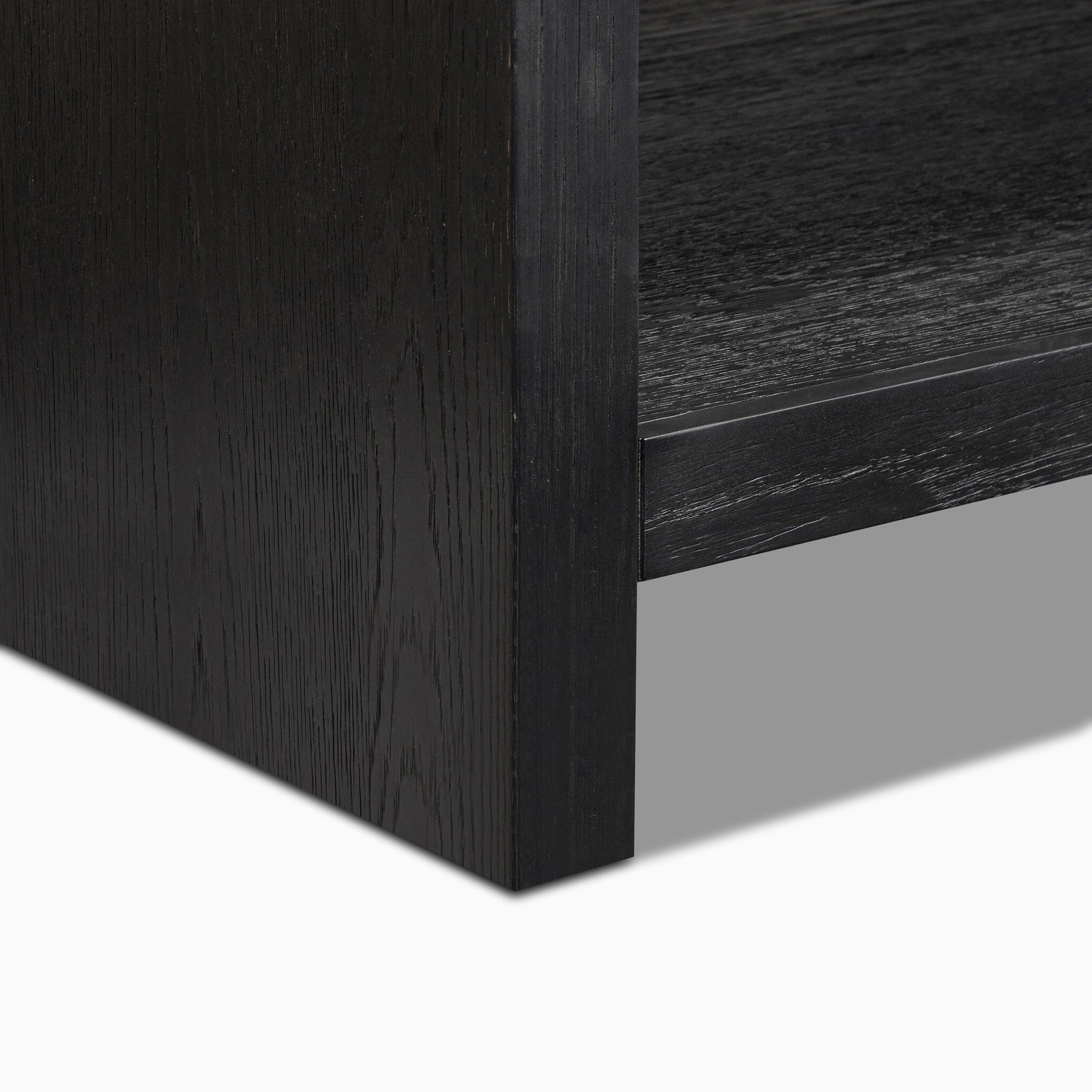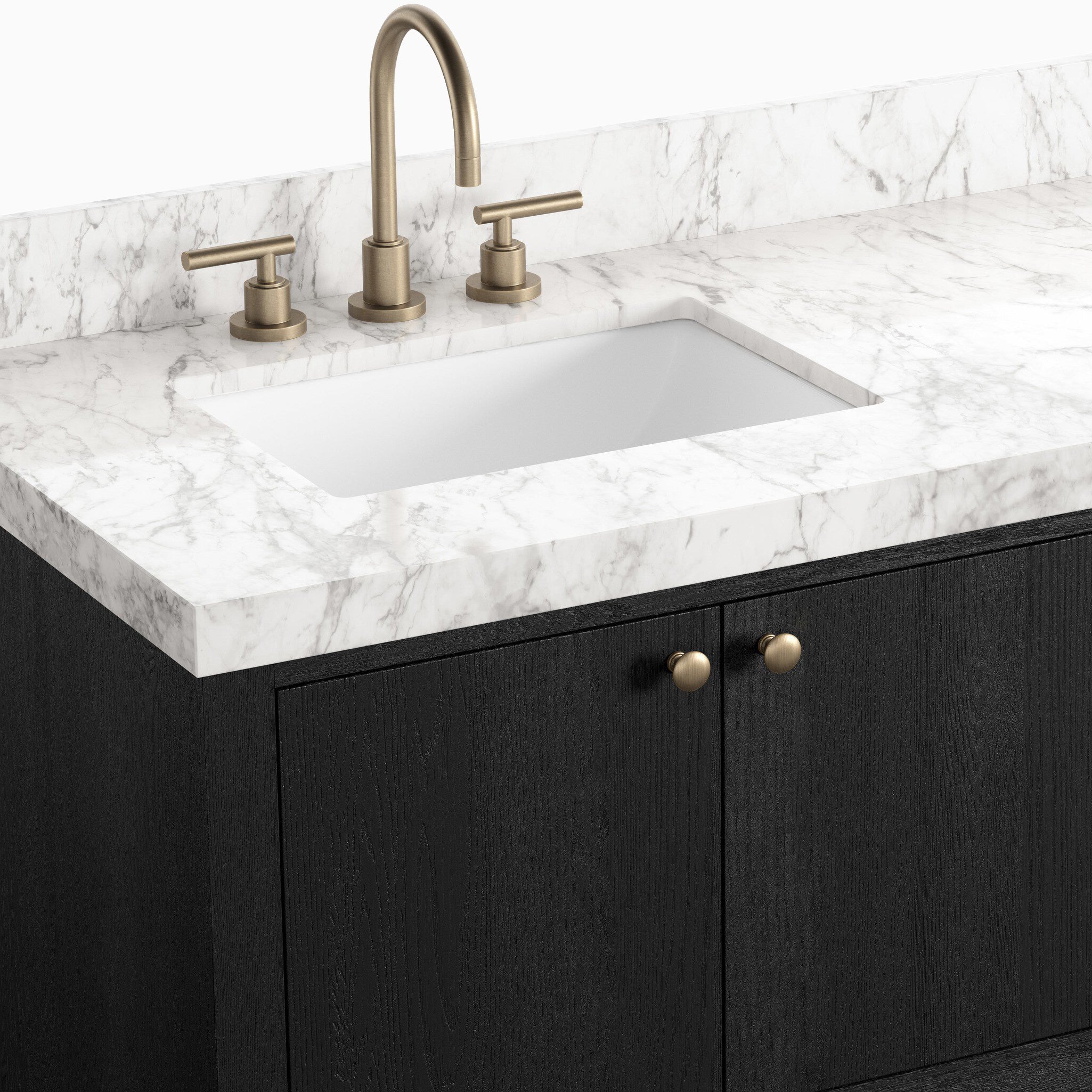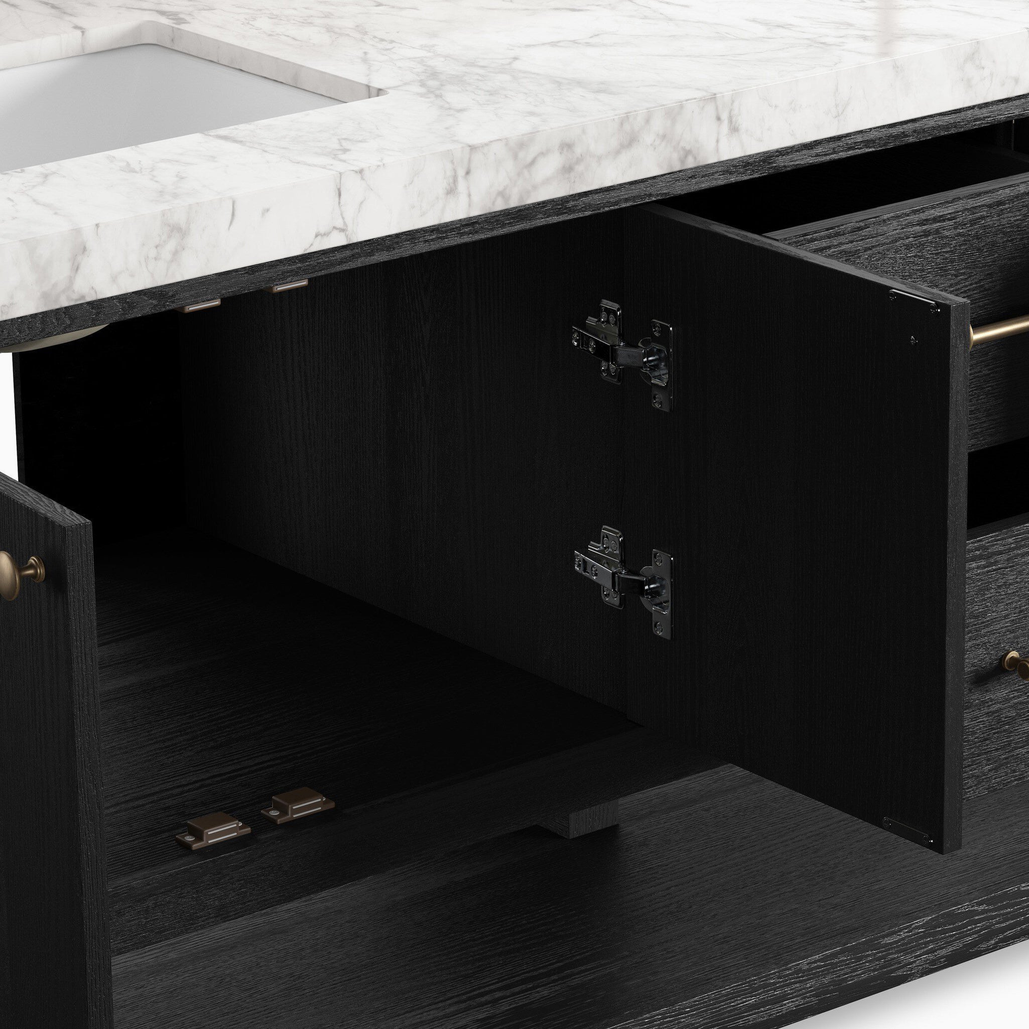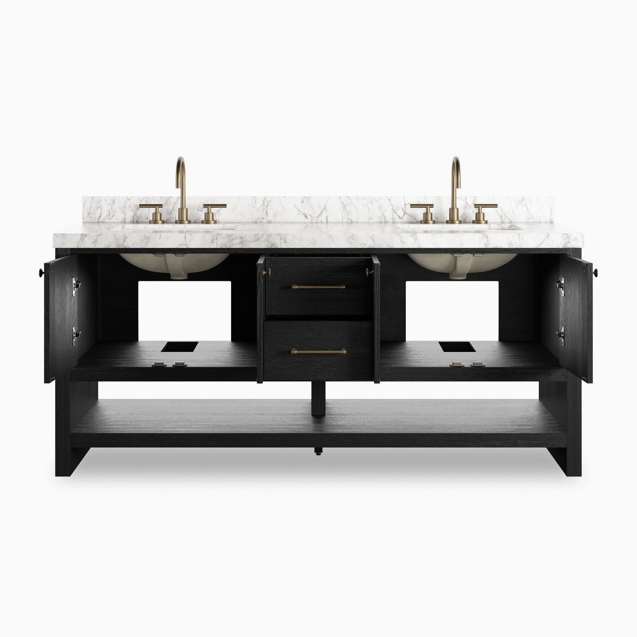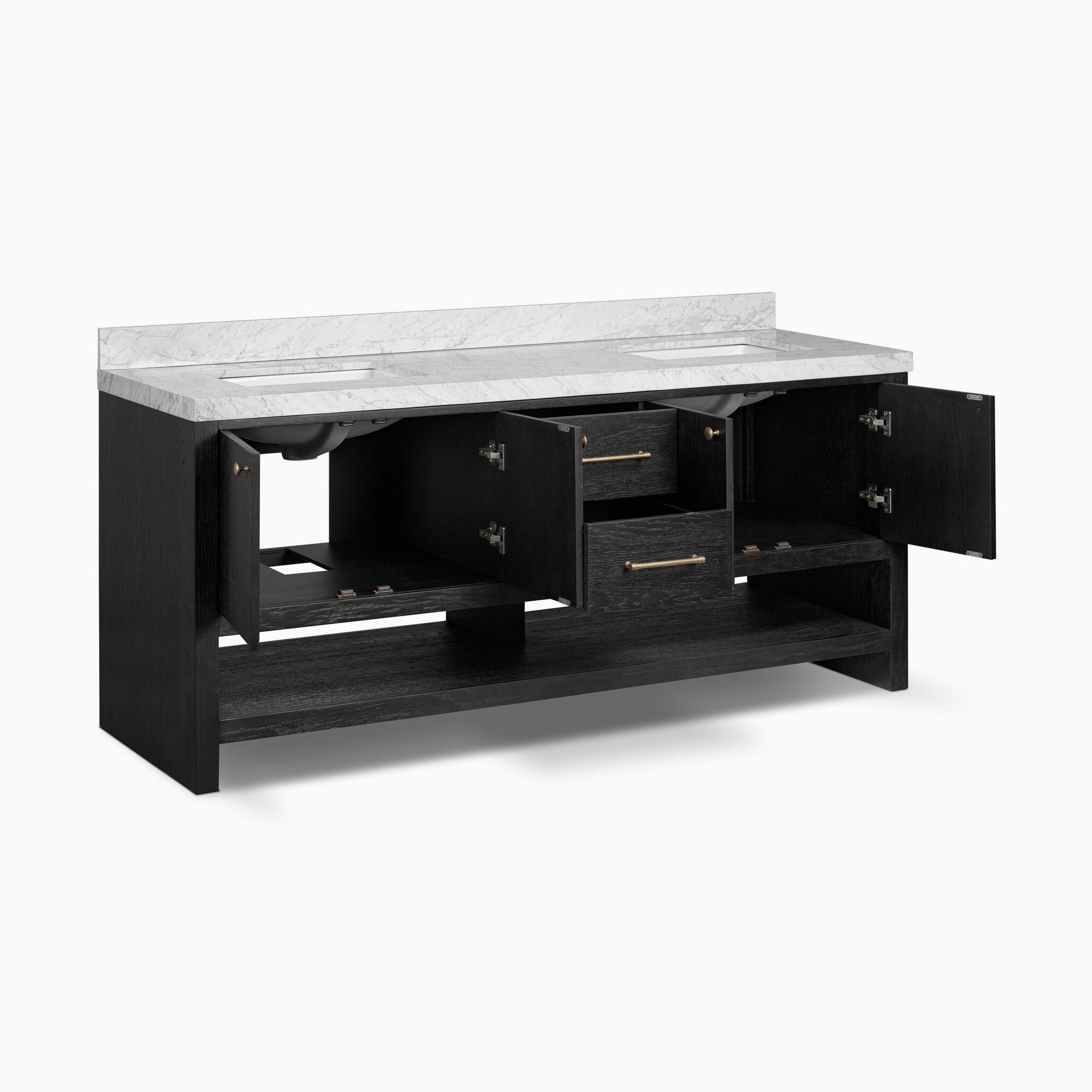 From its dark tone to its tactile finish, the oak veneer on our Maxine 72" Double Vanity in Black Wash Oak Veneer with Carrara Marble Top is the true star. Carefully wire-brushed for depth and dimension, the wood radiates a sense of handcrafted quality and organic charm, perfectly balanced by the sleek silhouette and modern materials. A generous mix of storage is also added, including 2 central drawers, a two-door cabinet on each side, and an open shelf at the base.