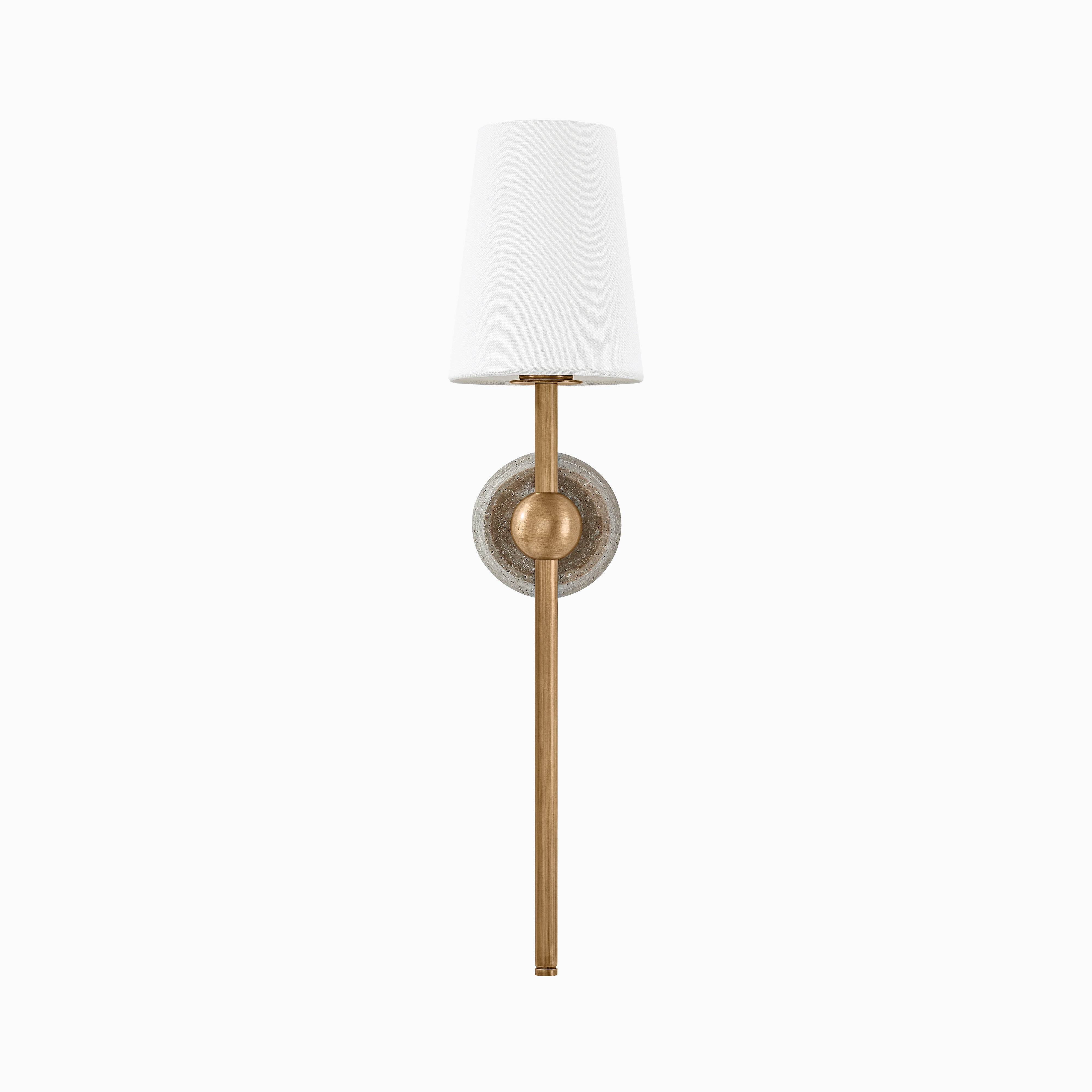 Artful in its composition, our Ortega Wall Sconce in Patina Brass celebrates both the beauty of material contrast and harmony. Its textured backplate of grey travertine appears to cradle the concave center of a slender, earthy metallic stem, evoking a sense of gentle suspension. An off-white linen shade crowns the piece, casting a warm glow that highlights every organic detail.