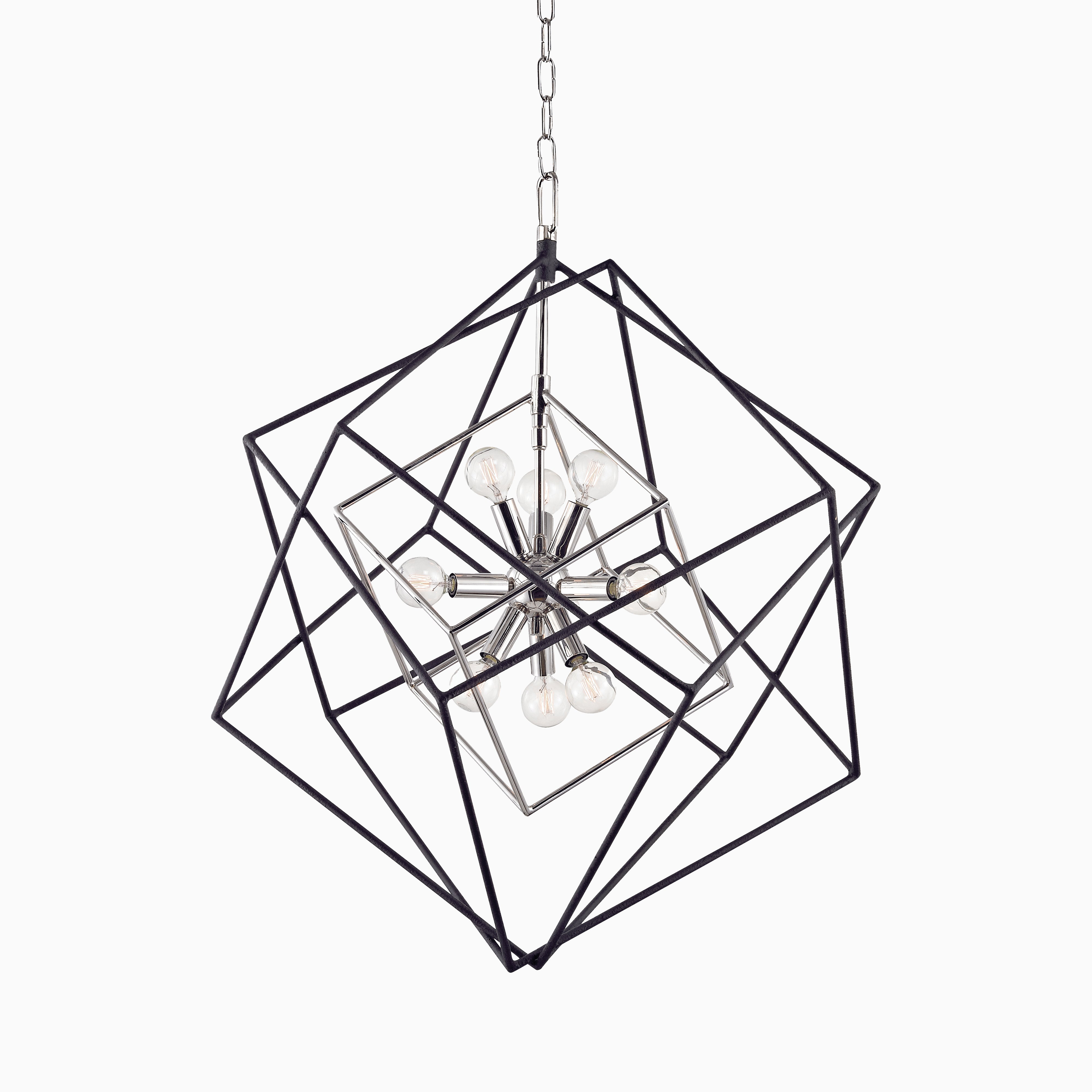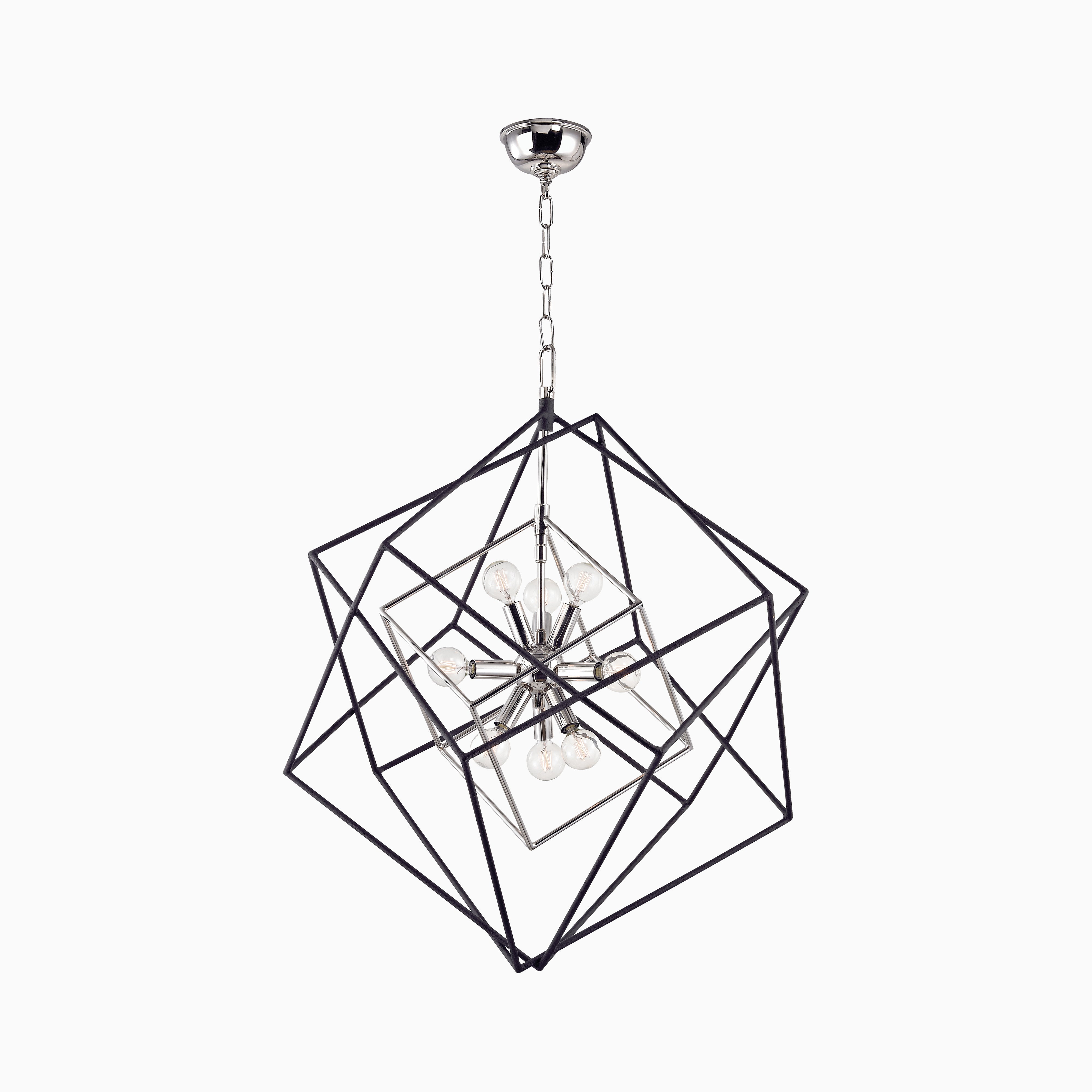 Like an orbit frozen in motion, our Osborne 26" Chandelier in Polished Nickel features a series of interlocking, hollow cube frames that expand outward, surrounding a central Sputnik-style fixture fitted with nine dainty lights. A balanced blend of black and silver metallic tones wraps the piece to deliver a dimensional, mid-century modern look.