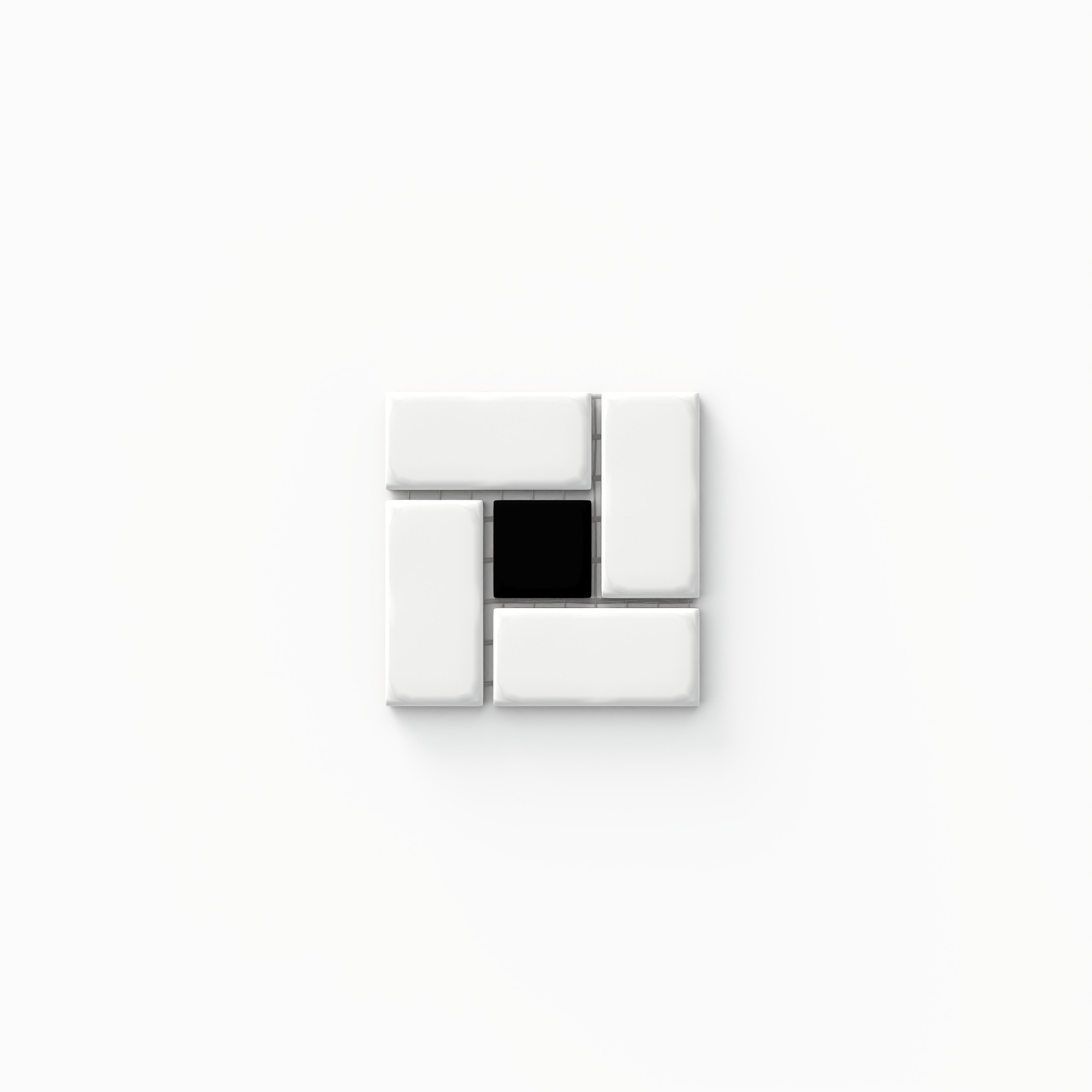A sample of our Quinn 12x12 Matte Porcelain Pinwheel Mosaic Tile in Black & White, it features an eye-catching interplay of smaller monochromatic tiles that mimic the playful motion of a pinwheel.
