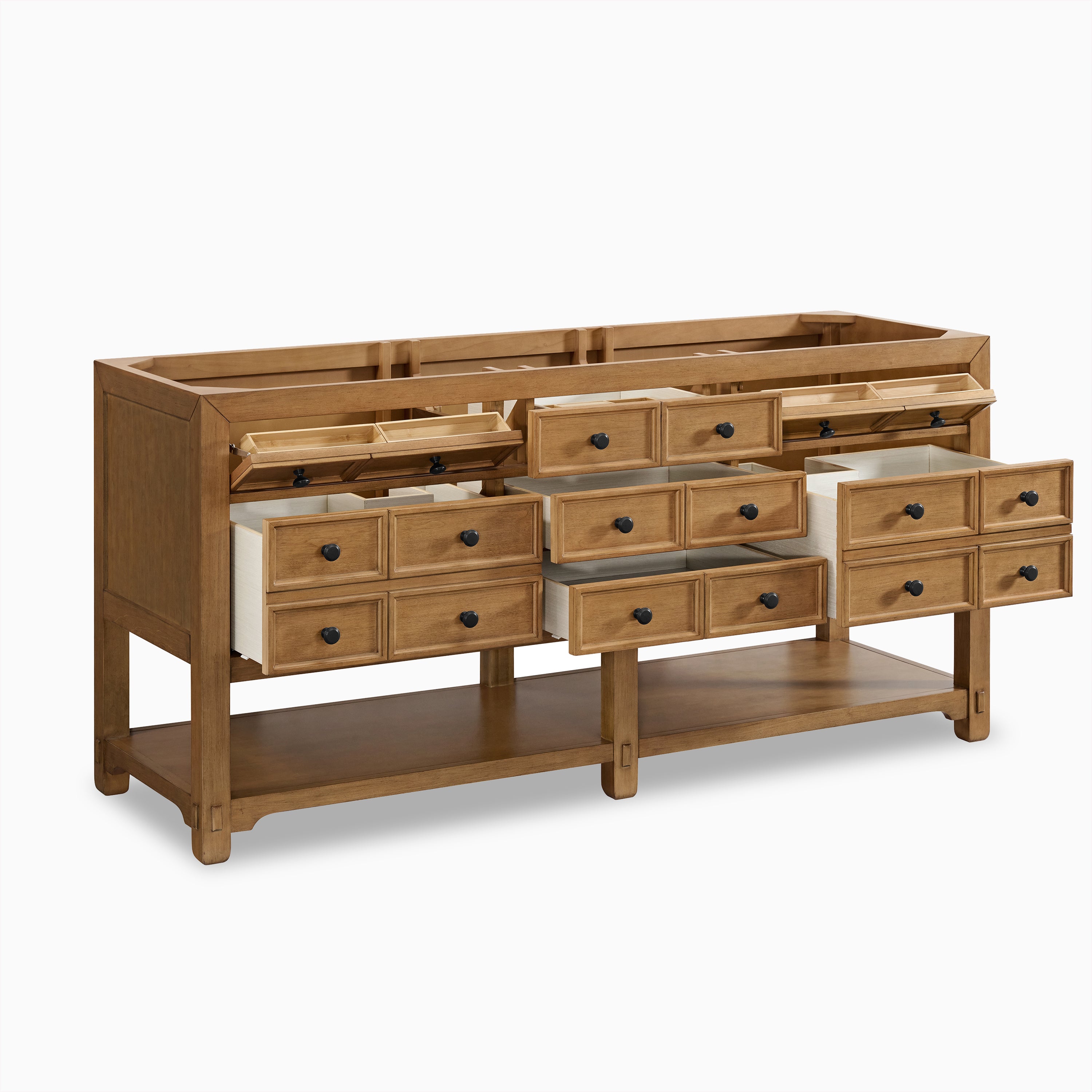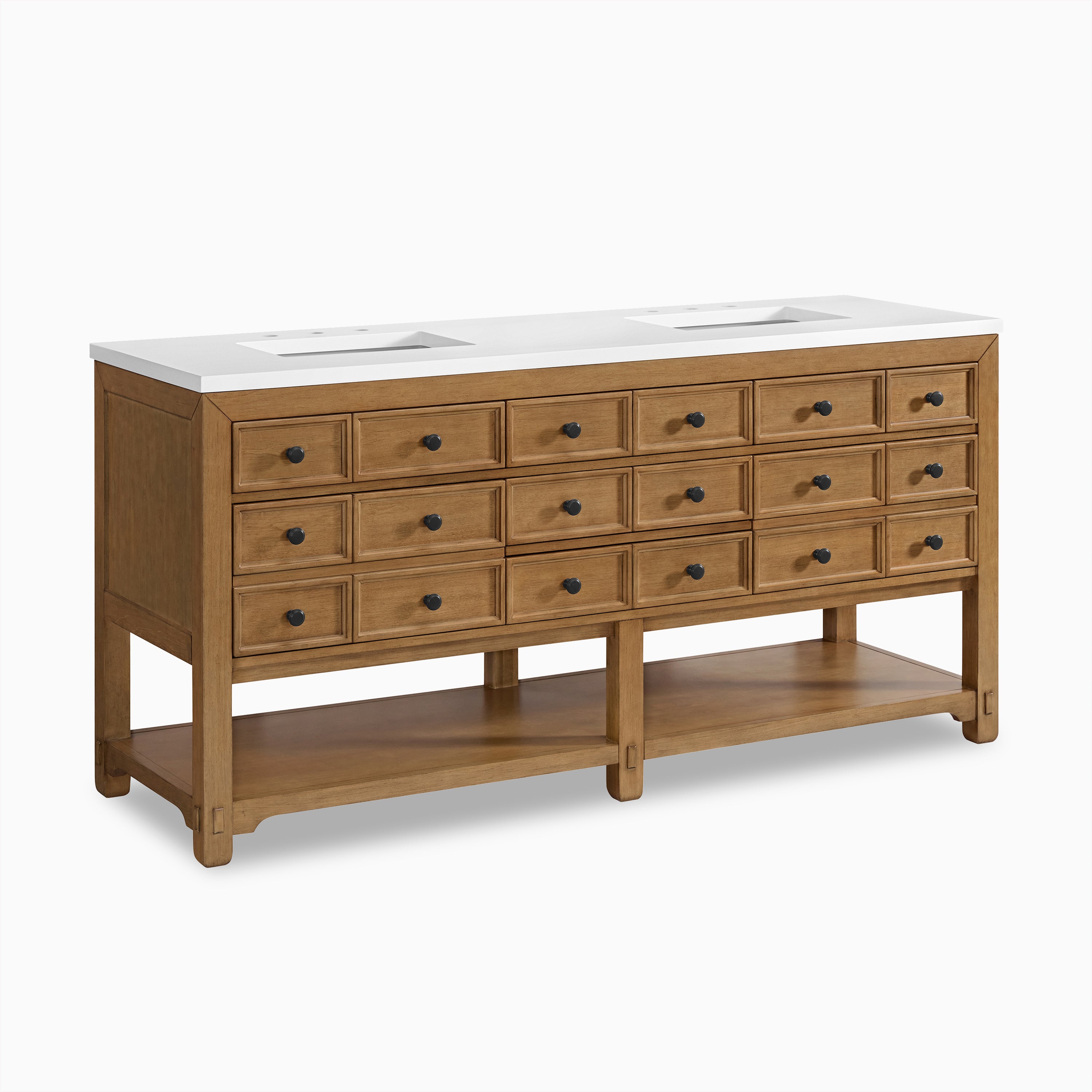 With its warm wood tones and structured silhouette, our Rosalie 72" Double Vanity in Amber Birch with 3 cm White Zeus Quartz Top strikes the perfect balance between traditional craftsmanship and elevated design. Decorative drawer faces, modern black hardware, and a coordinating backsplash add polished detail, while its solid poplar construction ensures lasting beauty. Inside, there's space for more than just the everyday: clever compartments, 2 tip-out and 5 standard drawers, and an open lower shelf below with room to store or style, depending on what the day calls for.
