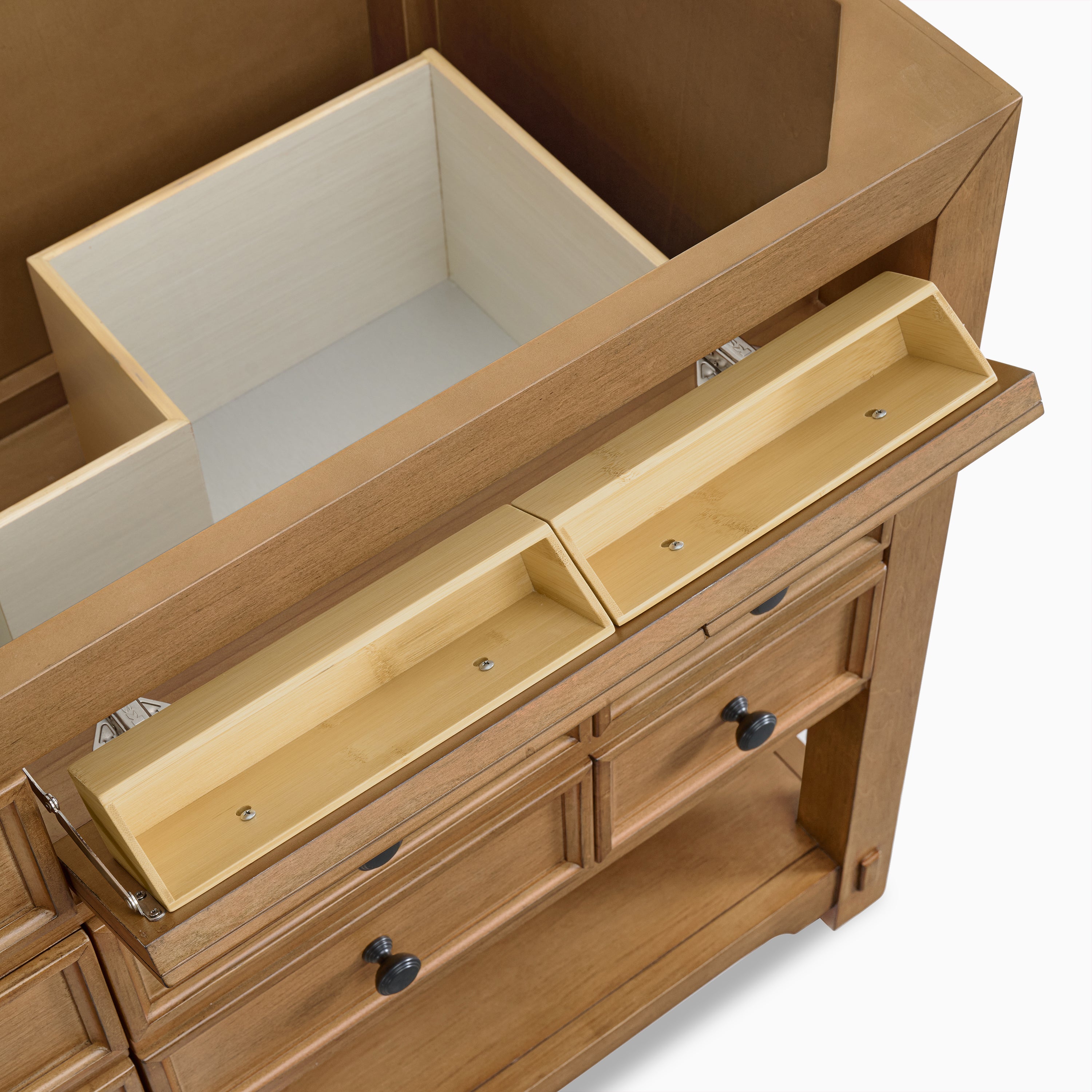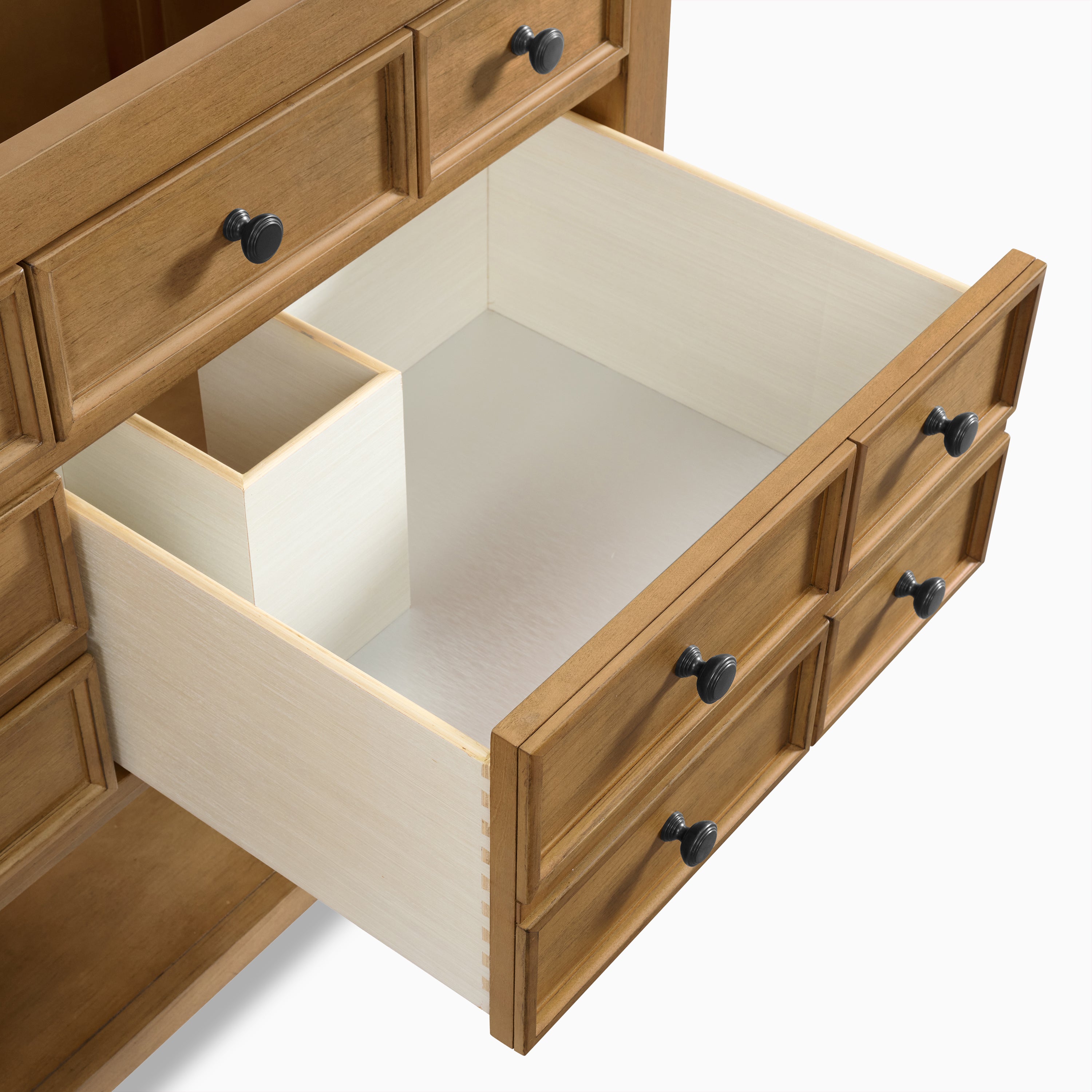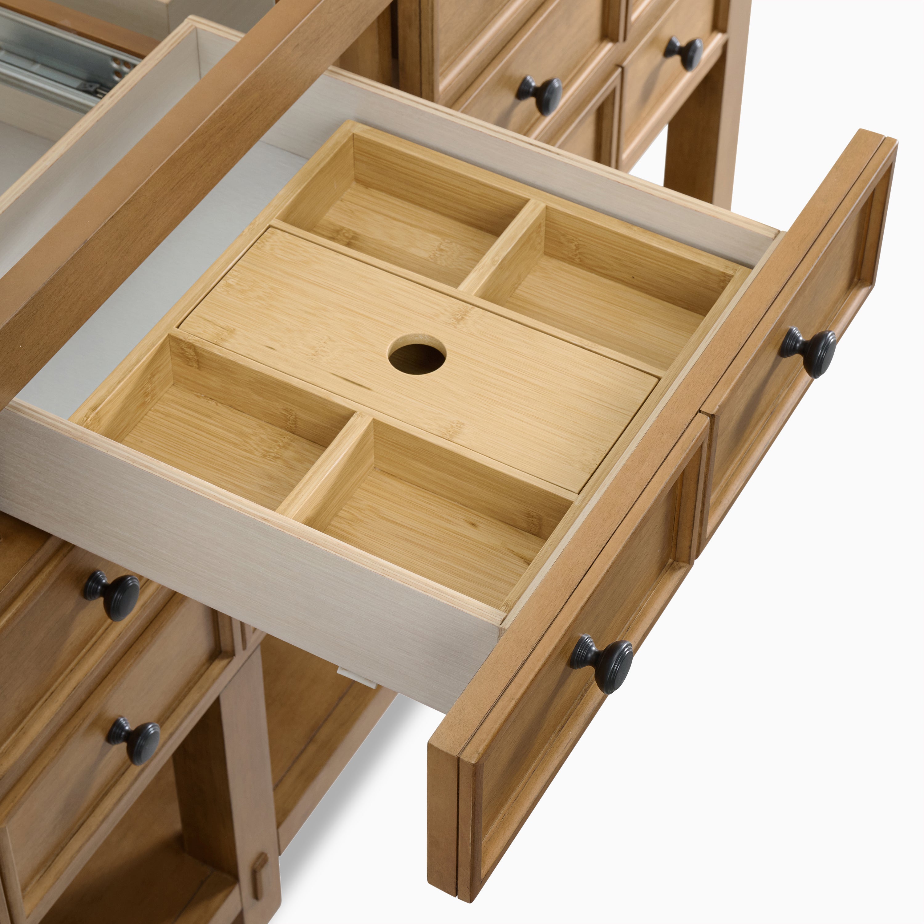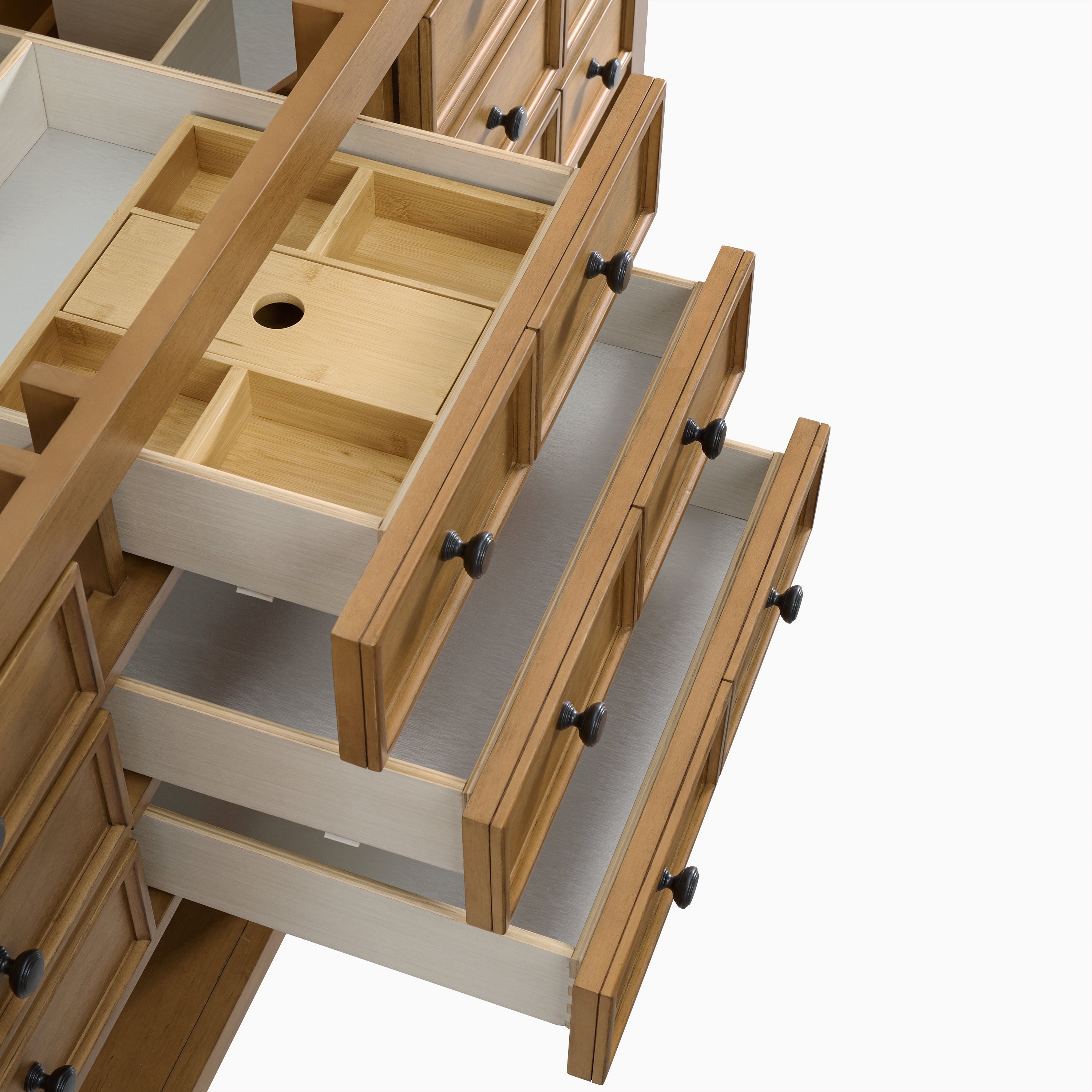 - Brushed aluminum laminate makes drawer bottoms extra durable