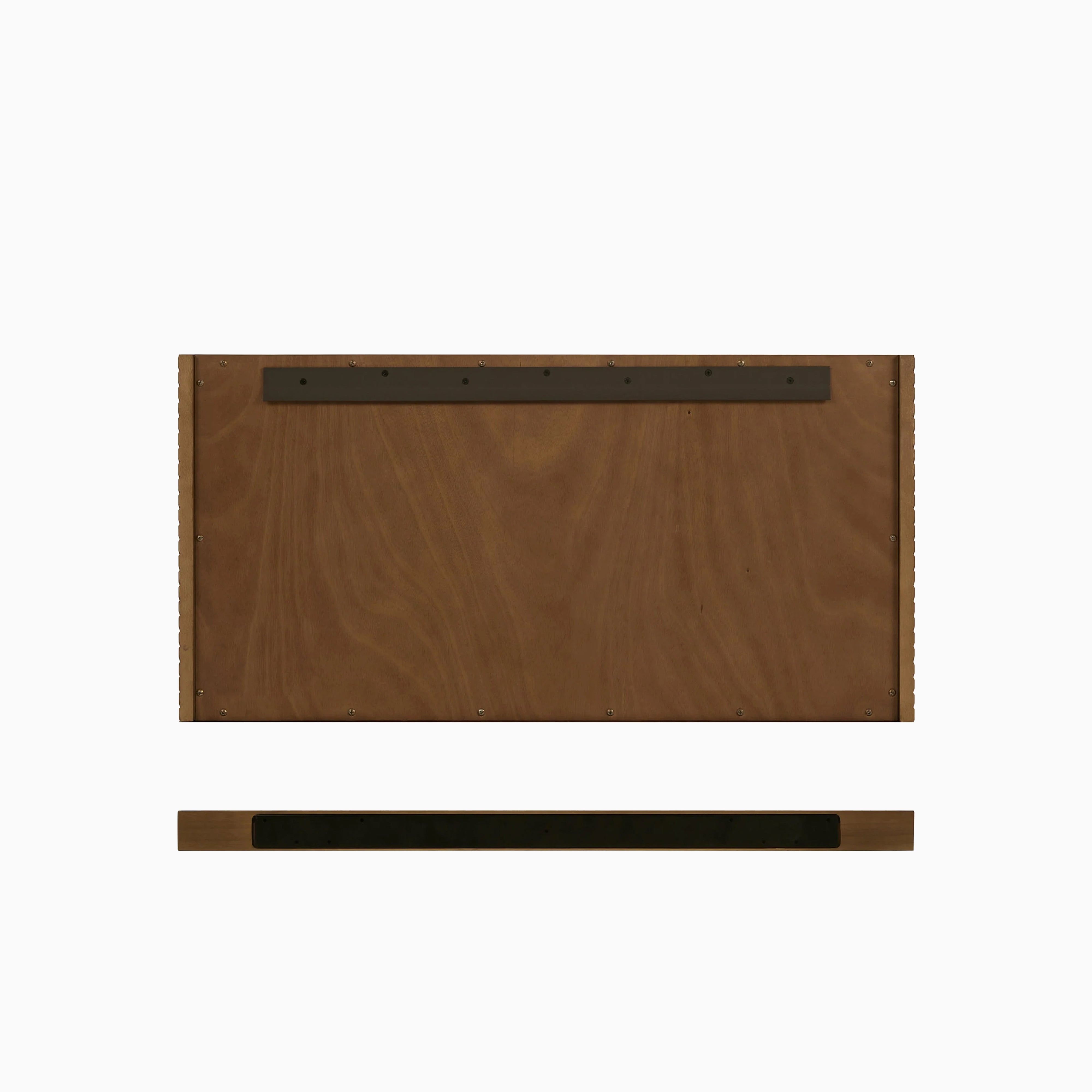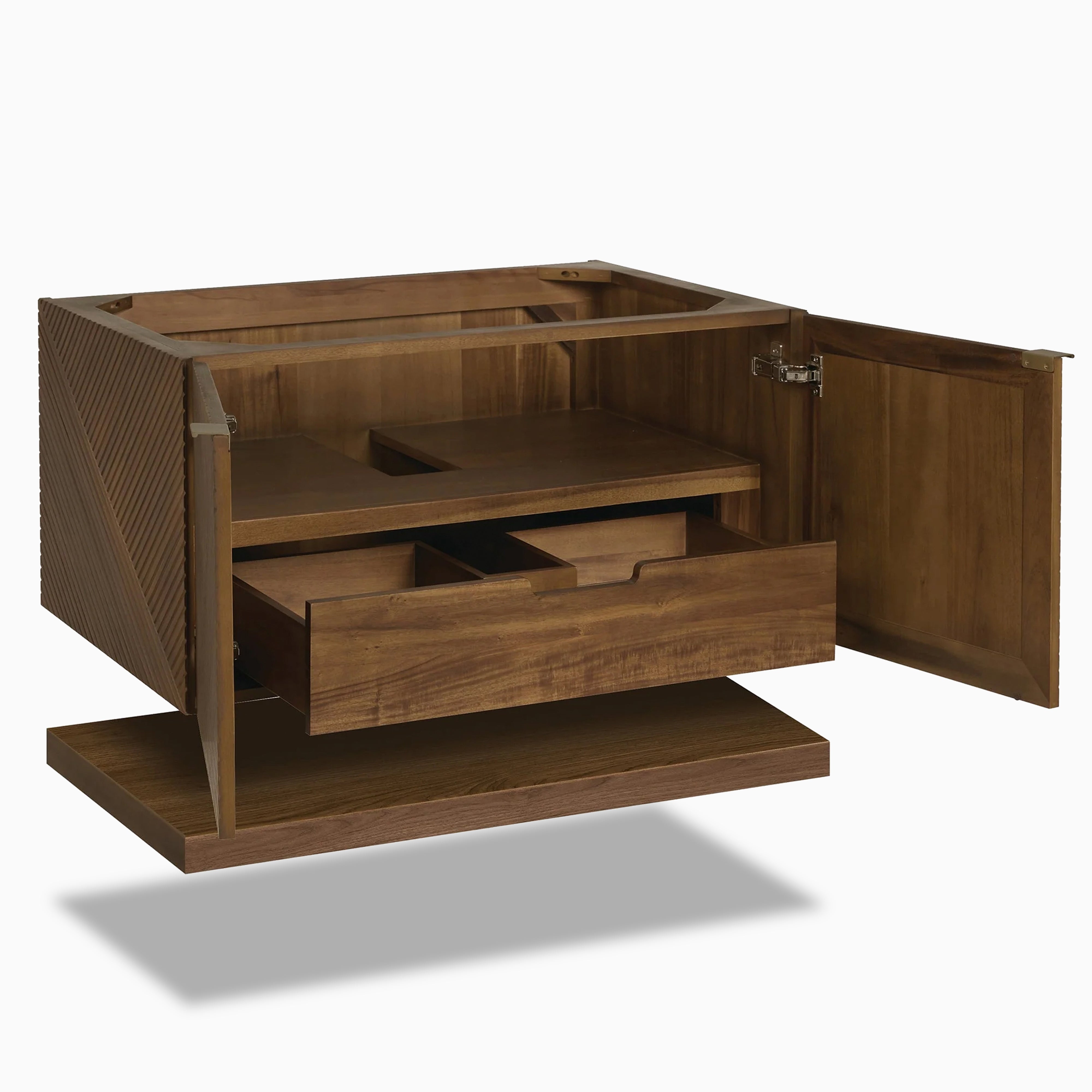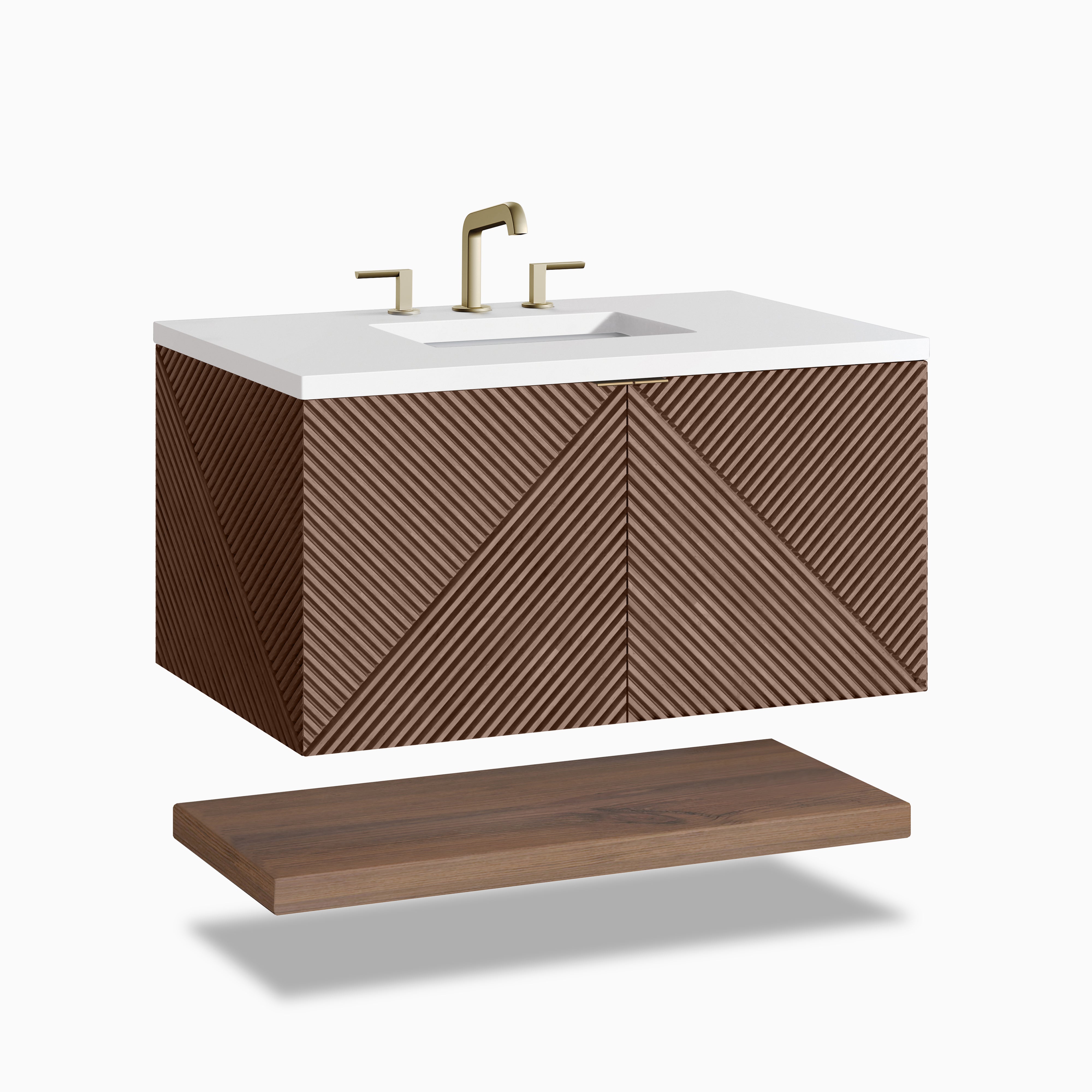 Enriched with deep, textured brown tones, our Royce 36" Single Vanity in Chestnut with 3 cm White Zeus Quartz Top stuns with its re-sawn Acacia veneer doors over Marine MDF, set in a symmetrical ribbed pattern. Behind them are concealed drawers and shelves, with a matching floating base beneath that offers an open space for everyday items. Elevated off the floor, the wall-mounted design adds a sense of lightness, tempering the sharp angled lines of its mid-century modern look.