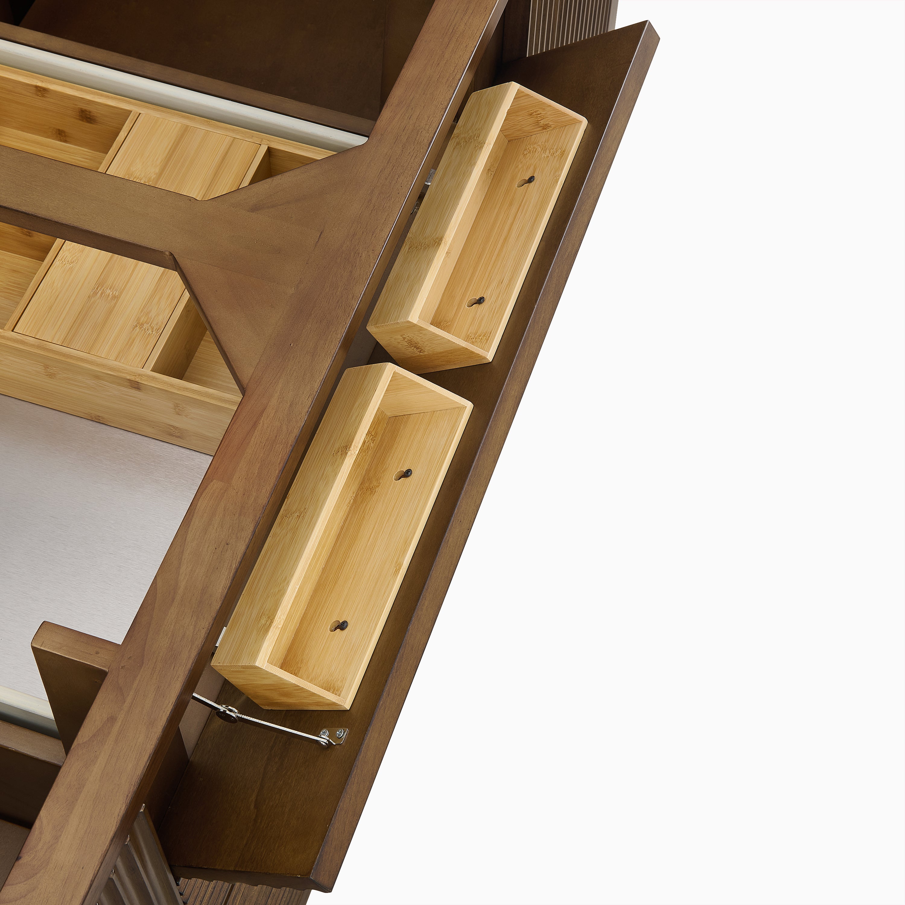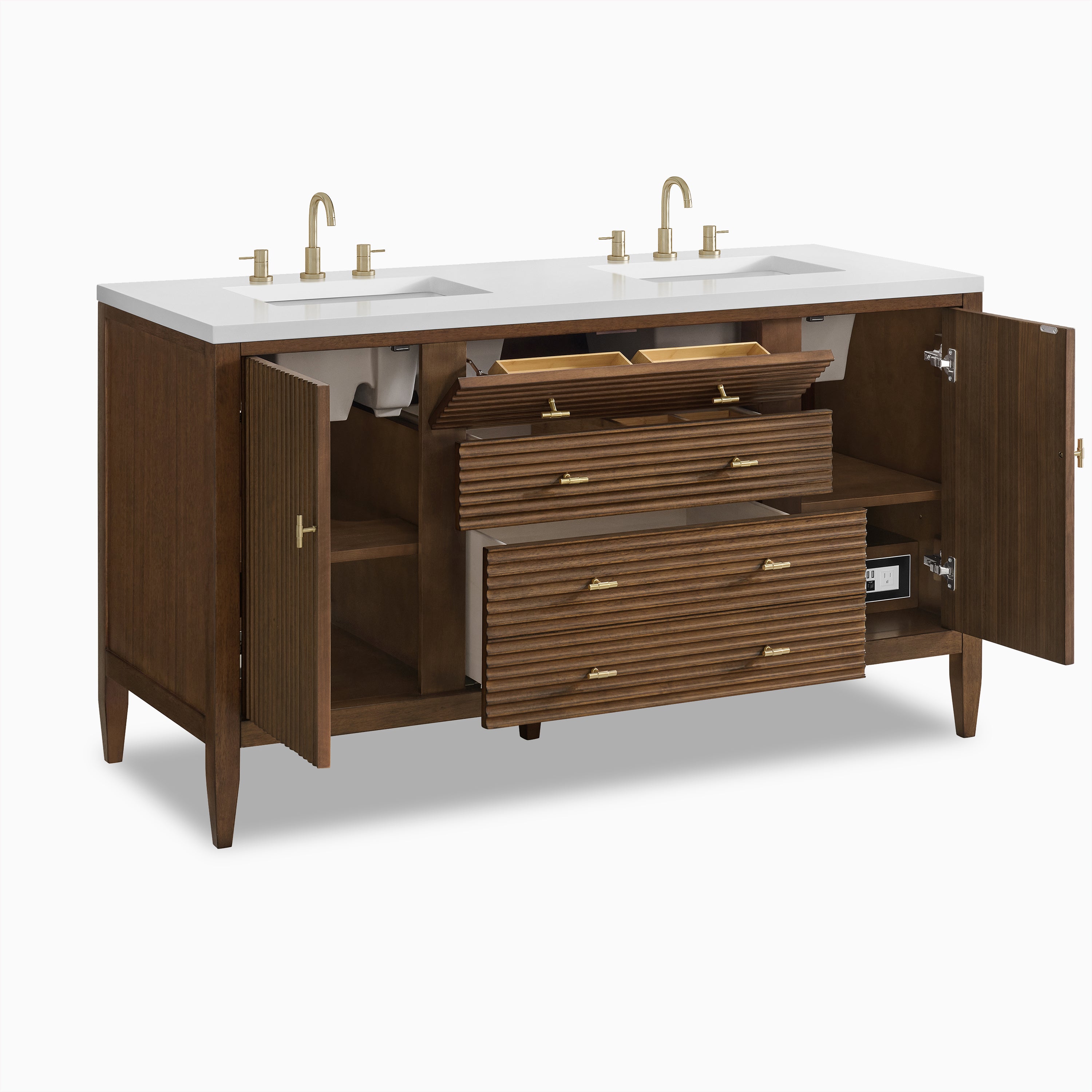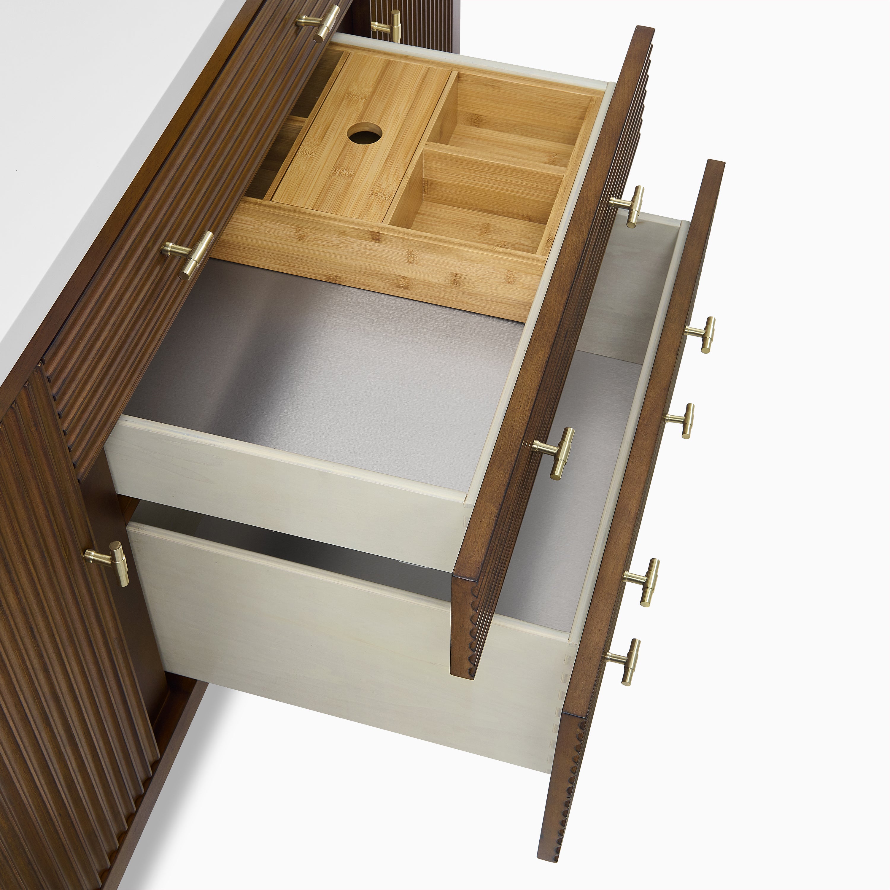 Inspired by mid-century design, our Sasha 60" Double Vanity in Mid-Century Walnut with 3 cm White Zeus Quartz Top features elegant fluted details that intersect perpendicularly across the warm, earth-toned piece. Behind the clean-lined facade is a thoughtful interior: two paneled doors that open to a spacious shelf, a built-in USB and power outlet tucked neatly within, and a tip-out and 2 traditional central drawers, making room for a removable bamboo organizer and the practicalities of modern routines.