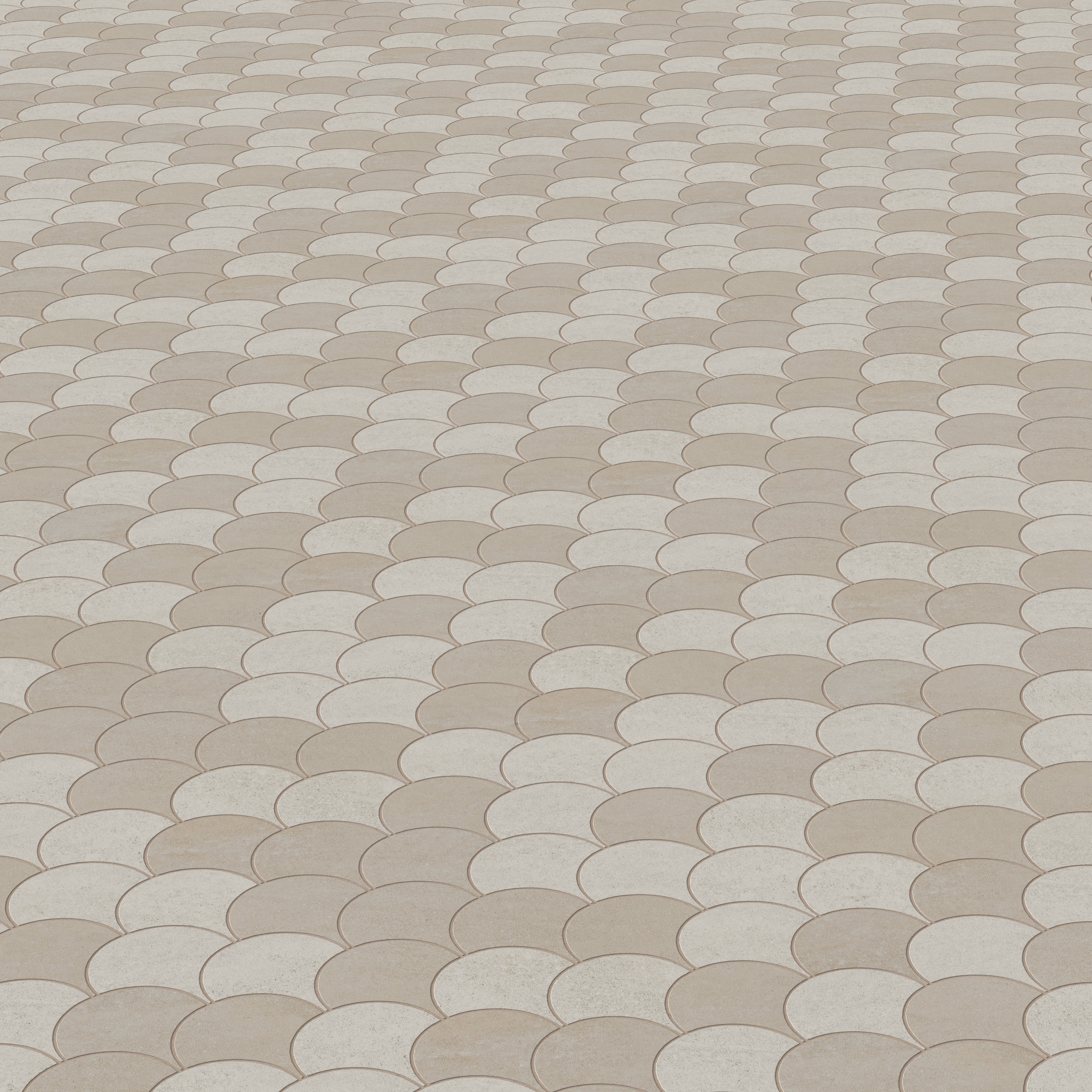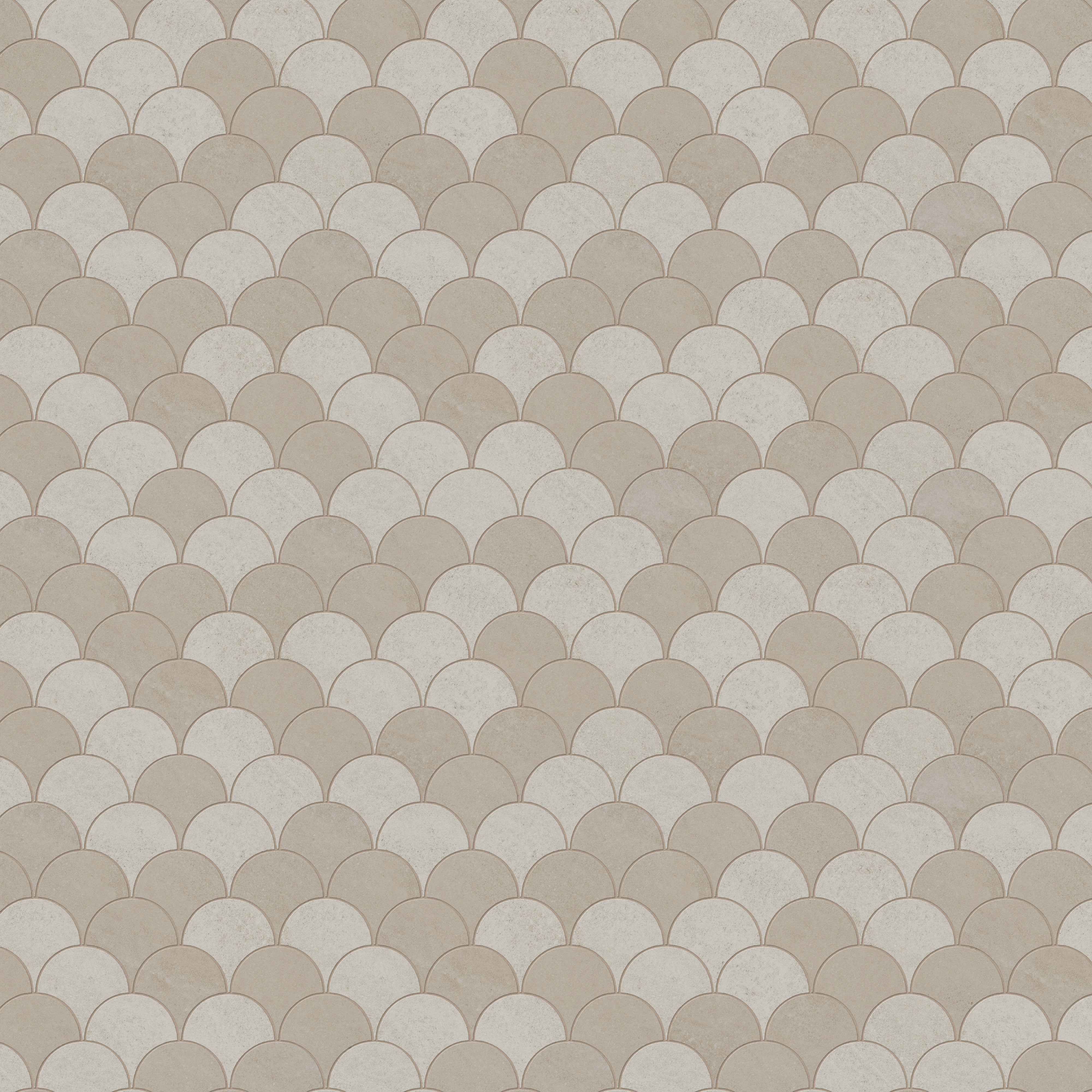 Our Shea 13.7x14.5 Matte Porcelain Wave Mosaic Tile in Warm Blend speaks to those who find elegance in the timeless character of earth-born materials. Its flowing fish-scale like format draws light gently across a blend of sunlit beige and warm mist gray surfaces, where a smooth finish brings the serene beauty of natural stone to life — warm to the eye, grounded to the touch.