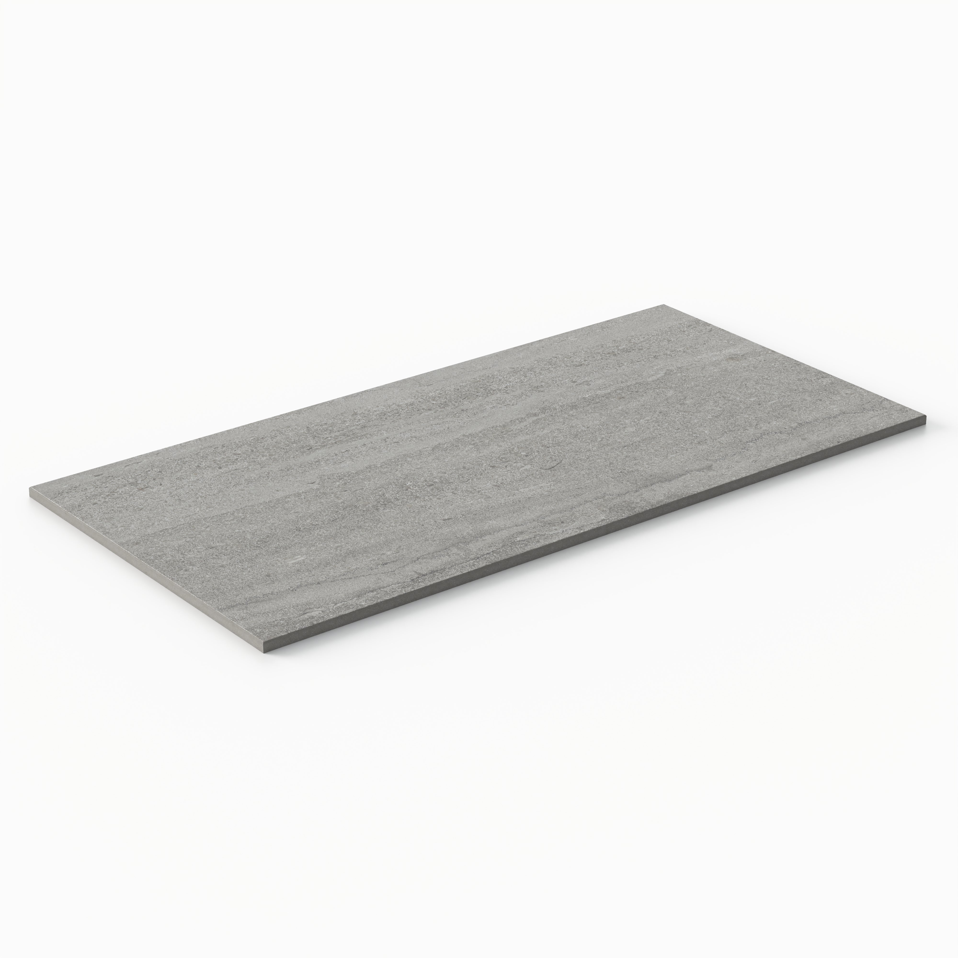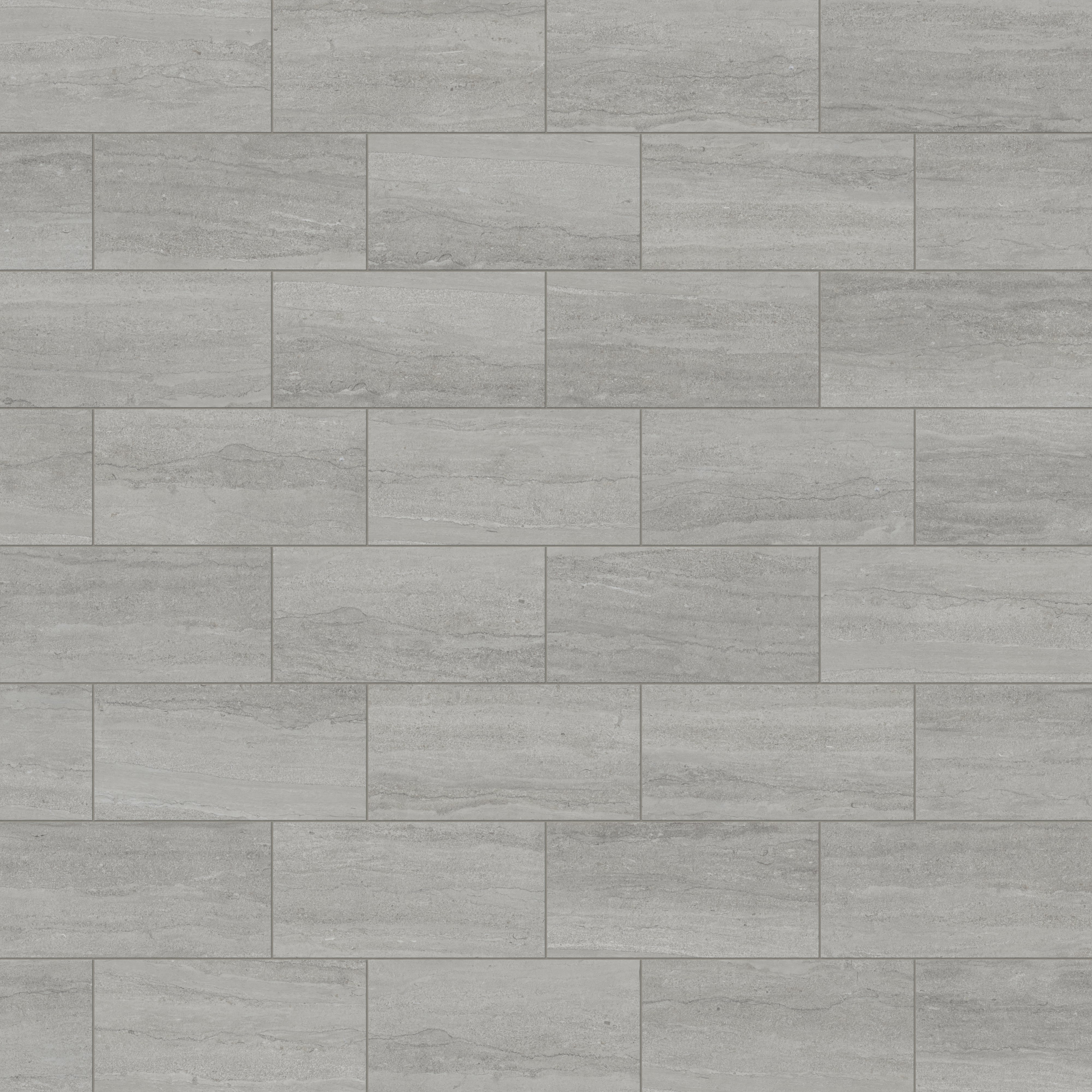 Our Tatum 12x24 Matte Porcelain Tile in Vein-Cut Ash captures the essence of travertine with its subtle mineral layering, gently flowing horizontal striations, and soft tonal shifts of gray in a classic rectangular format. The non-reflective finish adds subtle richness to its weathered, organically pitted appearance, perfect for nature-inspired spaces.