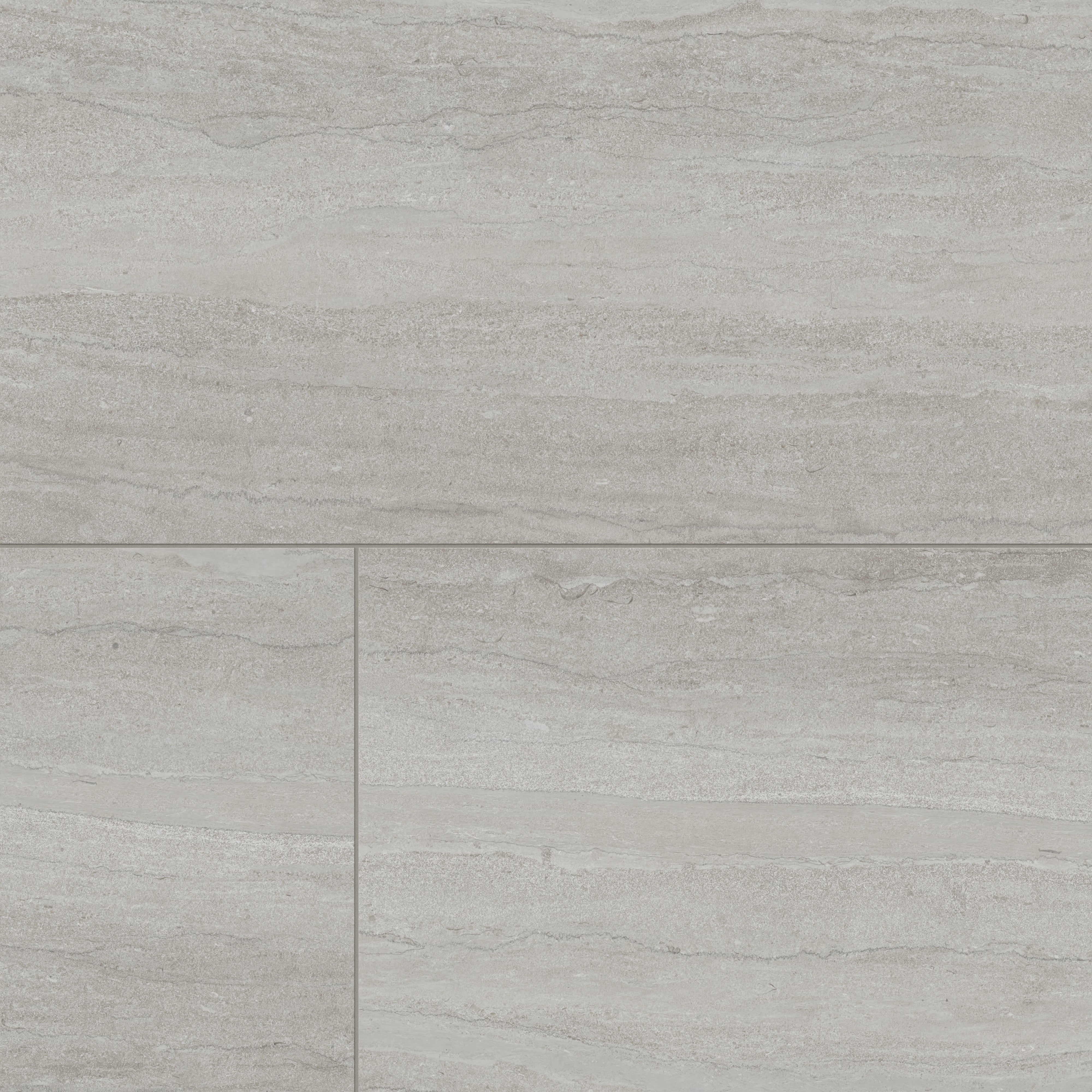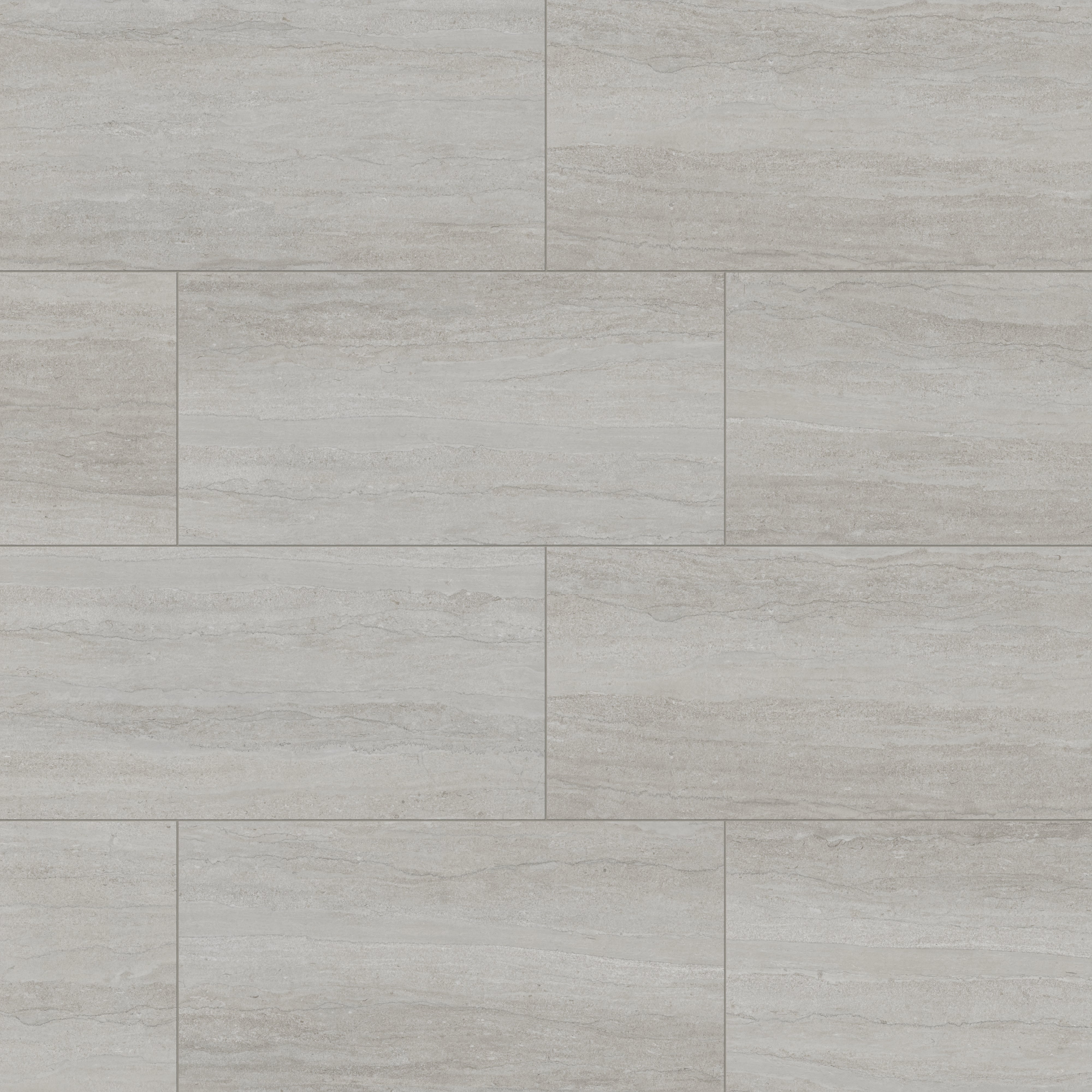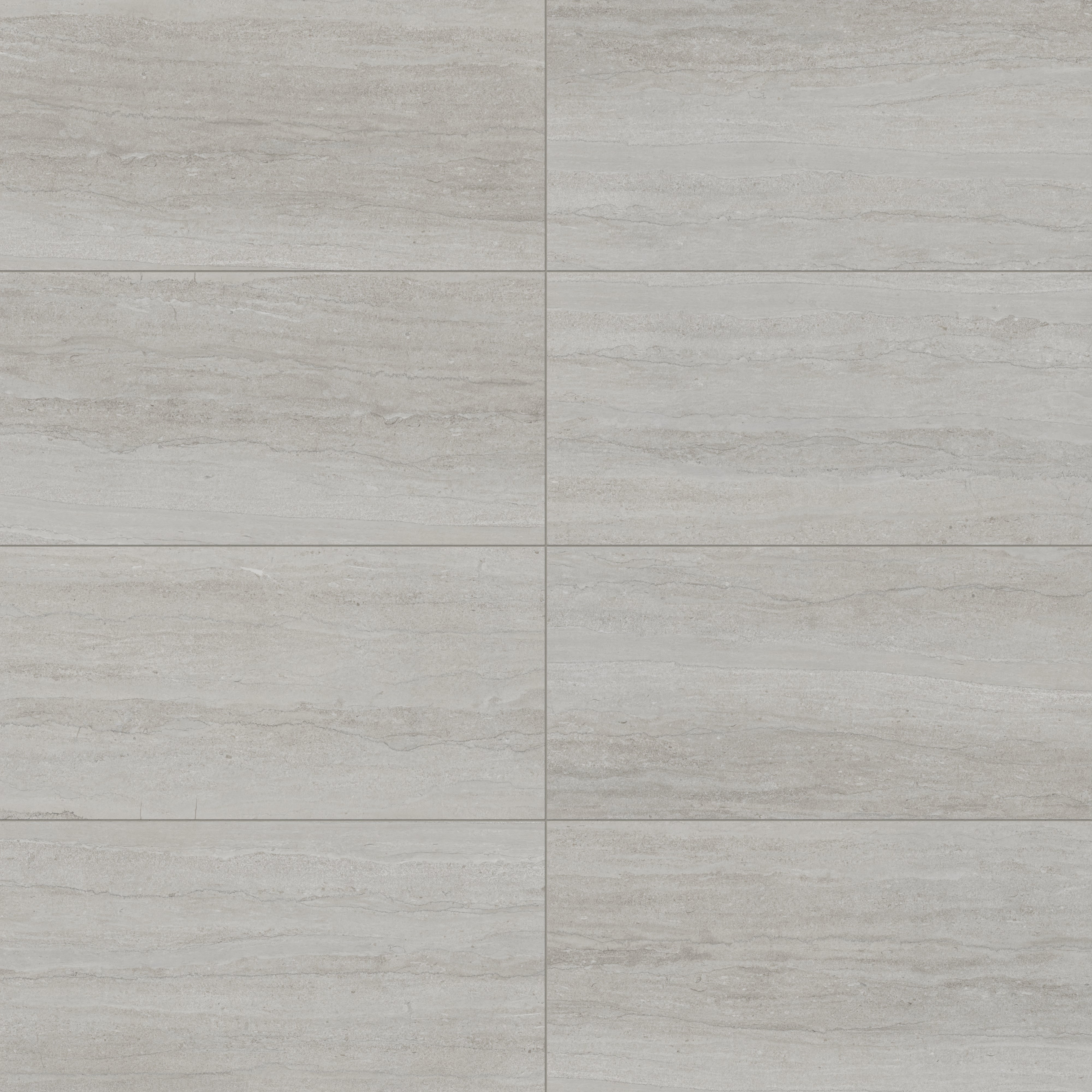 Our Tatum 24x48 Matte Porcelain Tile in Vein-Cut Dune captures the essence of travertine with its subtle mineral layering, gently flowing horizontal striations, and soft tonal shifts of earthy gray in a large, extended rectangular format. The non-reflective finish adds subtle richness to its weathered, organically pitted appearance, perfect for nature-inspired spaces.