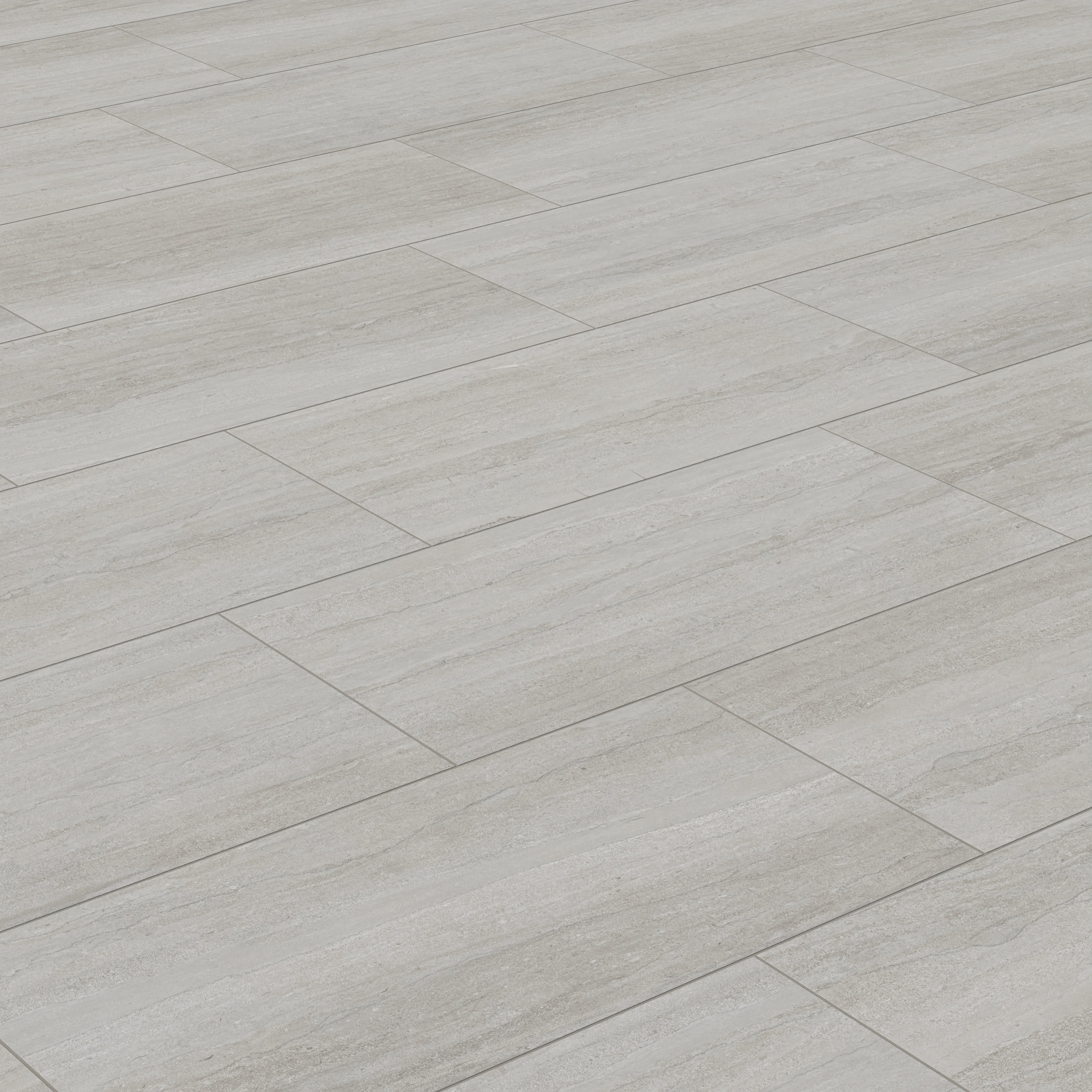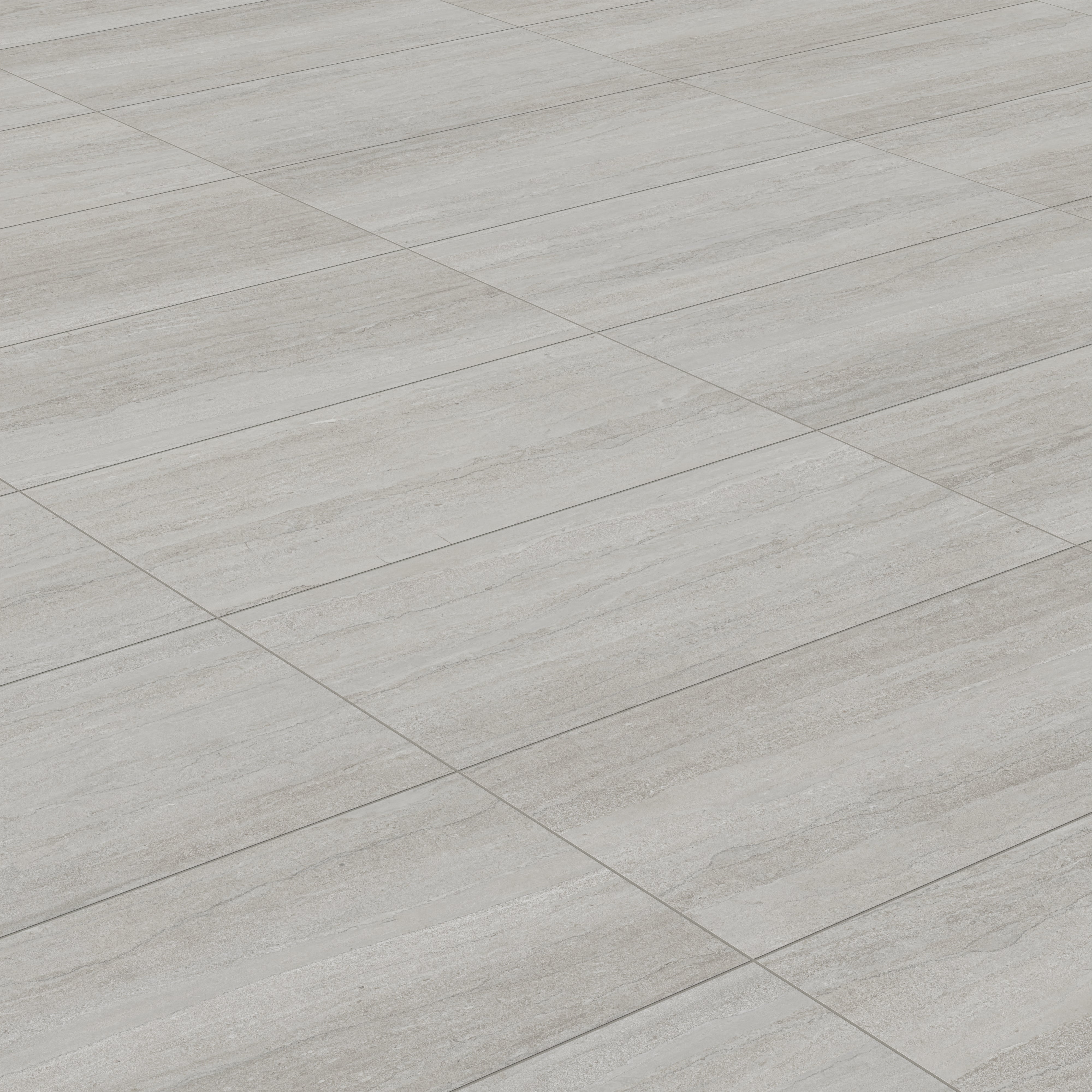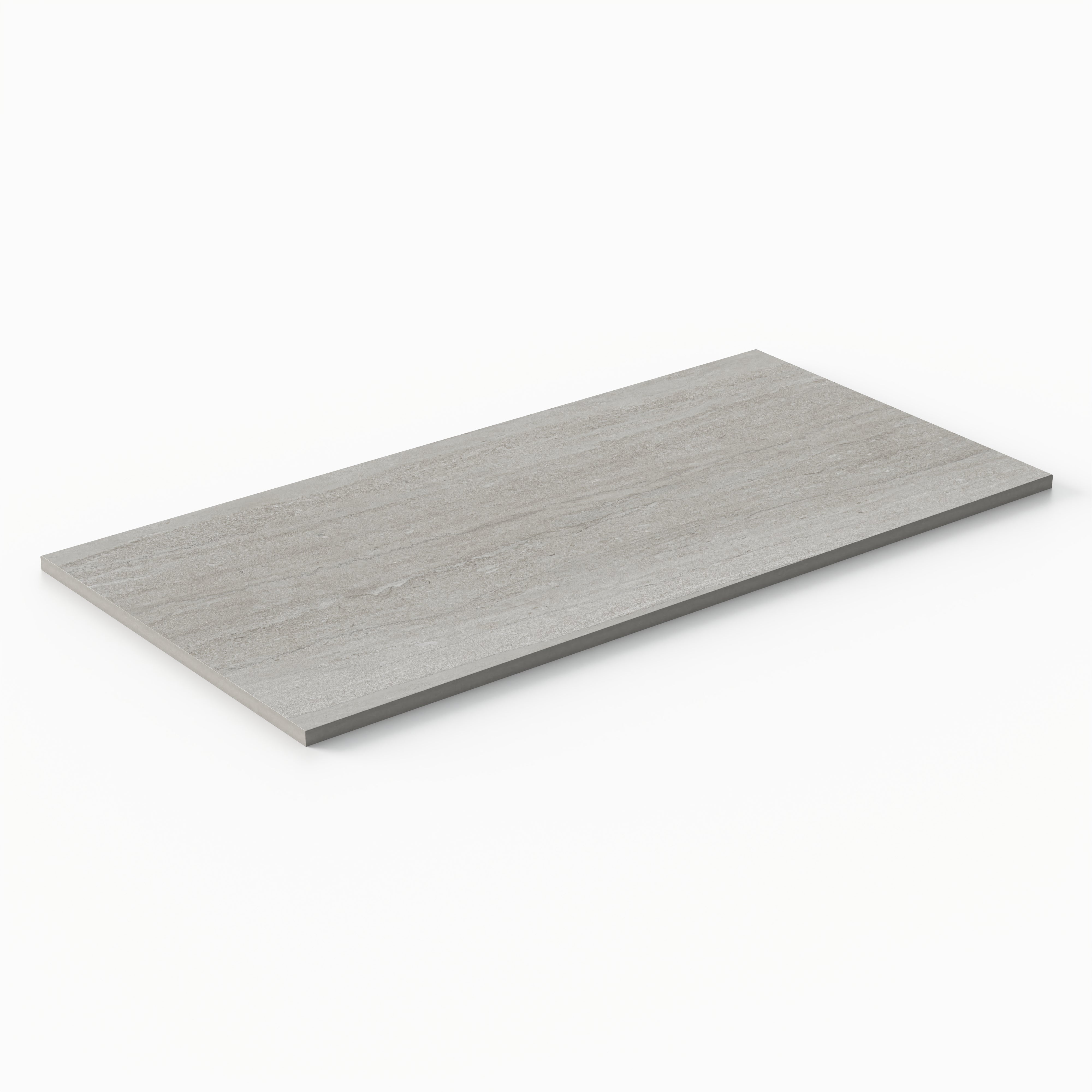 Our Tatum 24x48 Matte Porcelain Tile in Vein-Cut Dune captures the essence of travertine with its subtle mineral layering, gently flowing horizontal striations, and soft tonal shifts of earthy gray in a large, extended rectangular format. The non-reflective finish adds subtle richness to its weathered, organically pitted appearance, perfect for nature-inspired spaces.