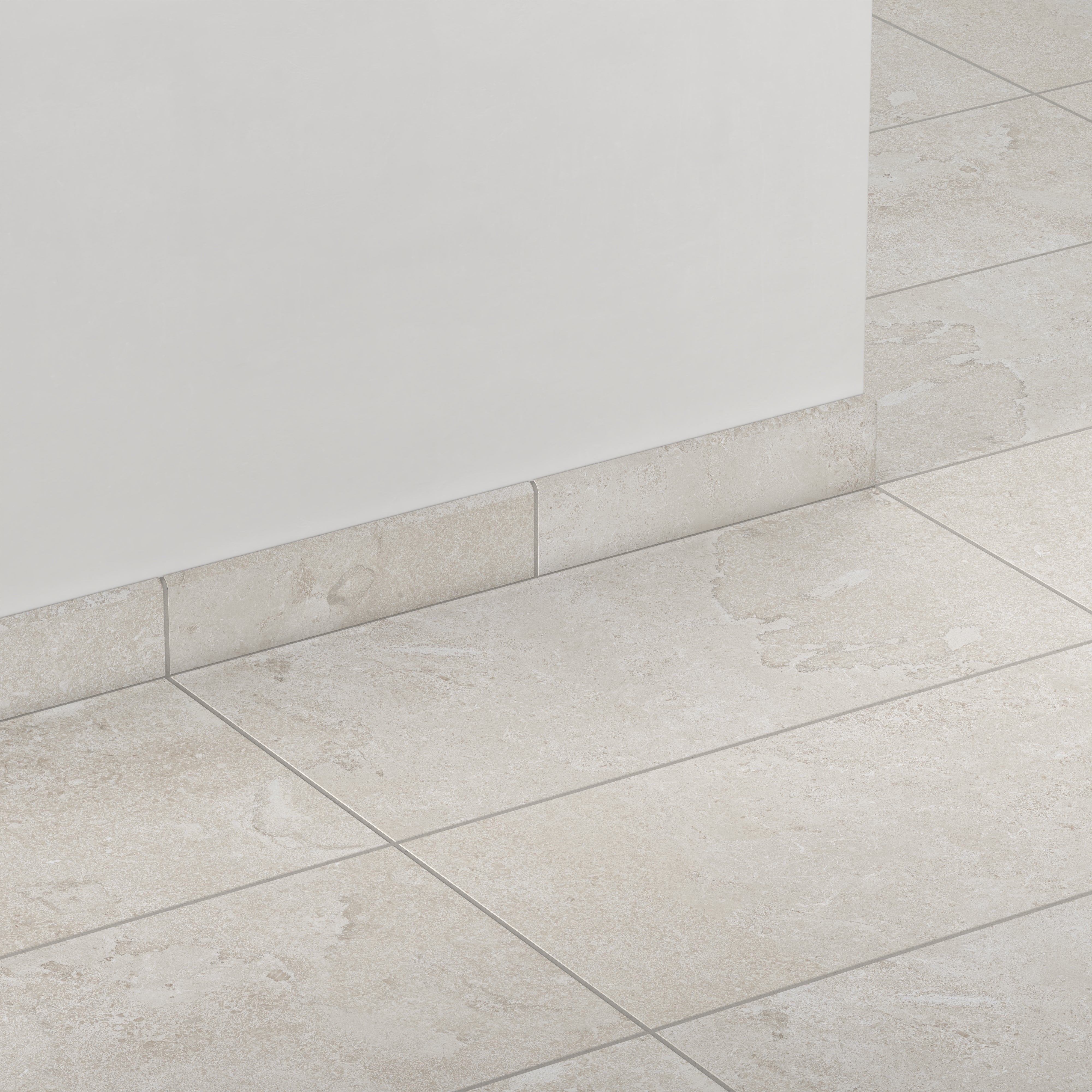 Designed to complement its travertine-inspired field tiles, our Tatum 3x12 Matte Porcelain Bullnose Tile in Cross-Cut Sand showcases the same soft tonal shifts of beige, seamlessly finishing edges, corners, and shower surrounds with its cloudlike pattern visually etched in a smooth, non-reflective surface.