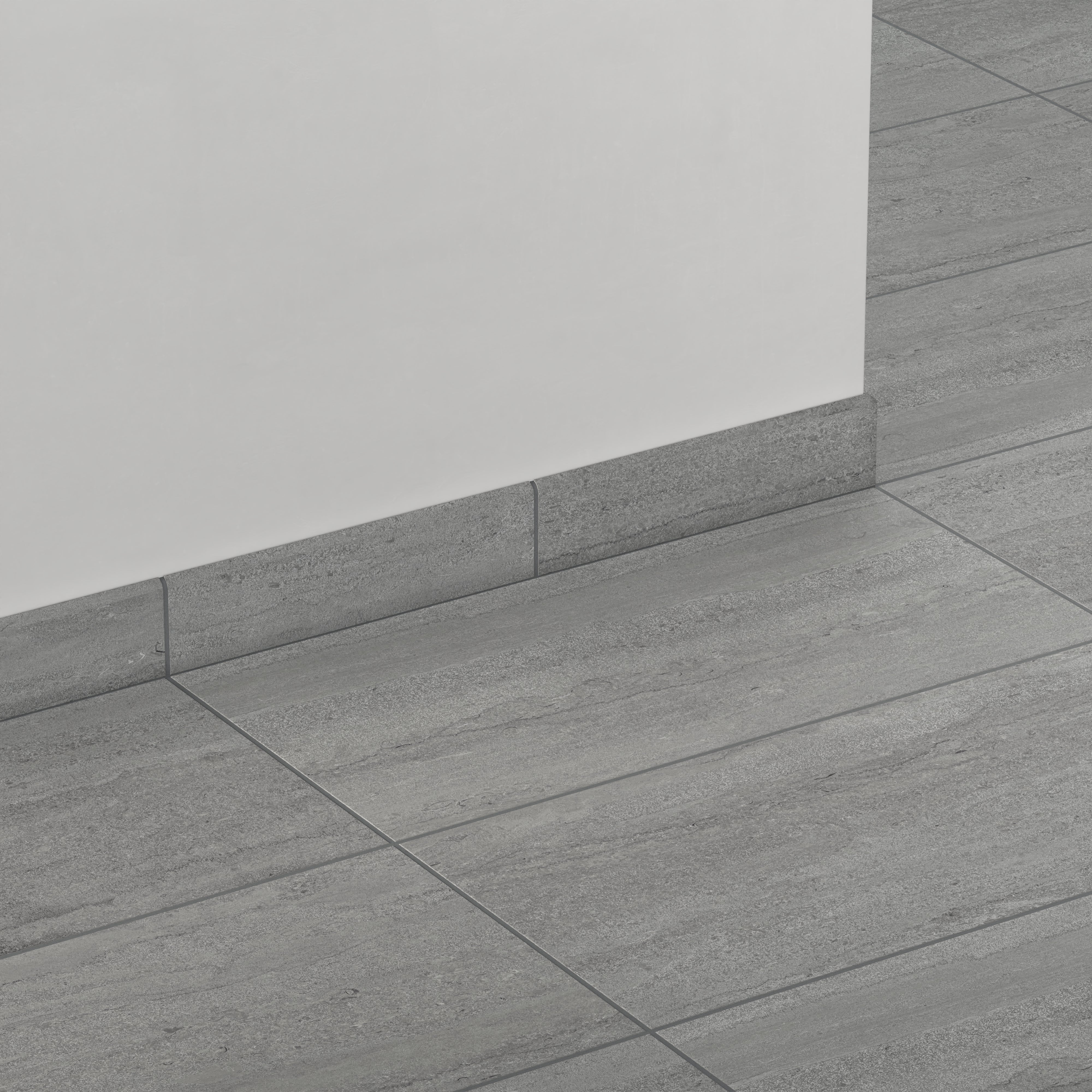 Designed to complement its travertine-inspired field tiles, our Tatum 3x12 Matte Porcelain Bullnose Tile in Vein-Cut Pewter showcases the same soft tonal shifts of dark gray, seamlessly finishing edges, corners, and shower surrounds with its linear veining visually etched in a smooth, non-reflective surface.