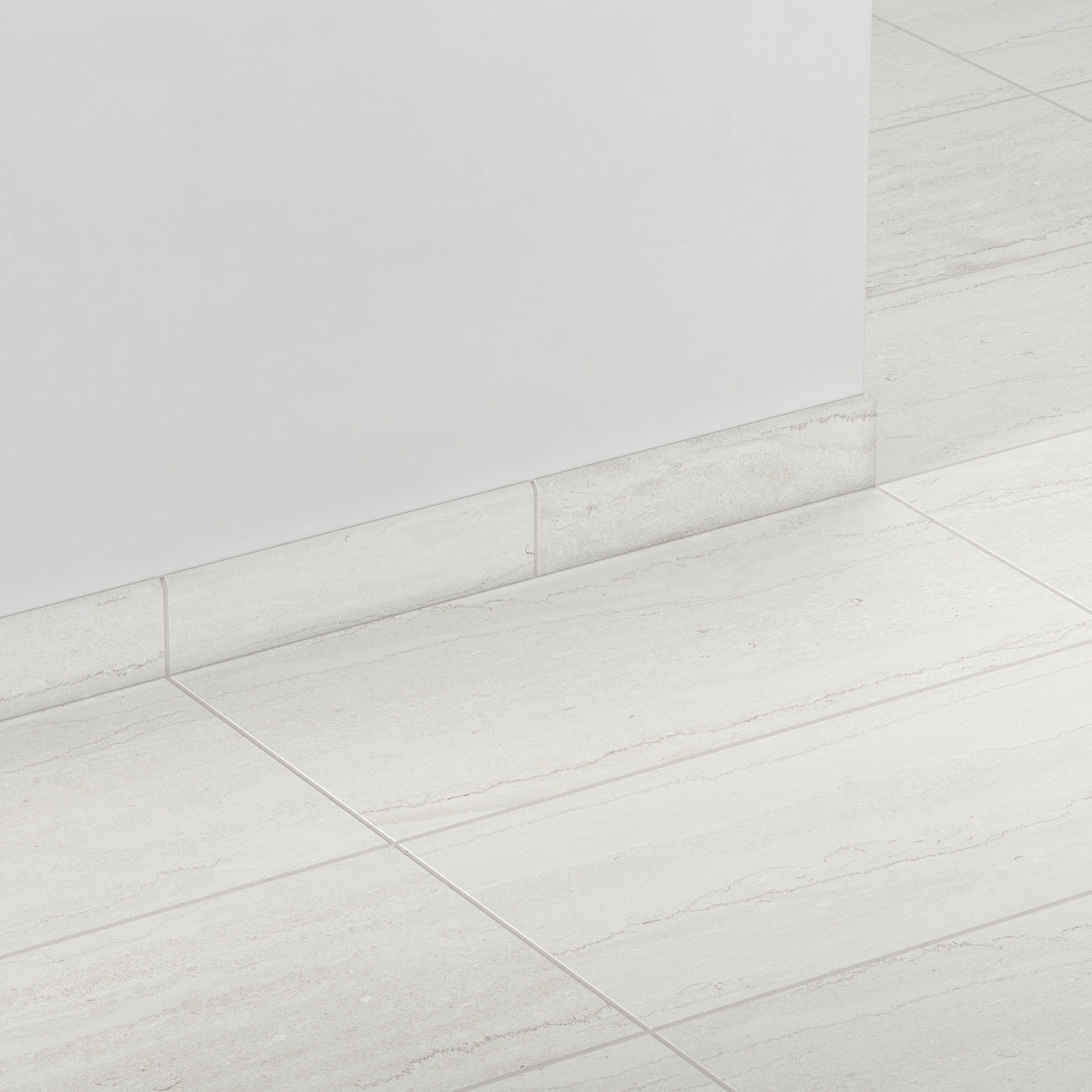 Designed to complement its travertine-inspired field tiles, our Tatum 3x12 Matte Porcelain Bullnose Tile in Vein-Cut Straw showcases the same soft tonal shifts of off-white, seamlessly finishing edges, corners, and shower surrounds with its linear veining visually etched in a smooth, non-reflective surface.