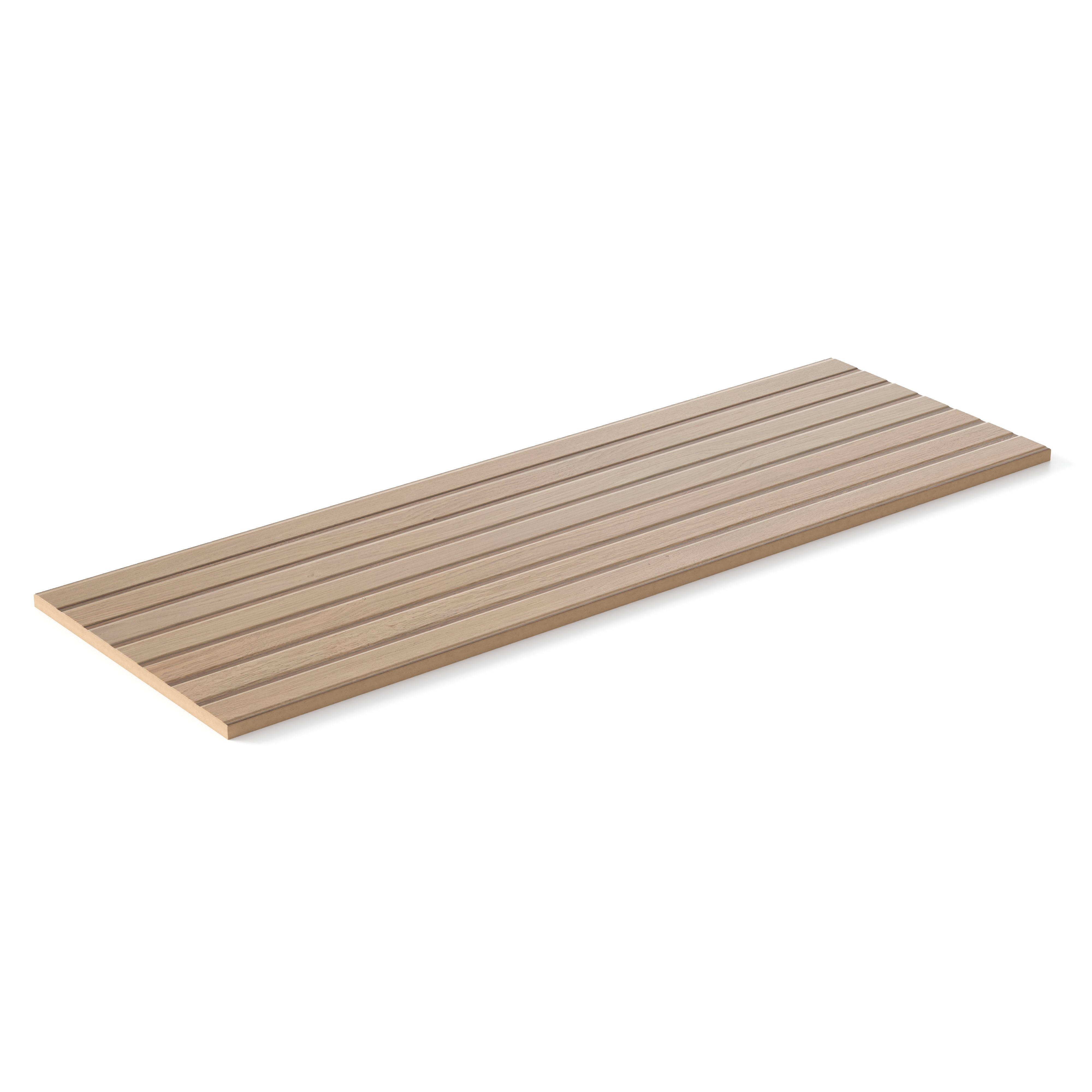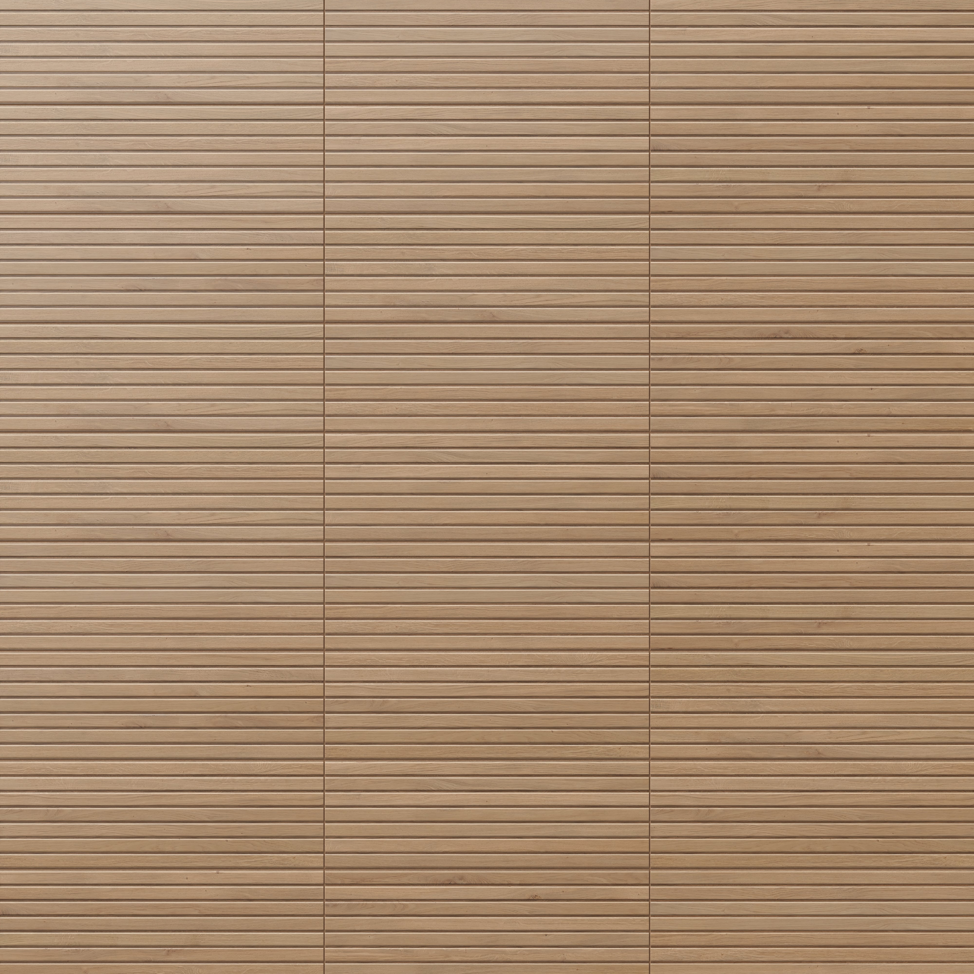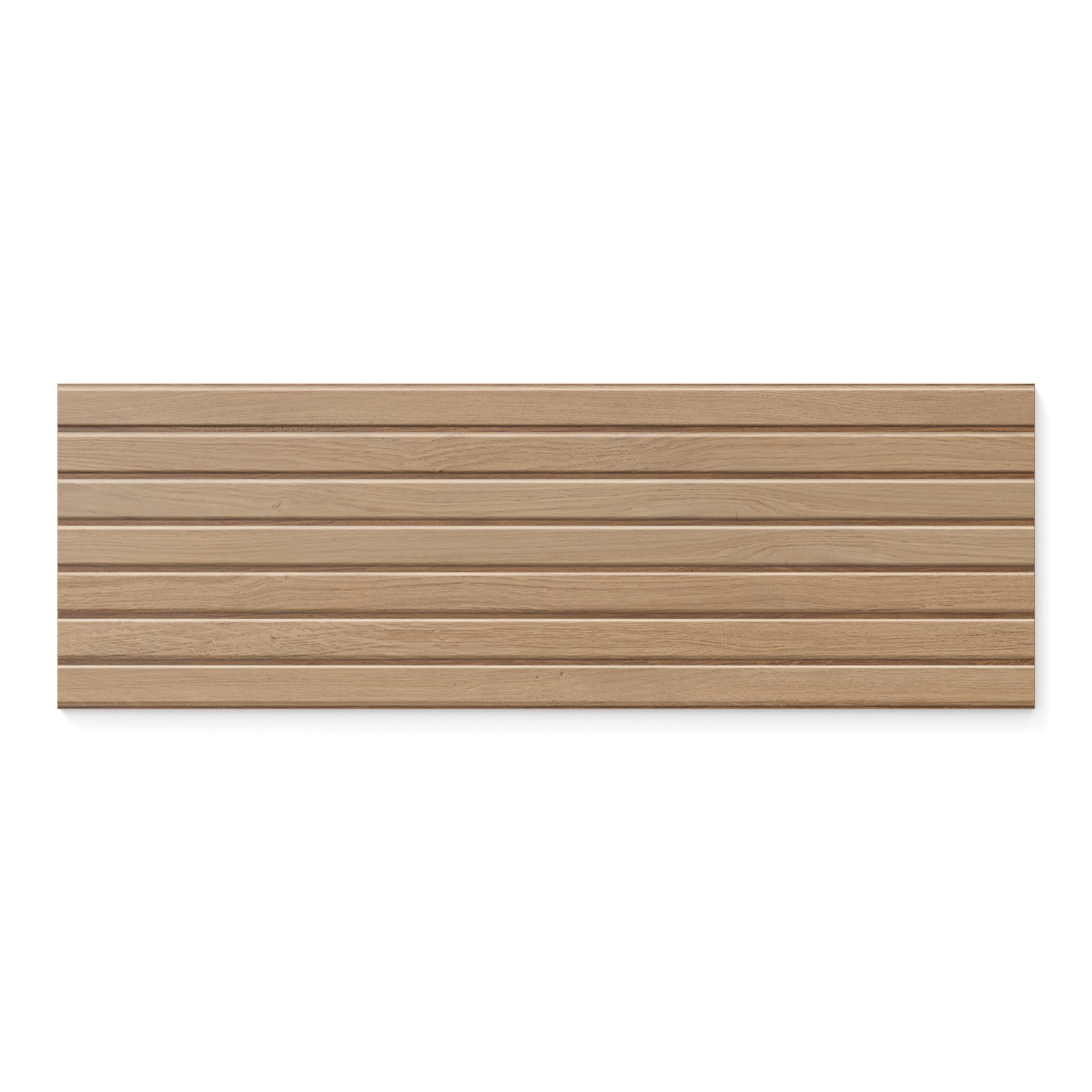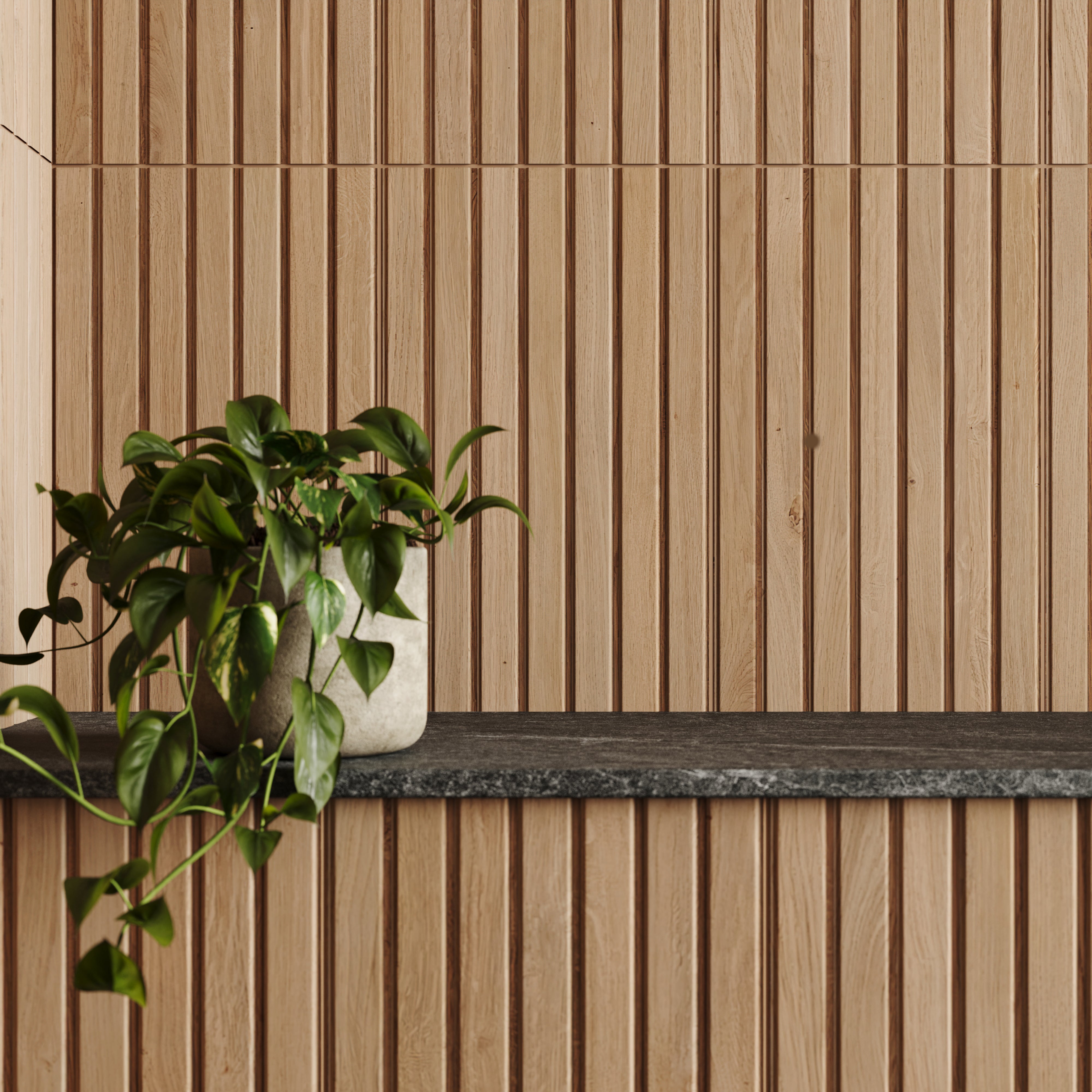 Our Zayne 12x36 Matte Ceramic Tile in Slat showcases a fluted design with elongated grooves, forming a continuous linear flow across its natural oak-toned surface. Its extended rectangular format enhances this composition, creating a visually engaging backdrop that can emphasize height or expand the sense of space.